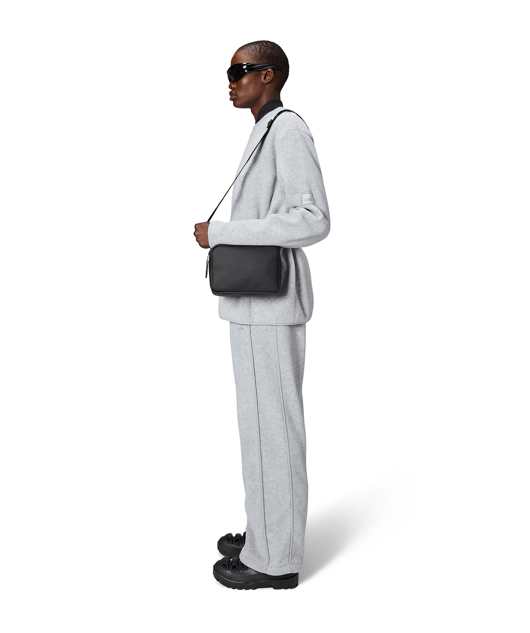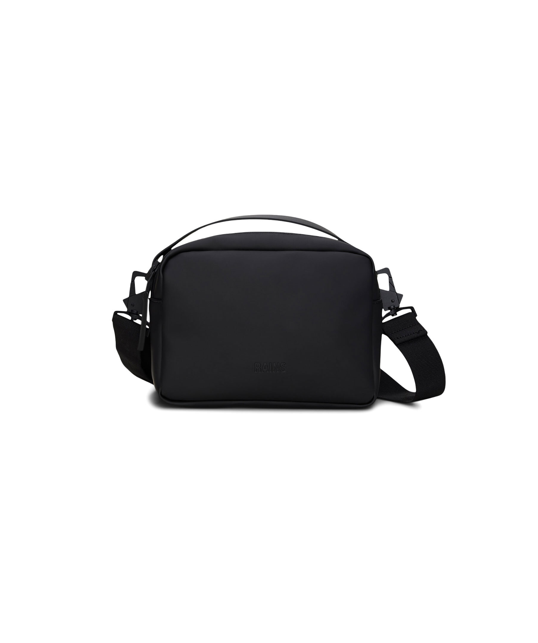 Svart Vattentät väska från Rains. kan bäras över axeln eller tvärs över kroppen. Huvudfacket stängs med dragkedja. Justerbar vävd axelrem med karbinhakar. Handtag i gummi. Embossad logotyp på väskans framsida. Väskans mått: H 16 x B 21 x D 8,5 cm. Väskan rymmer 3L.