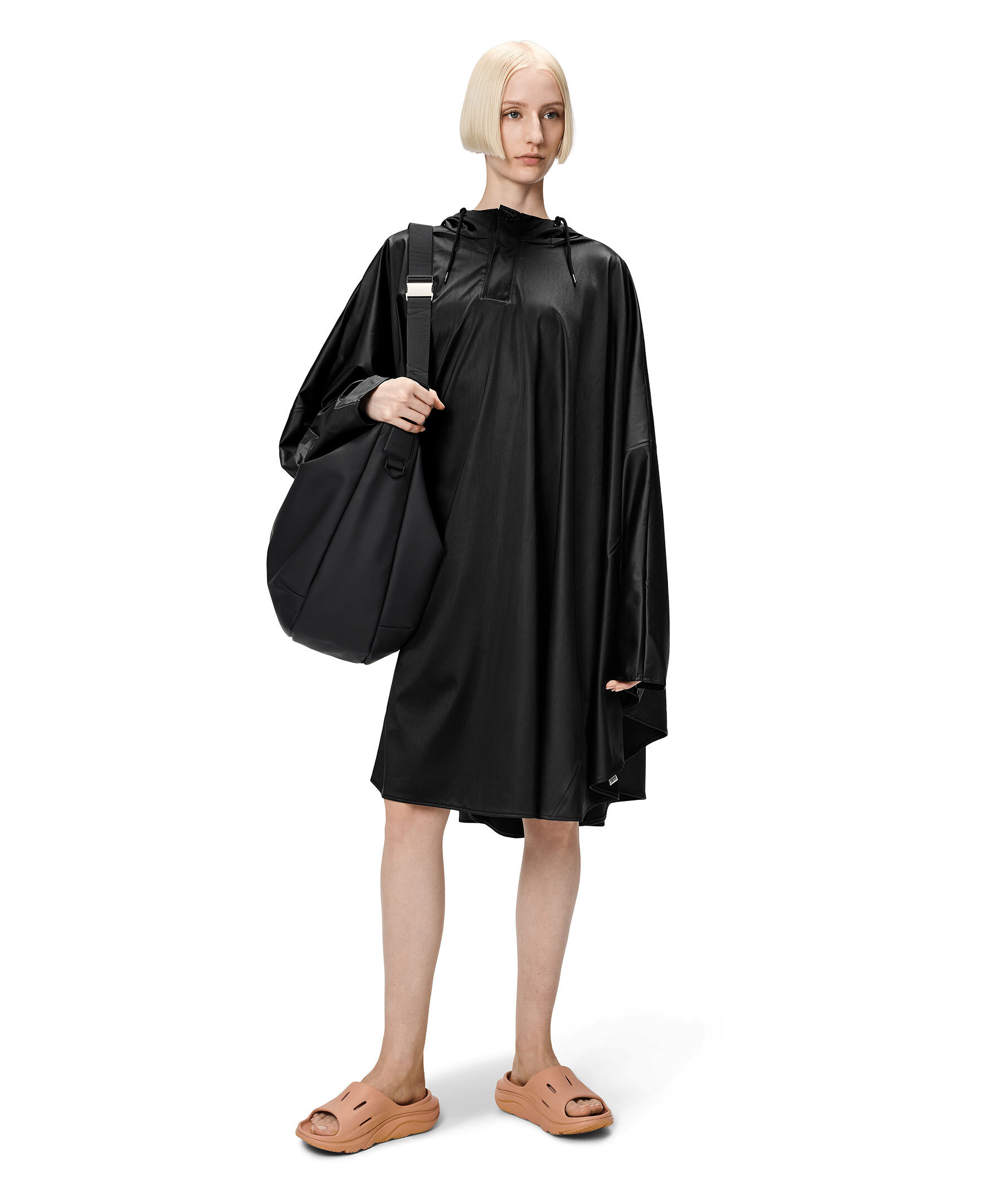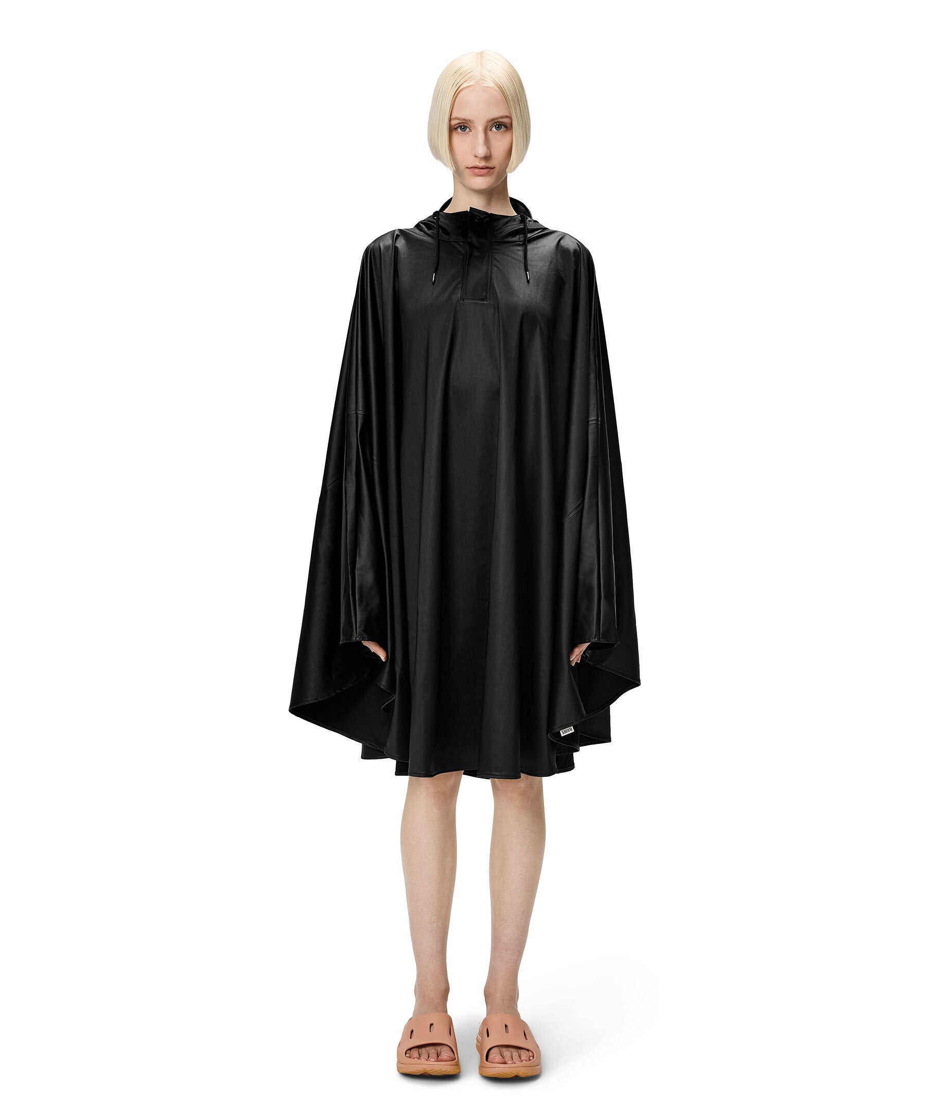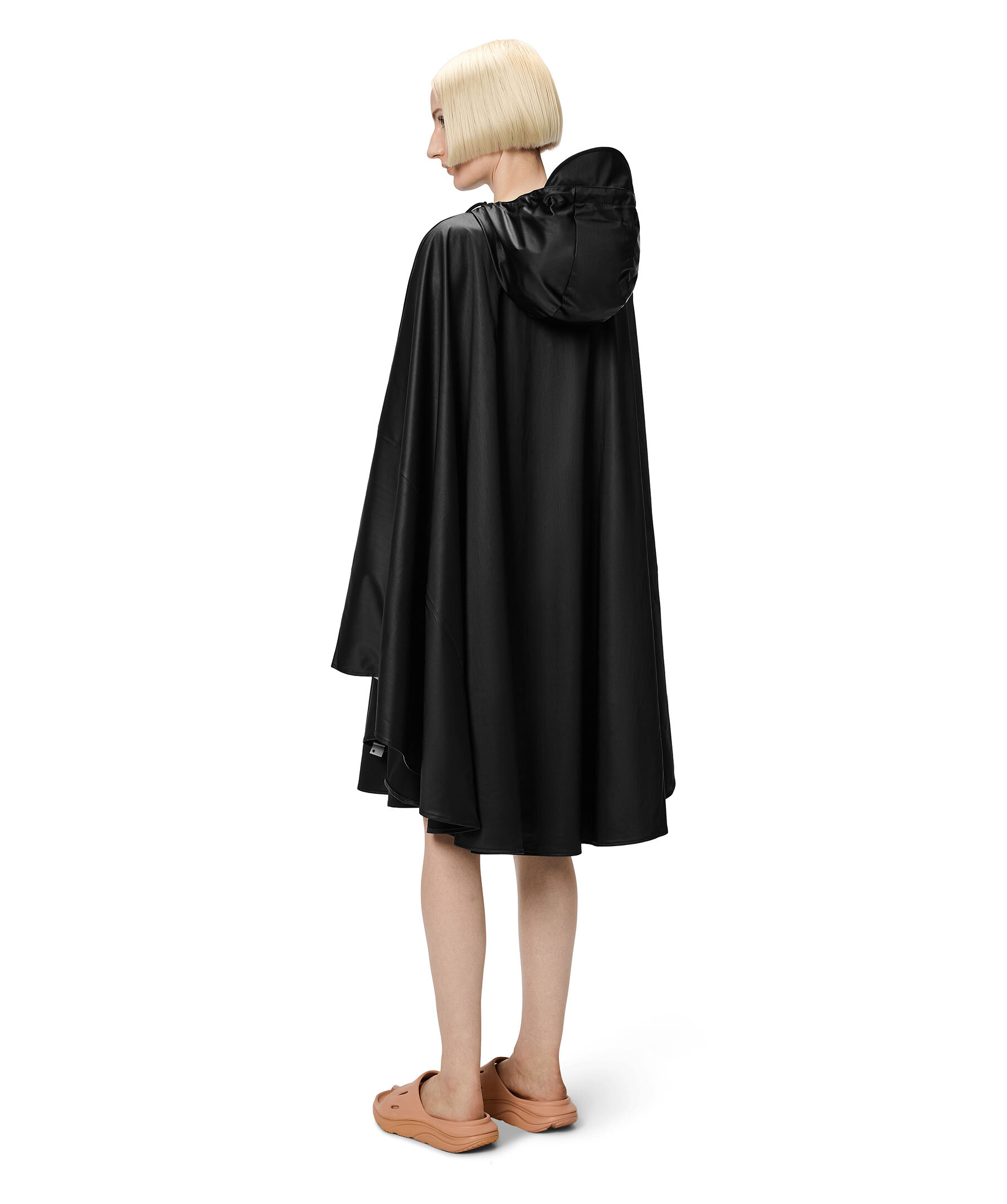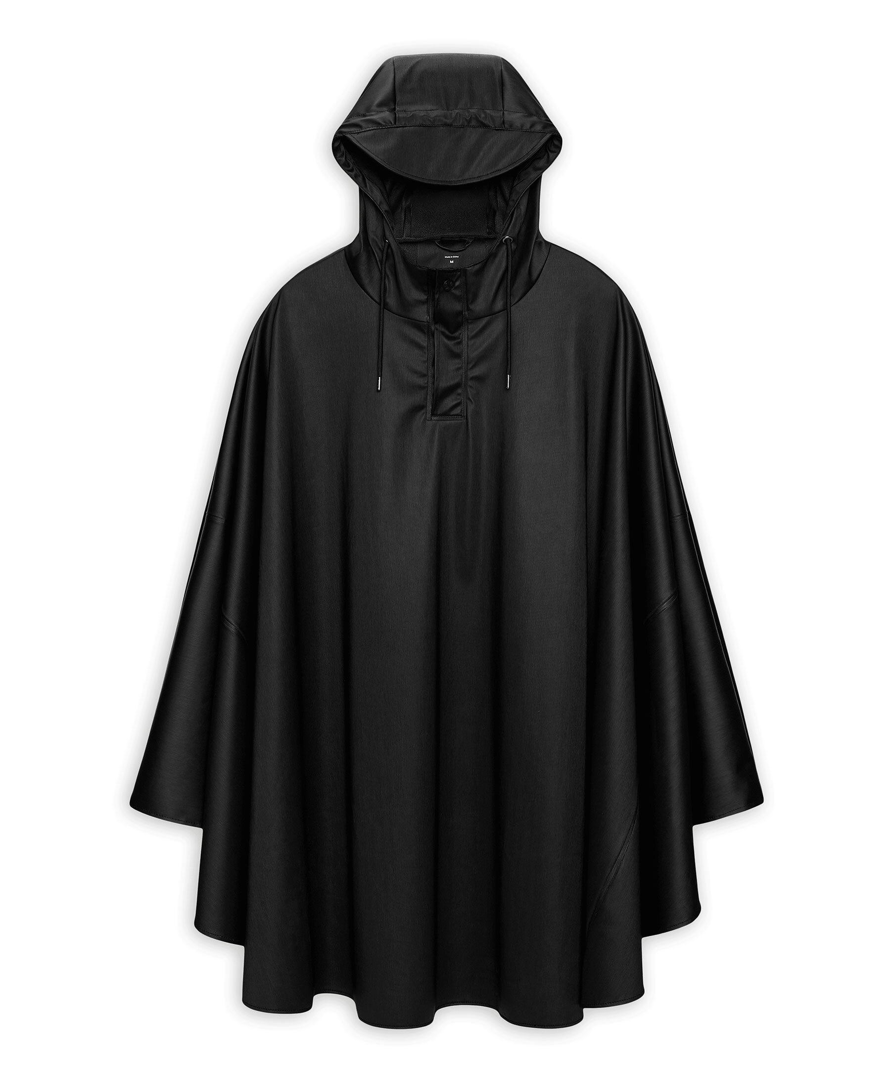 Svart cape med huva och subtil struktur från Rains. En modern version av den klassiska regnponchon, som modifierats för cyklister och en aktiv livsstil. Plaggets löst böljande silhuett har halv knappslå och tryckknappsfästning. Valfria ärmar kan skapas med ärmarnas tryckknappar. Tumhål garanterar en säker passform även under cykelpendlingen. Cape fulländas av Rains signaturhuva med dragsko och kepsbrätte. Cape tillverkas i en strukturerad version av Rains PU-signaturtyg med ultraljudsförseglade sömmar. Dess mjuka lättviktsfinish har ett snyggt fall.