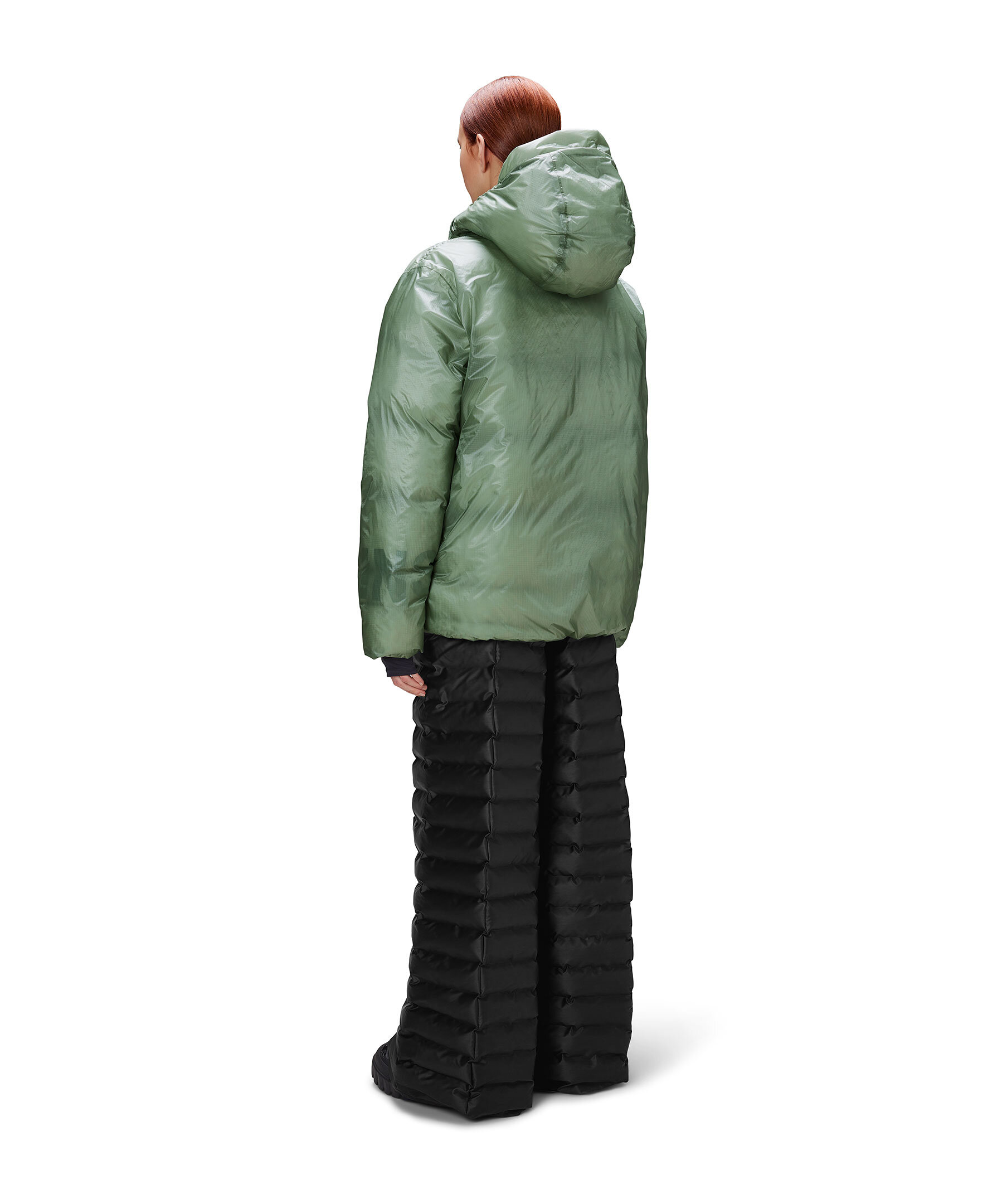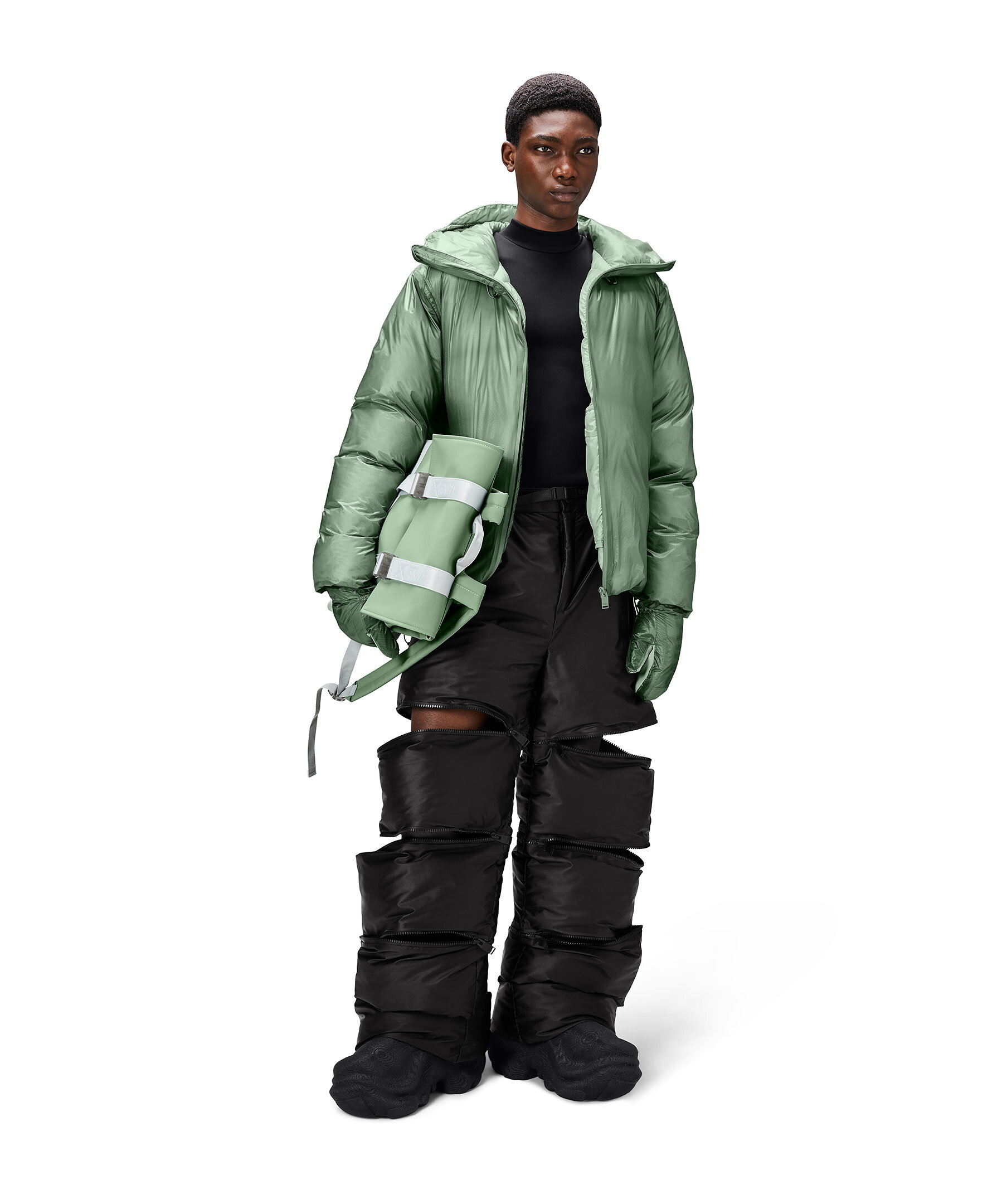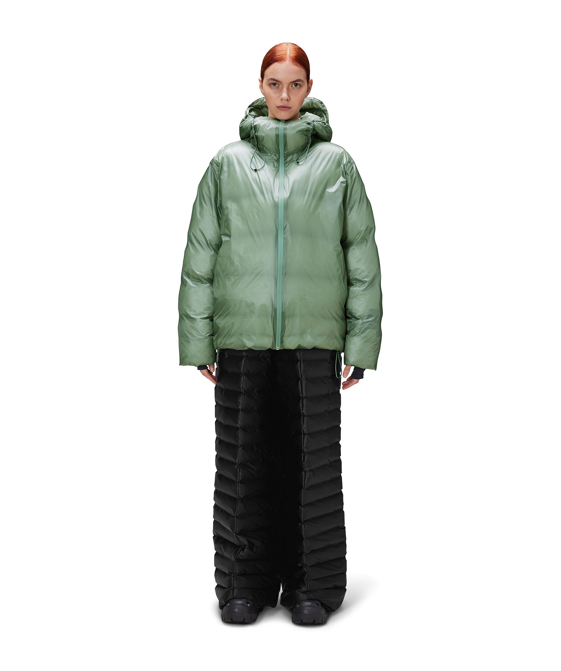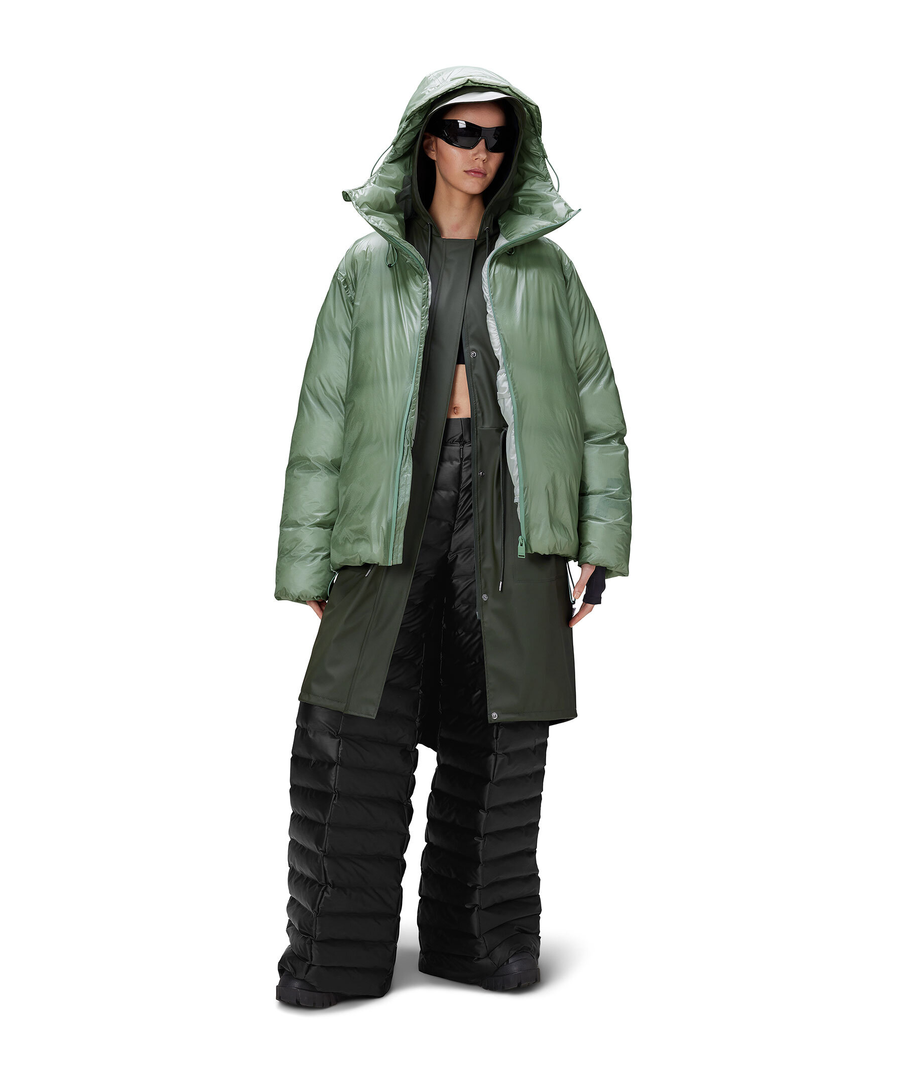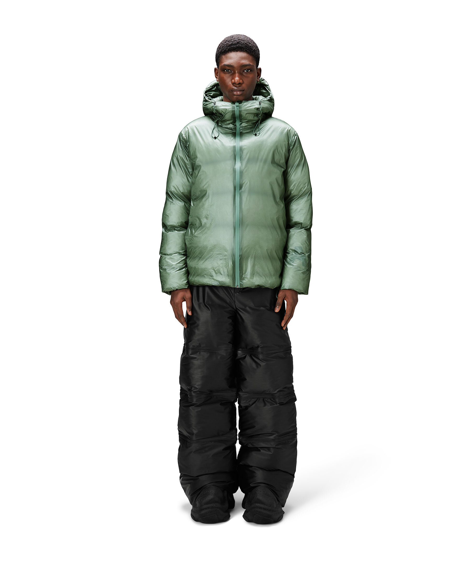 Grön puffer jacka från Rains. En vattentät vinterjacka med en lyxigt sportig estetik. För Kevo-serien svänger Rains på den klassiska Puffer-looken. På utsidan hittar du semi-transparent vattentät nylon med beläggning på baksidan och mjuk matt finish. Öppna jackan för att avslöja fjäderlösa pufferkamrar på insidan. Plagget är vattentätt och andas, vilket håller dig varm och bekväm i de kallaste vädren. Jackan har gummerat blixtlås, tejpade sömmar, dolda sidsömsfickor och dolda stormmanschetter i jersey. Silhuetten fulländas av en isolerad huva med ett flertal elastiska dragskor.