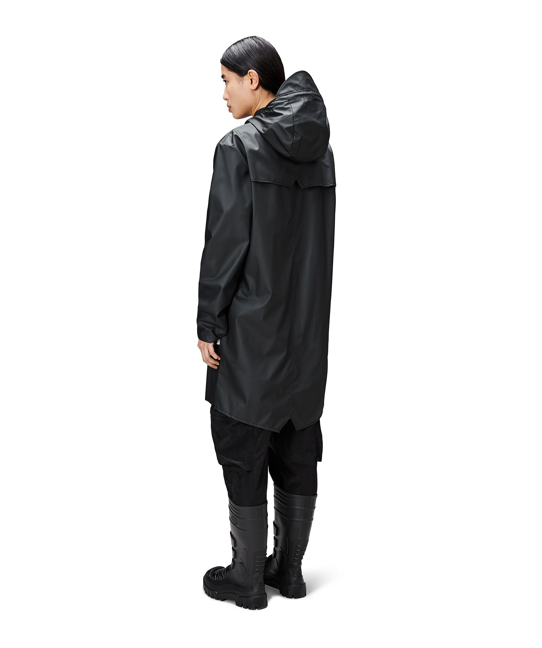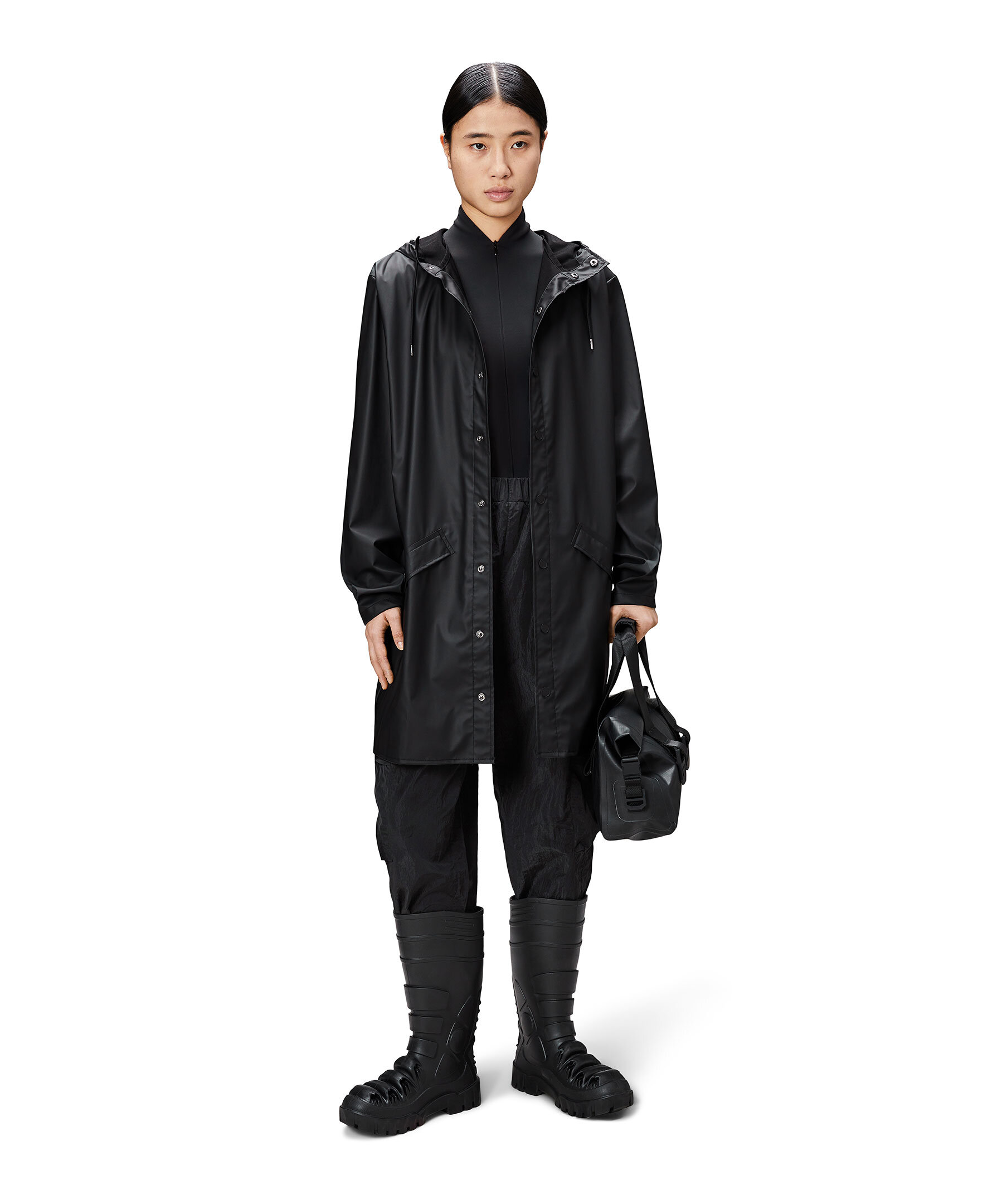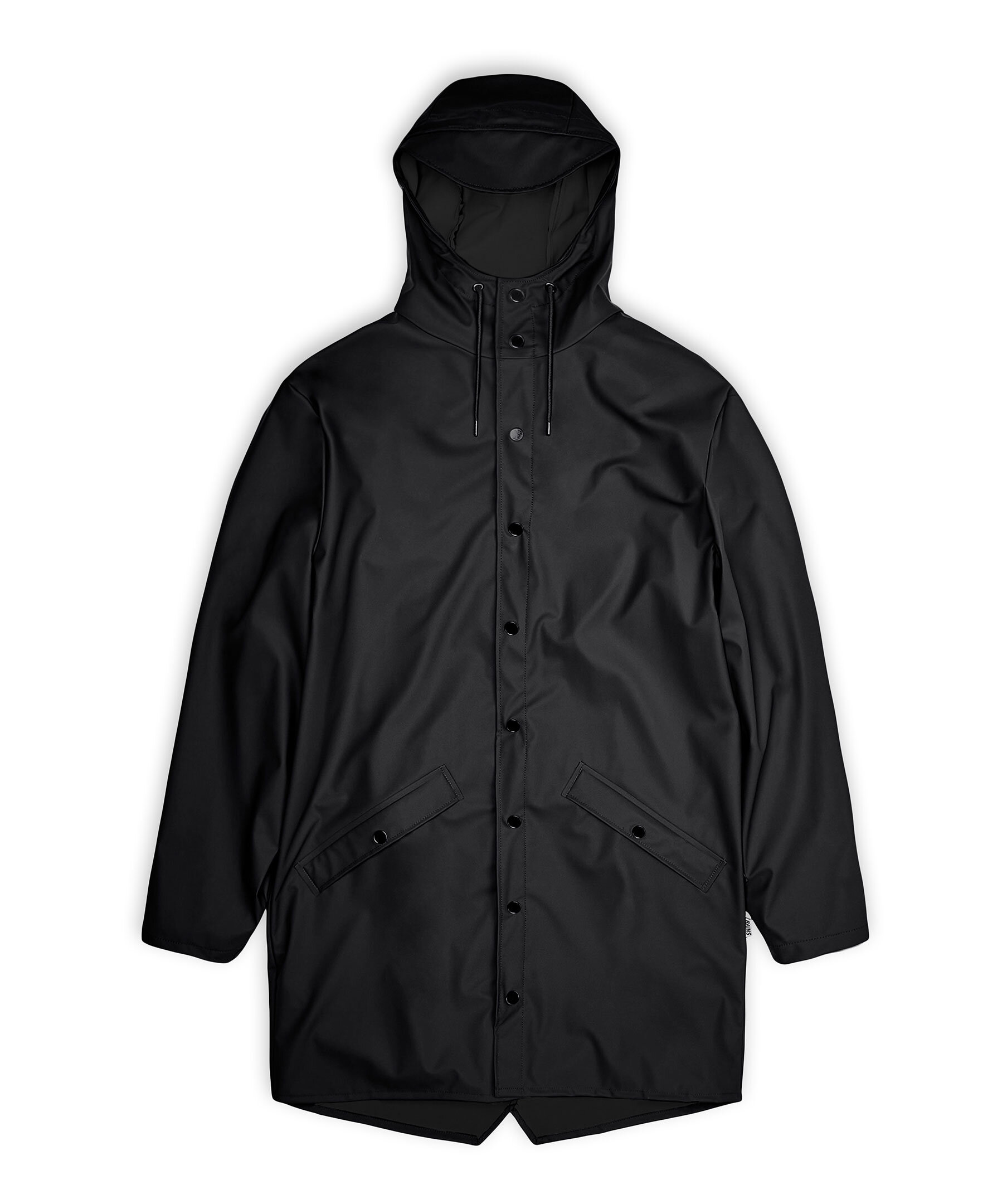 Svart lång regnjacka från Rains. Stängs framtill med tryckknappar. Luva med dragsko. Snedställda fickor som stängs med tryckknappar.
