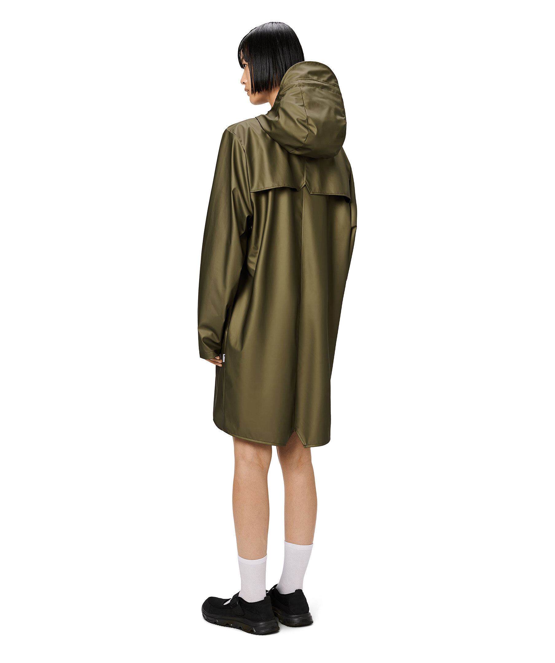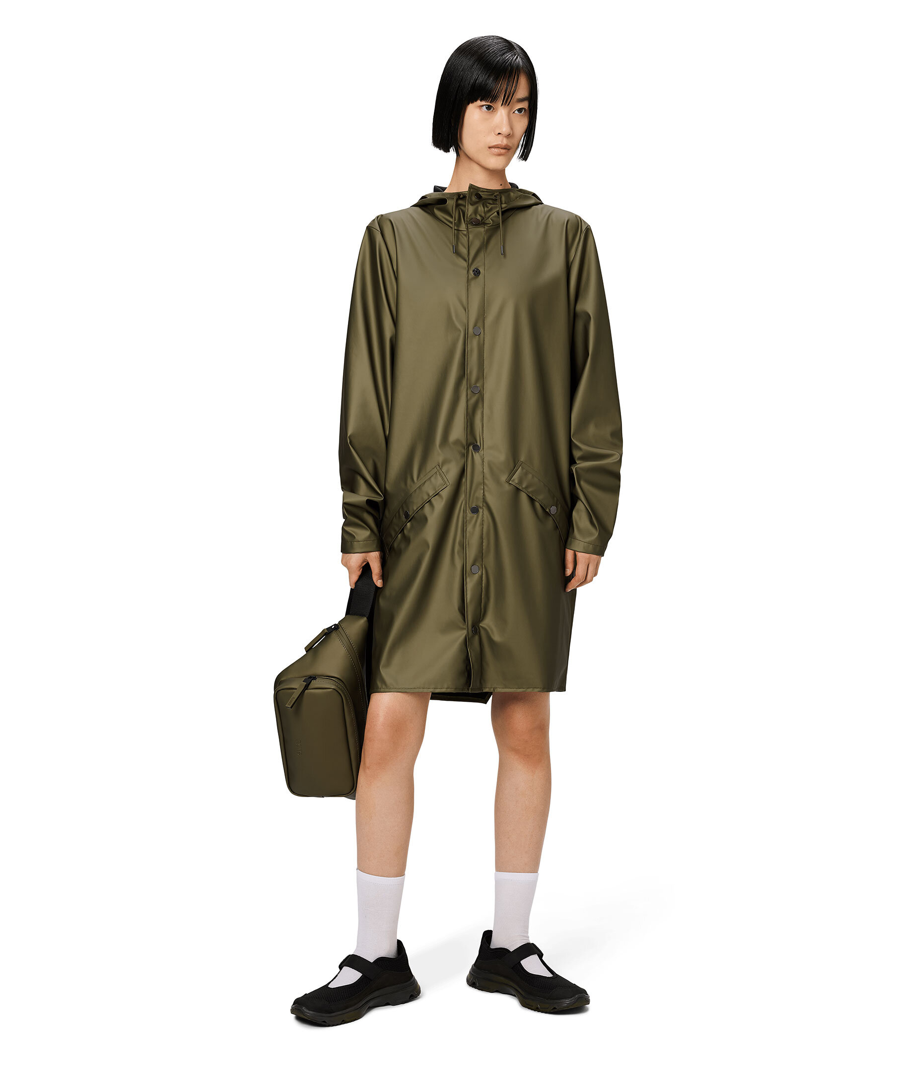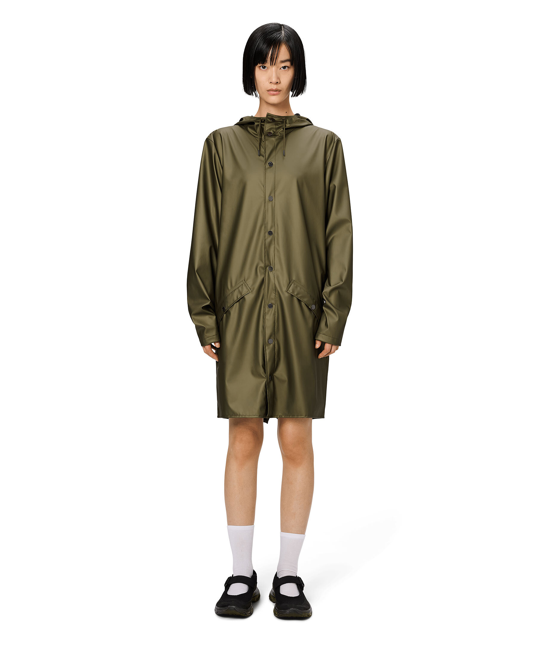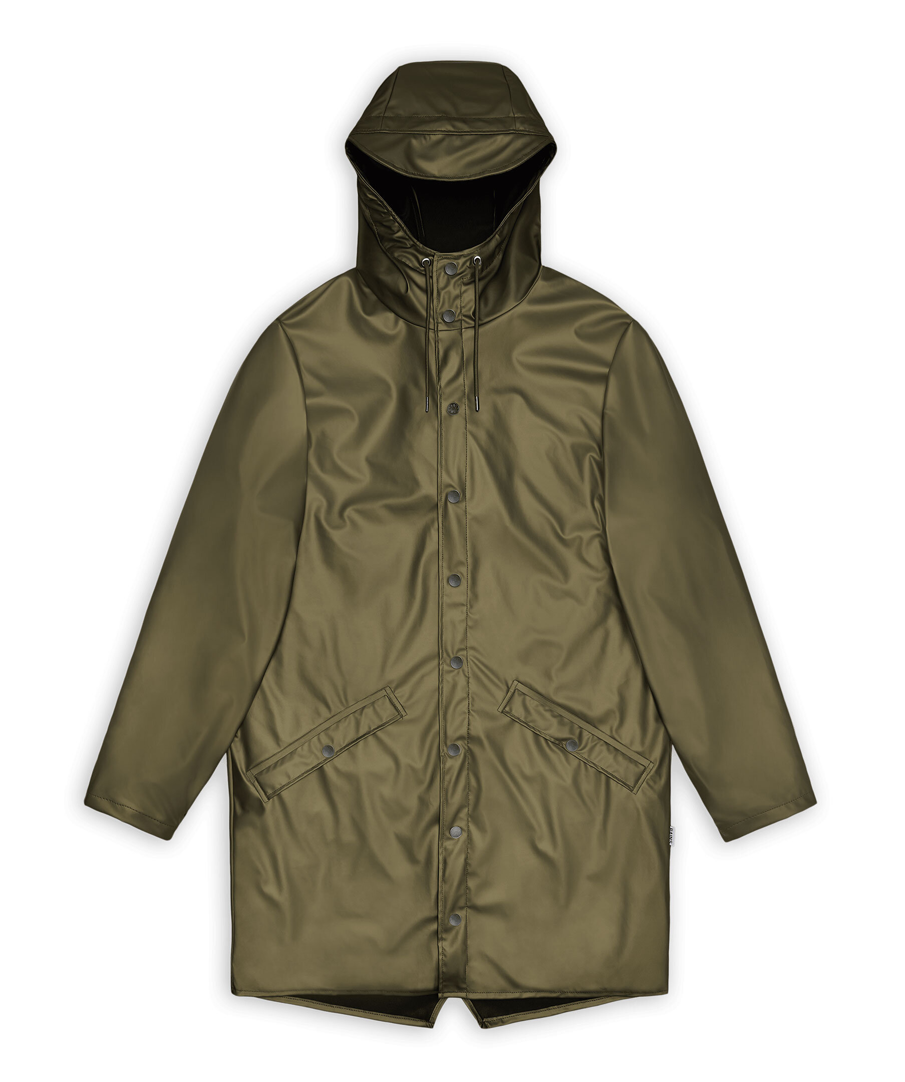 Mörkgrön, glansig regnjacka från Rains som kännetecknas av en minimal siluett i en lång design. Jackan stängs med tryckknappar framtill och har huva med inbyggd keps och två sidfickor med tryckknappar. Ärmarna har tryckknappar som gör dem justerbara för en lös eller tight passform. Tillverkad i polyester.