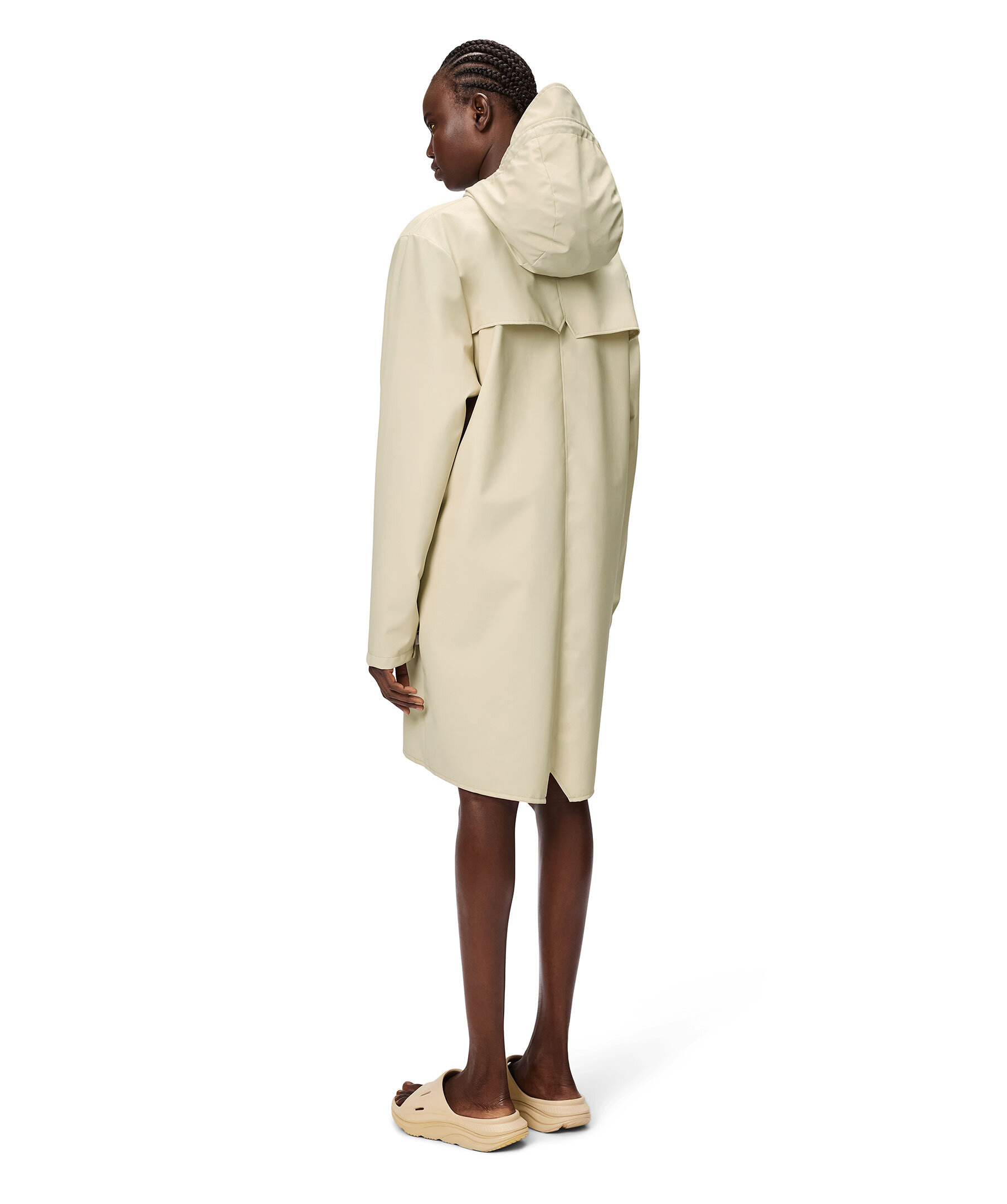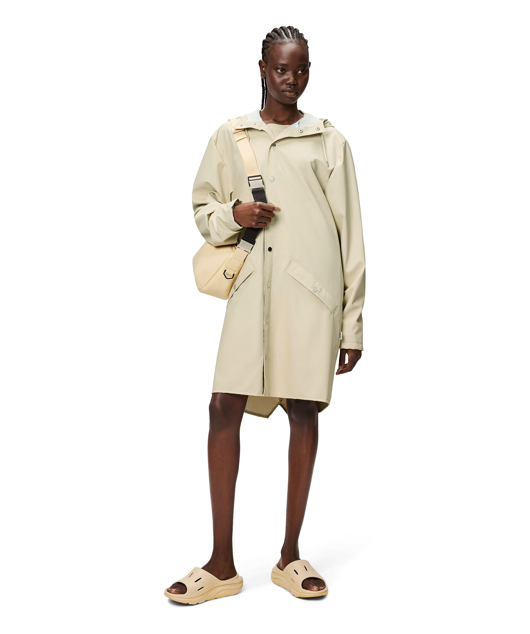 Ljus, sandfärgad regnjacka från Rains som kännetecknas av en minimal siluett i en lång design. Jackan stängs med tryckknappar framtill och har huva med inbyggd keps och två sidfickor med tryckknappar. Ärmarna har tryckknappar som gör dem justerbara för en lös eller tight passform. Tillverkad i polyester.