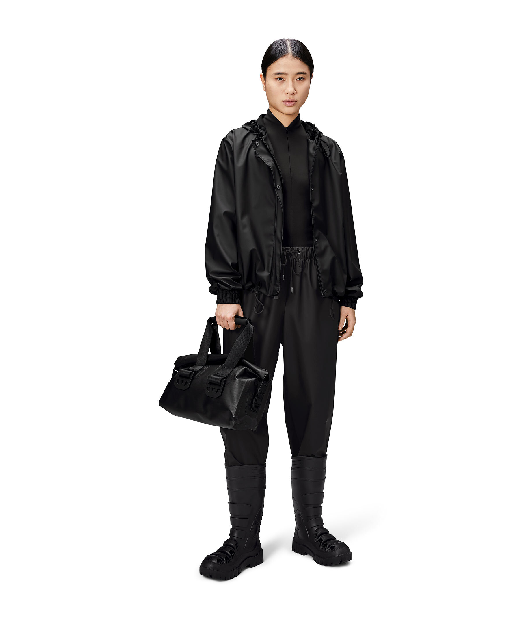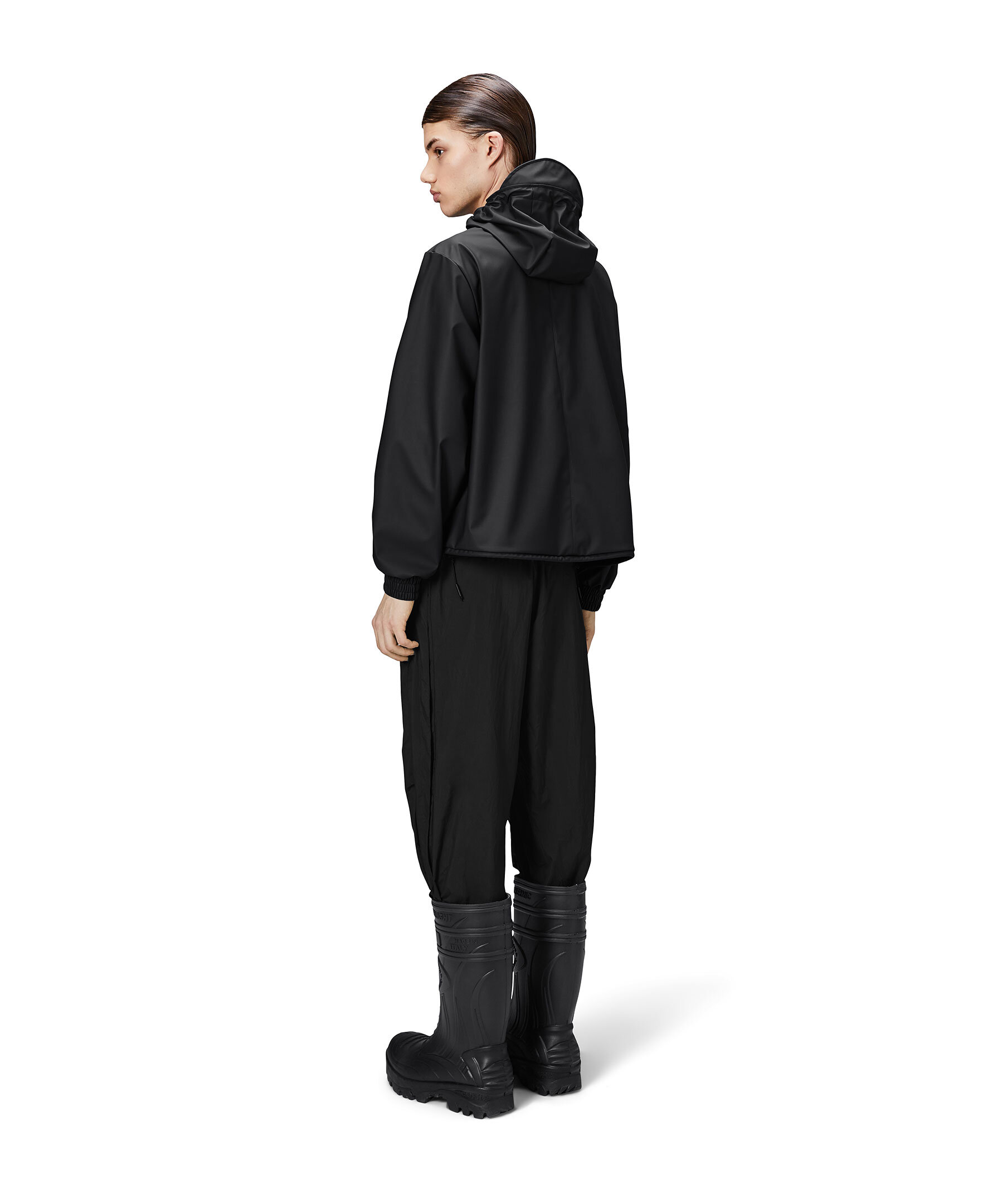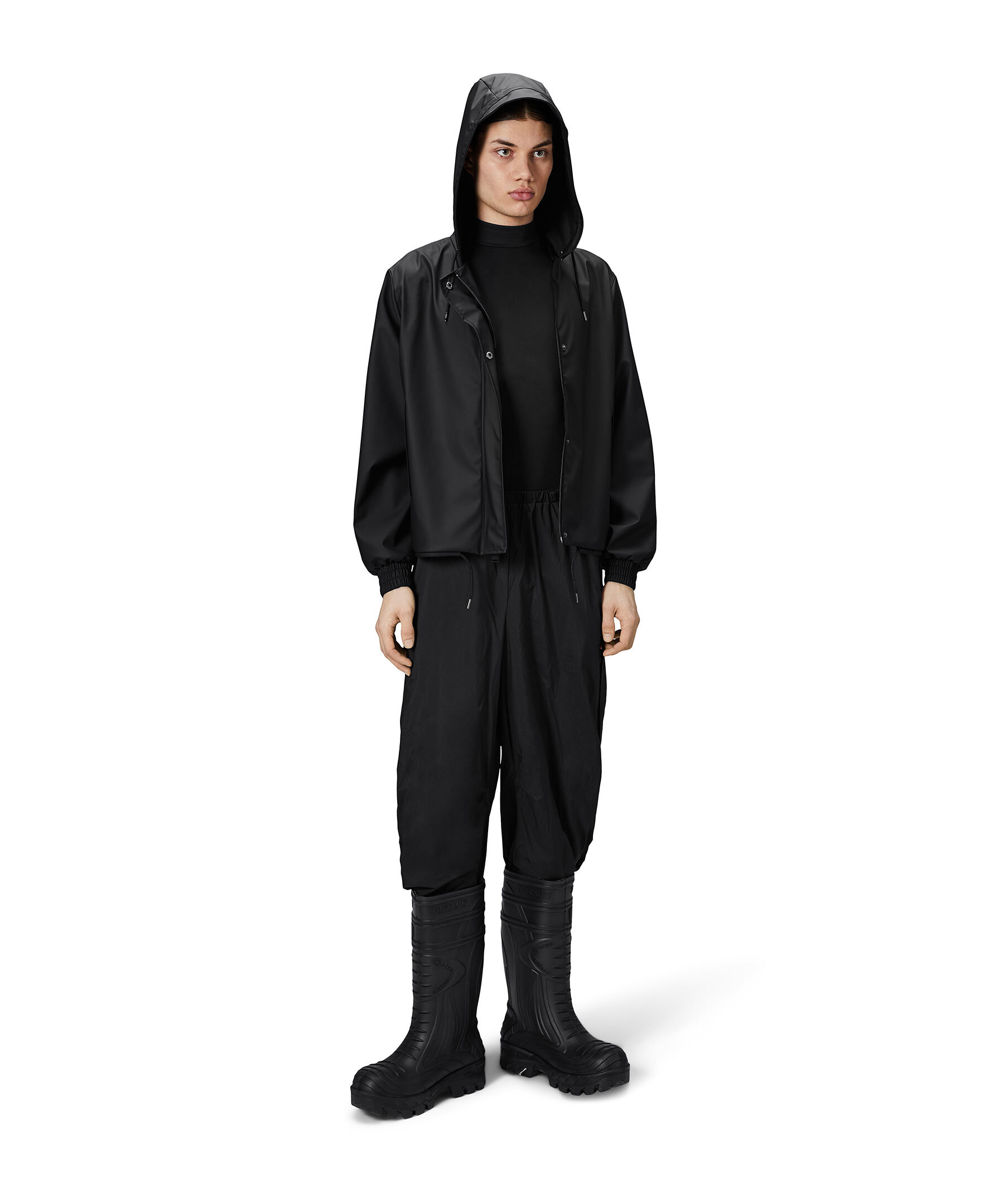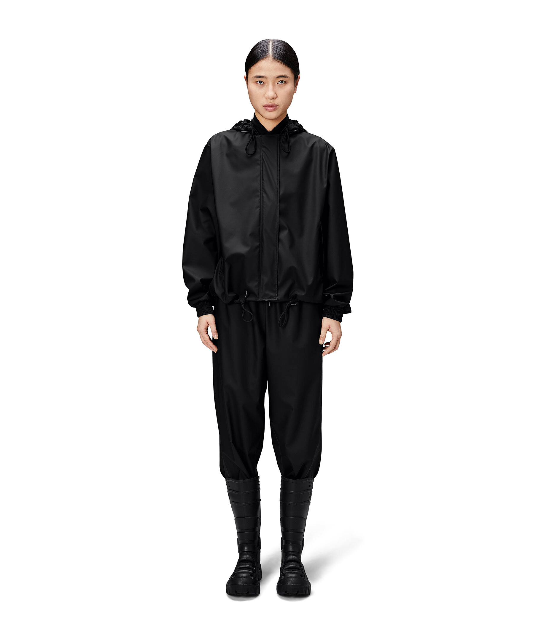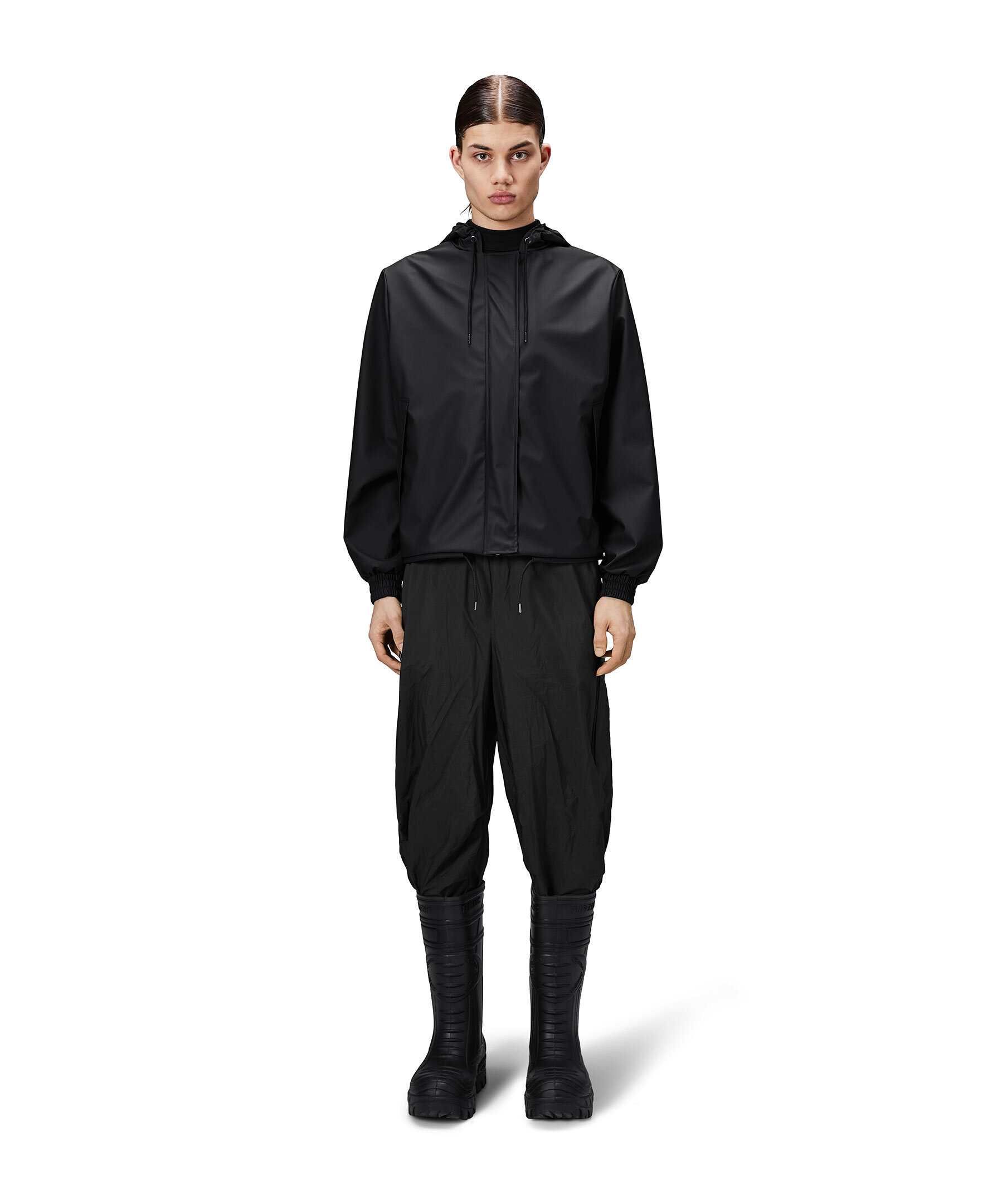 Svart jacka från Rains. String W Jacket är en beskärd regnplaggssilhuett med lös kortare passform. Plagget har elastiska manschetter, diagonala framfickor och armhålsöljetter för ventilation. Silhuetten kan ändras med hjälp av dragskofållen, medan en knappslå med tryckknappar och en signaturhuva med kepsbrätte fulländar looken. Den här vattentäta jackan tillverkas i Rains PU-signaturtyg med ultraljudsförseglade sömmar. Den har en lättviktsfinish med mjuk yta och snyggt fall.