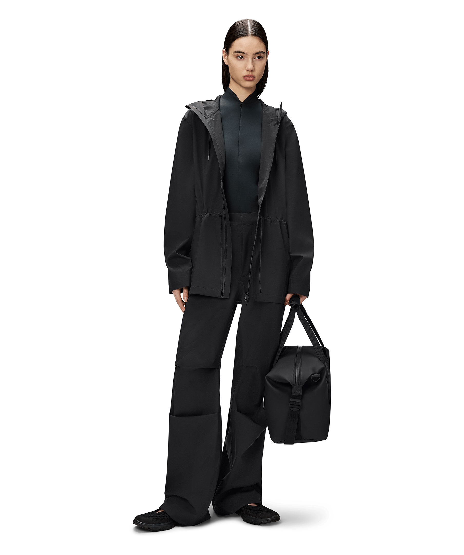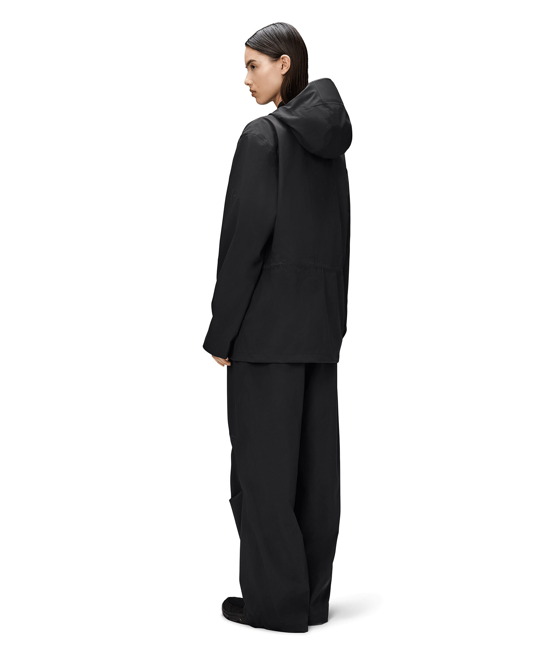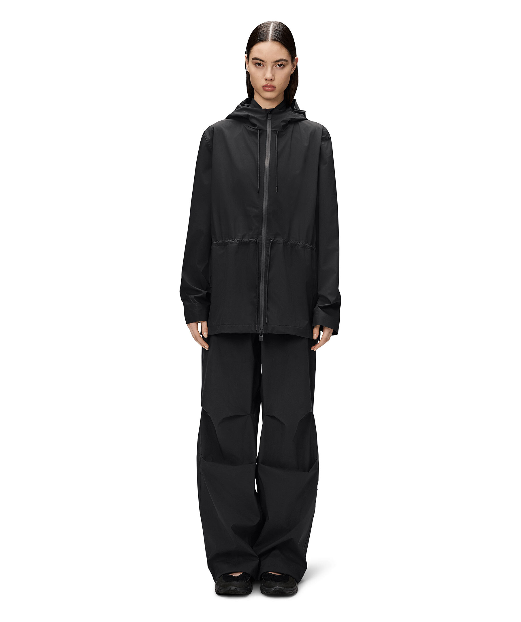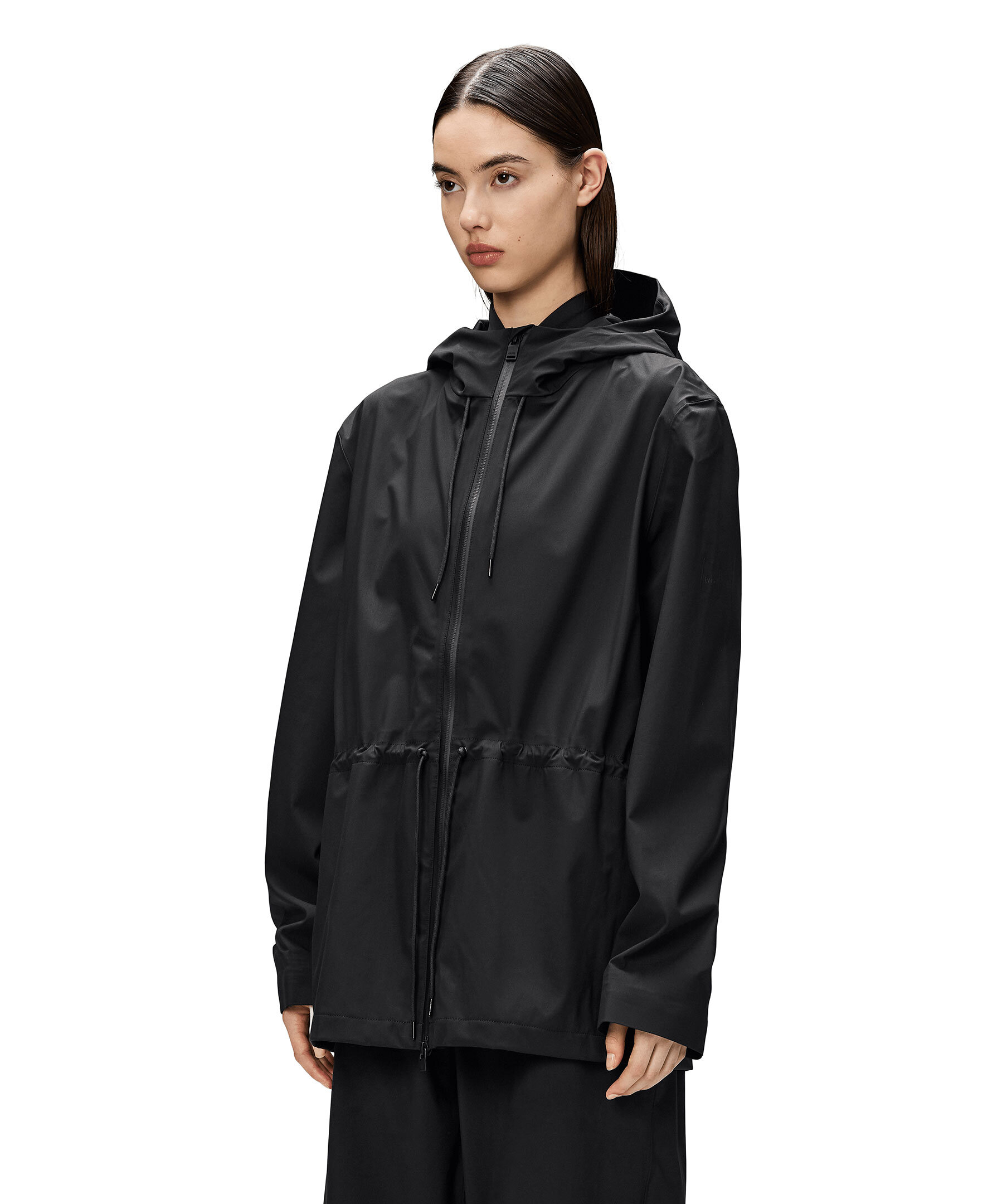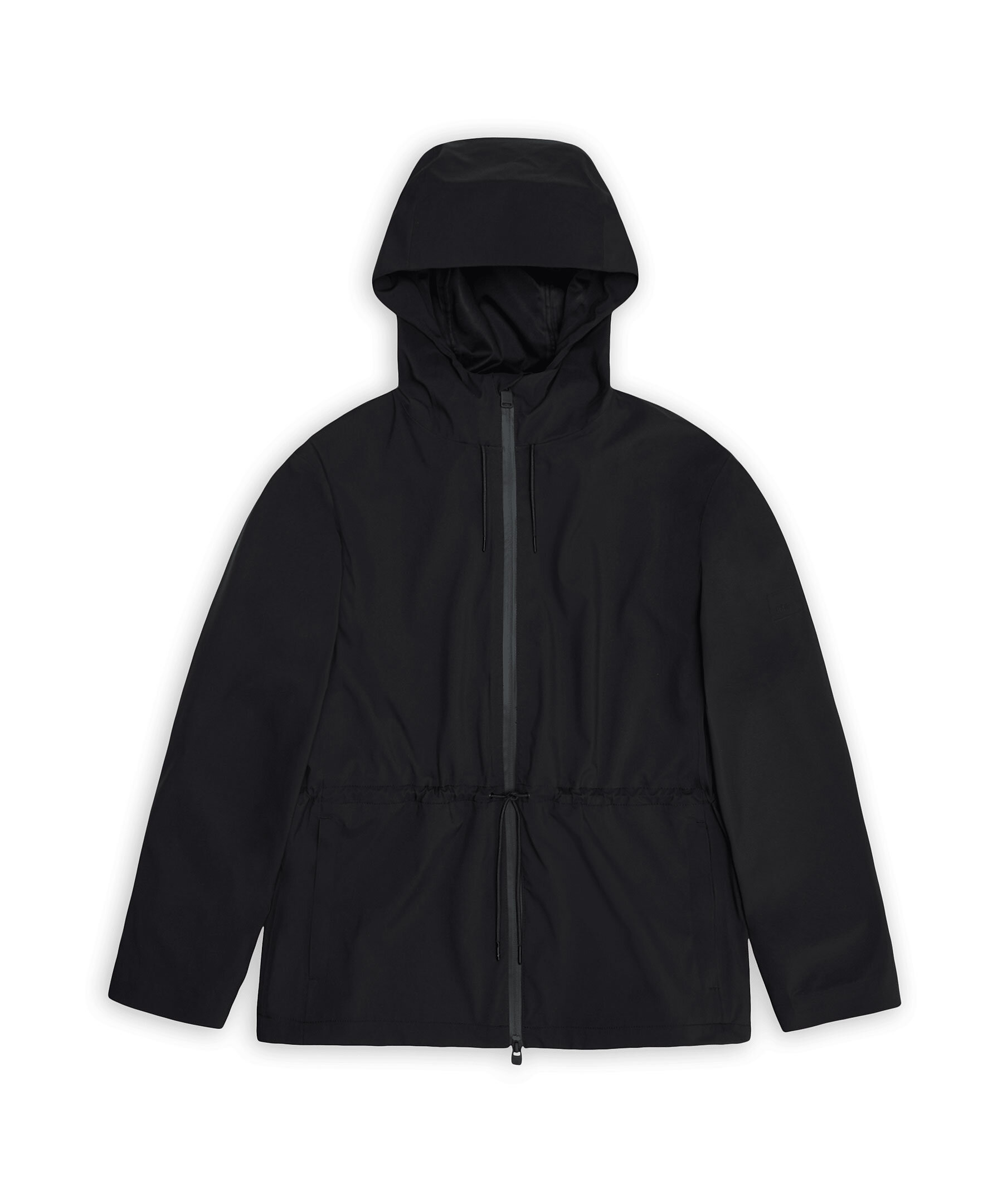 Svart jacka från Rains. Jackan stängs med en vattentät tvåvägsdragkedja och har huva med justerbar dragsko, sidofickor med dragkedja och stormmuddar med teknisk jersey på insidan, samt dragsko i midjan. Tillverkad i ett mjukt och lätt 3L-tyg med tejpade sömmar och en matt yta.