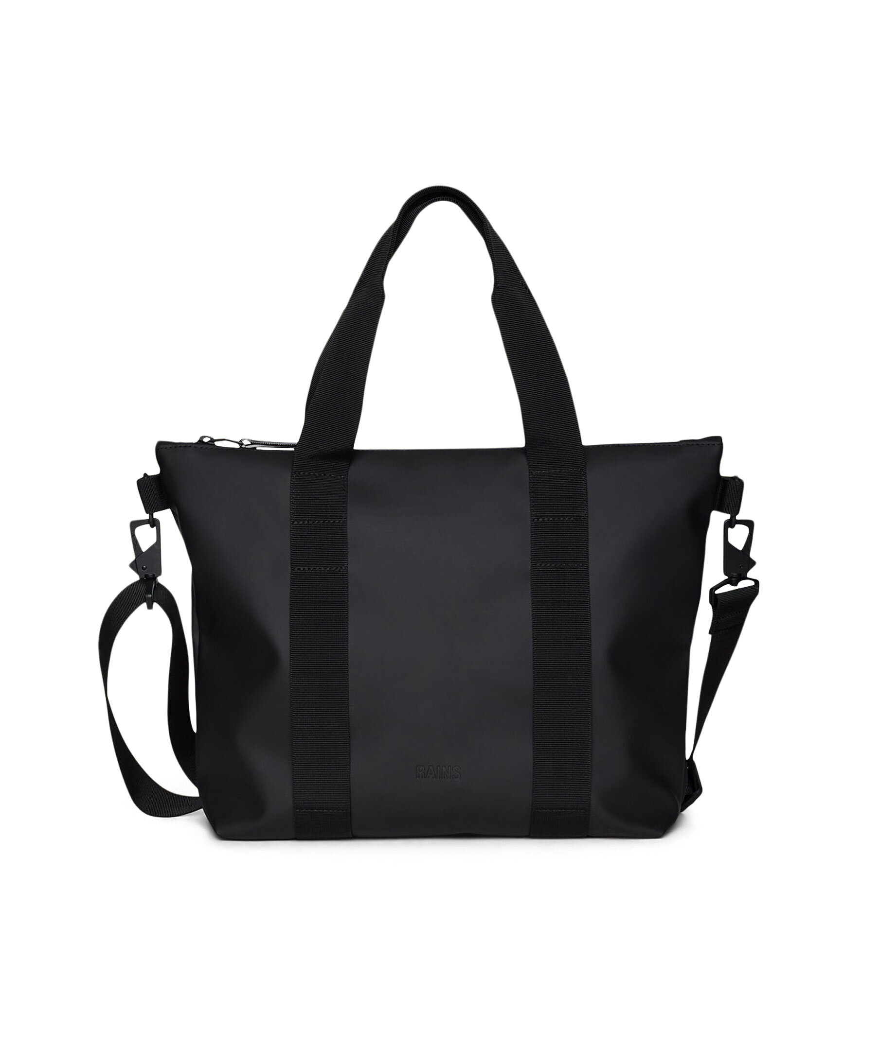 Svart liten totebag i vattentätt tyg från Rains. Väskans huvudfack stängs med dragkedja. Vävda bärhandtag, avtag- och justerbar axelrem. Väskans mått: H 28 x B 36 x D 8 cm. Väskan rymmer 8,1L.