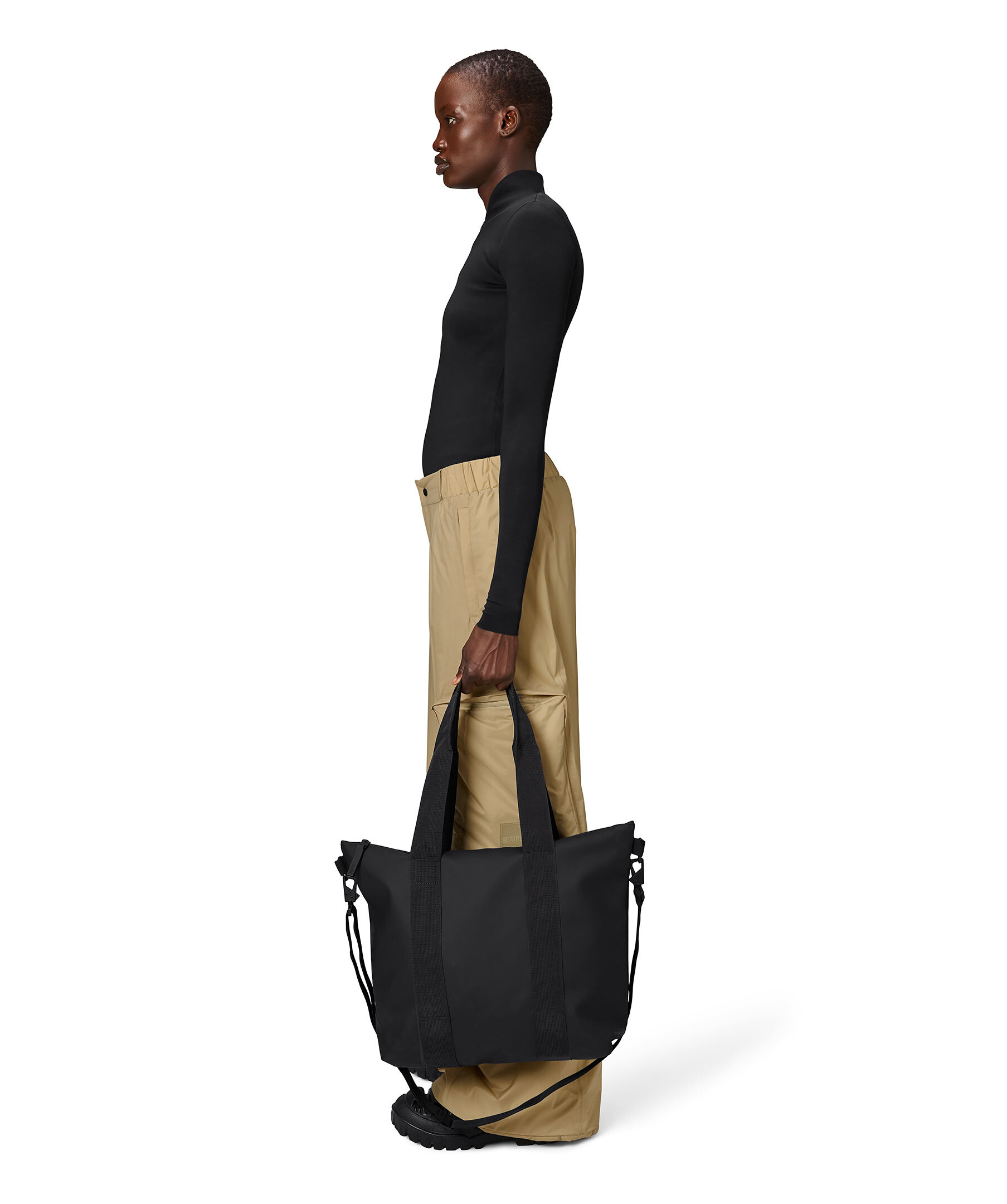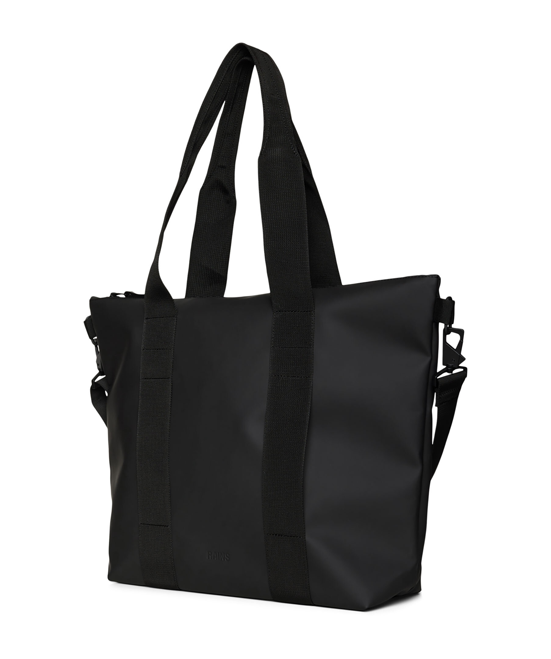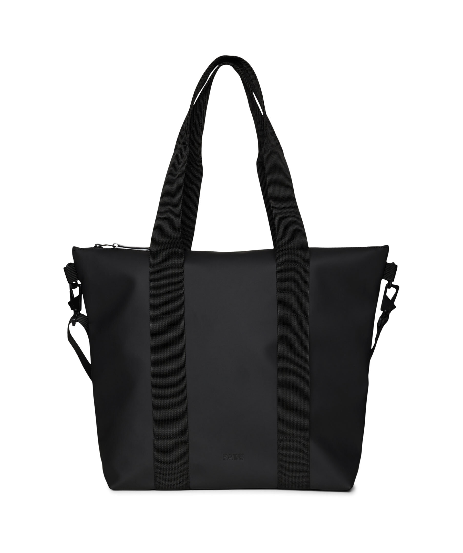 Svart liten totebag i vattentätt tyg från Rains. Väskans huvudfack stängs med dragkedja. Innerfack som stängs med dragkedjaVävda bärhandtag, avtag- och justerbar axelrem. Väskans mått: H 36 cm x B 35 x D 13cm. Rymmer 16.4 L