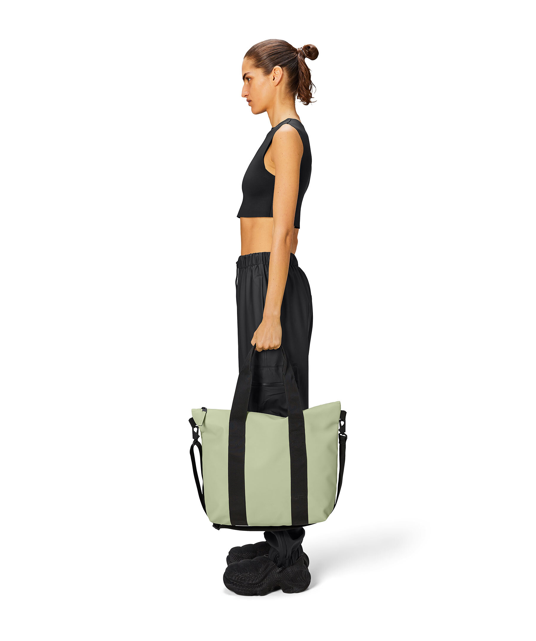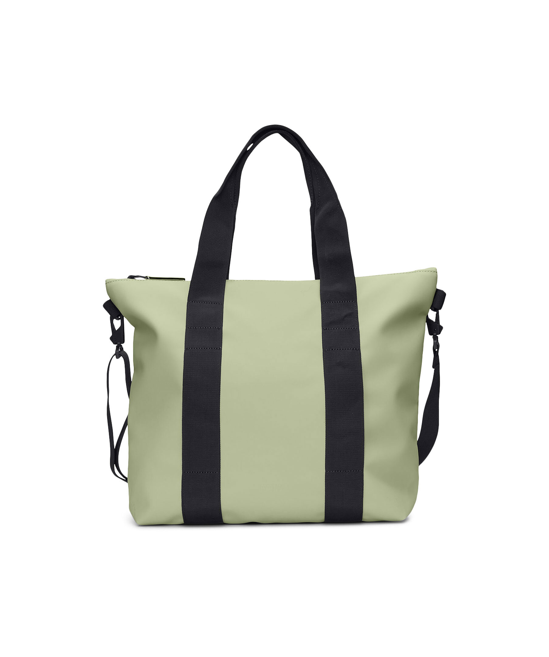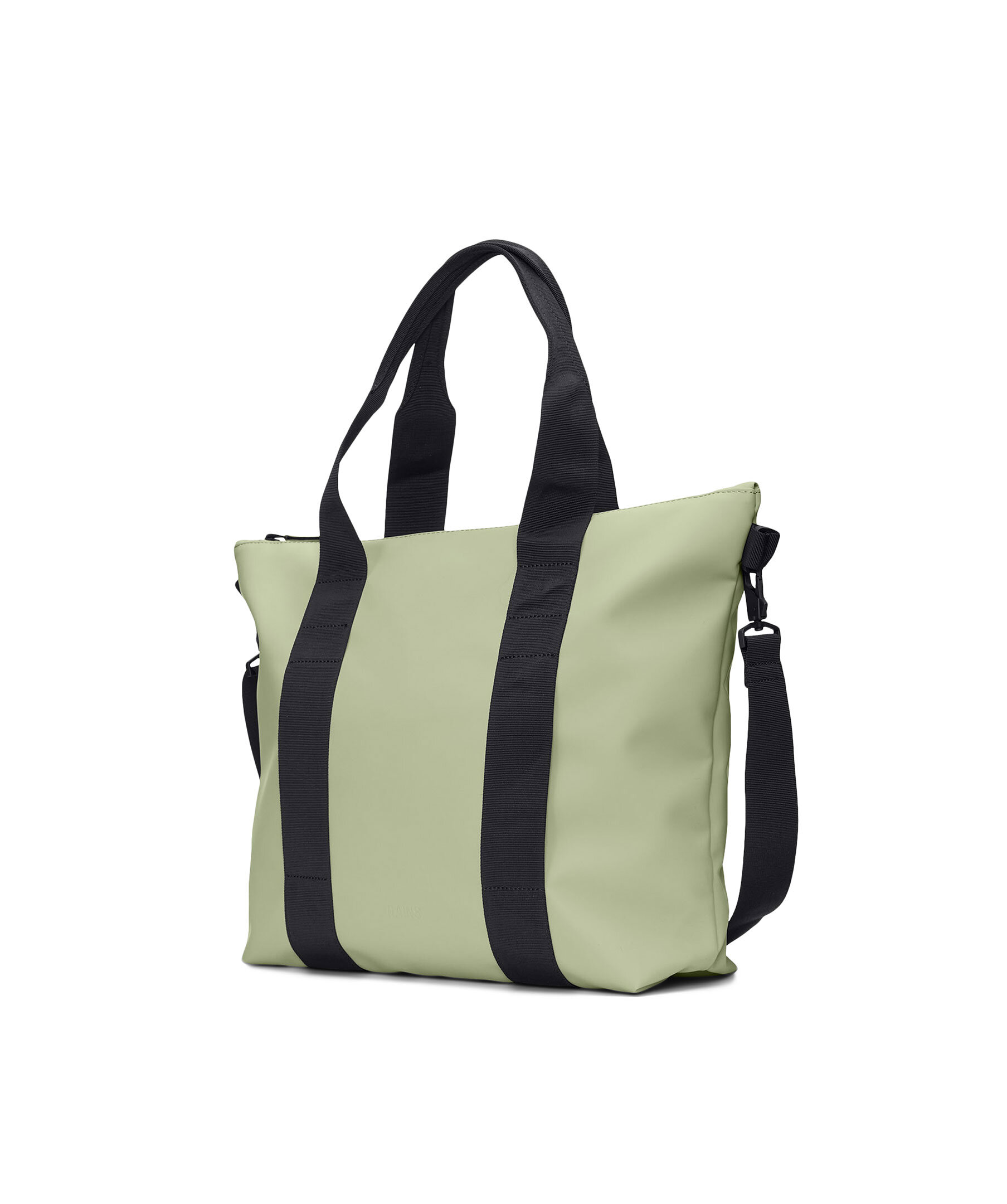 Pistagegrön liten totebag i vattentätt tyg från Rains. Väskans huvudfack stängs med dragkedja. Innerfack som stängs med dragkedja Vävda bärhandtag, avtag- och justerbar axelrem. Väskans mått: H 36 cm x B 35 x D 13cm.