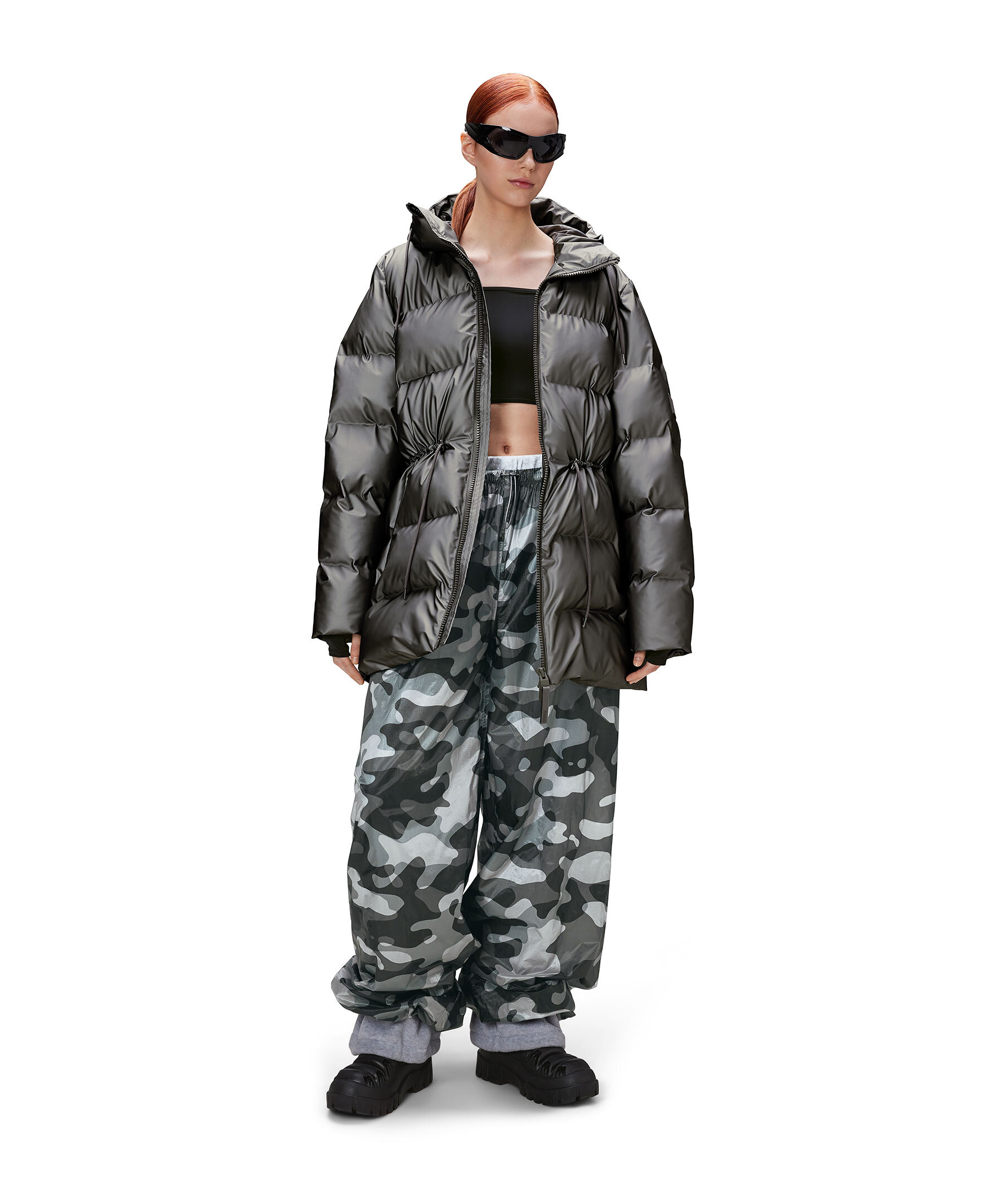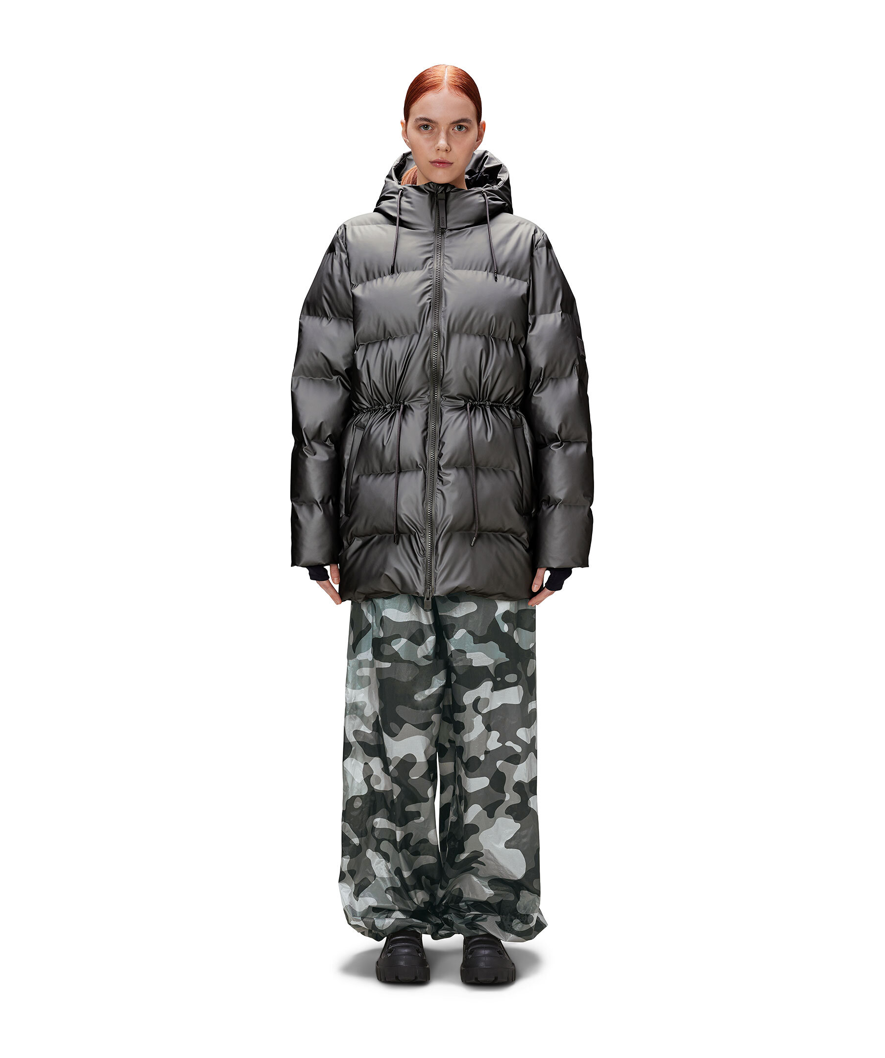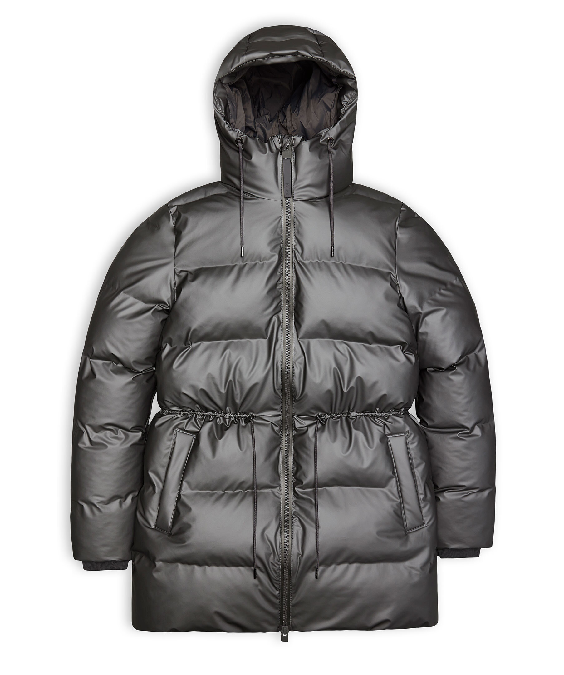 Grå metallicfärgad puffer parka jacka från Rains. En lite längre, vattentät vinterjacka med en ren, lättburen puffer-estetik. Som en del av Alta Puffer-serien kännetecknas plagget av en raffinerad silhuett, breda signaturkammare och avskalade detaljer. Den här lyxiga puffern i vattentätt signaturtyg som andas bygger på fjäderlös kammarteknologi som håller dig varm och bekväm i de kallaste vädren. Jackan har gummerat tvåvägsblixtlås, ultraljudsgjutna sömmar, rymliga fleecefodrade sidfickor, dolda stormmanschetter och inre bröstficka. Silhuetten fulländas av en fodrad dragskohuva och dragskomidja.