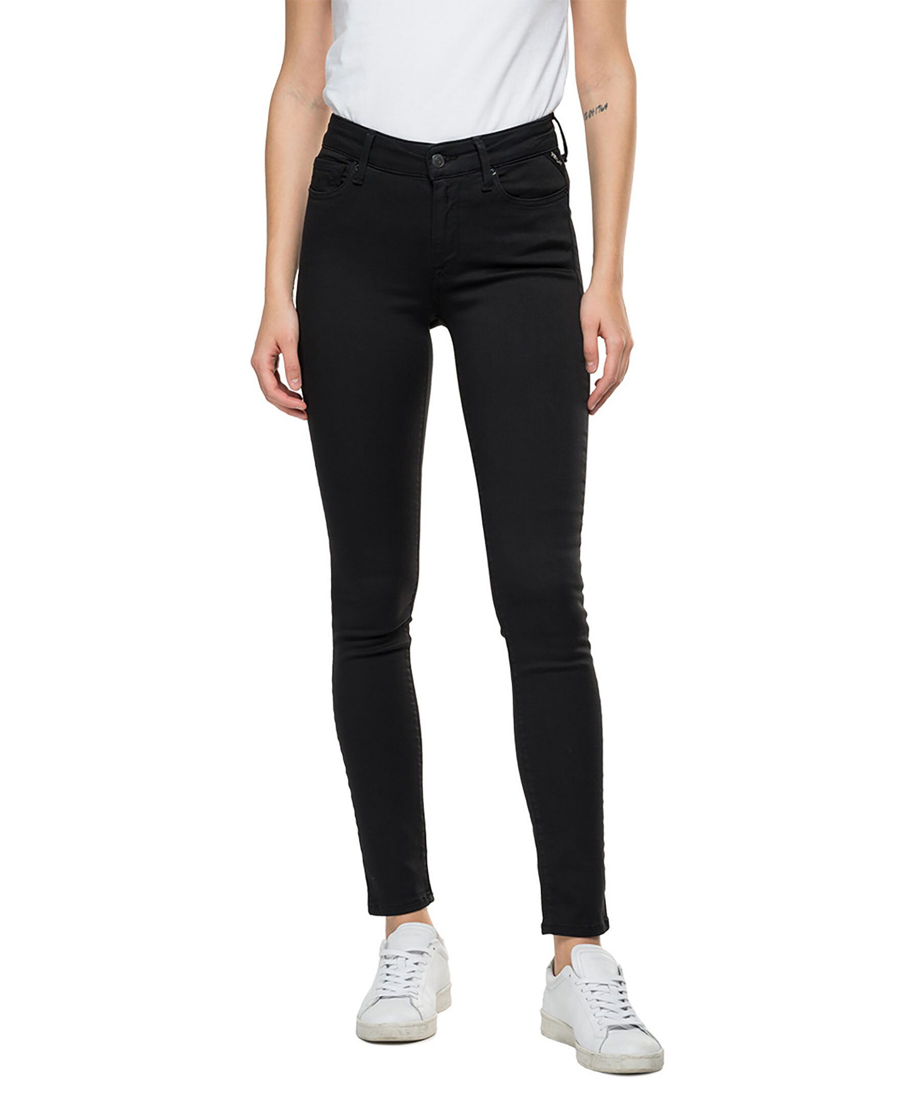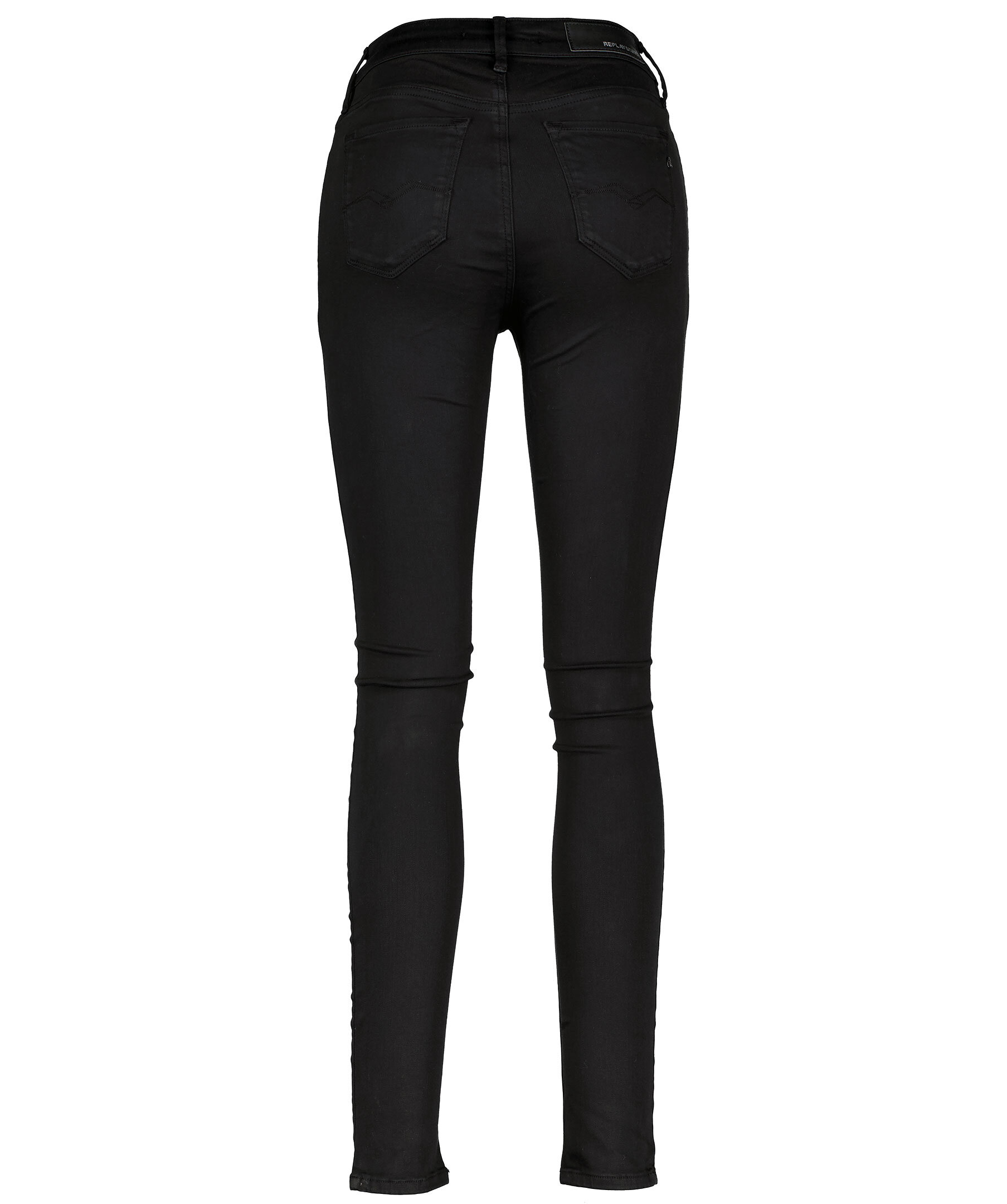 Svarta jeans med smal passform från Replay. Powerstretch-denim med 4 vägsstretch, hög midja och smala ben. Fem fickor, triangelformad REPLAY-etikett på vänster framficka, myntficka och bakfickor med ikoniska Replay-sömmar. R-formad metallbricka på höger bakficka, hällor för bälte i midjan, etikett bak på linningen samt dragkedja och knappgylf. Jeansen är lite stora i storlek, vi rekommenderar att gå ner en storlek för bäst passform.