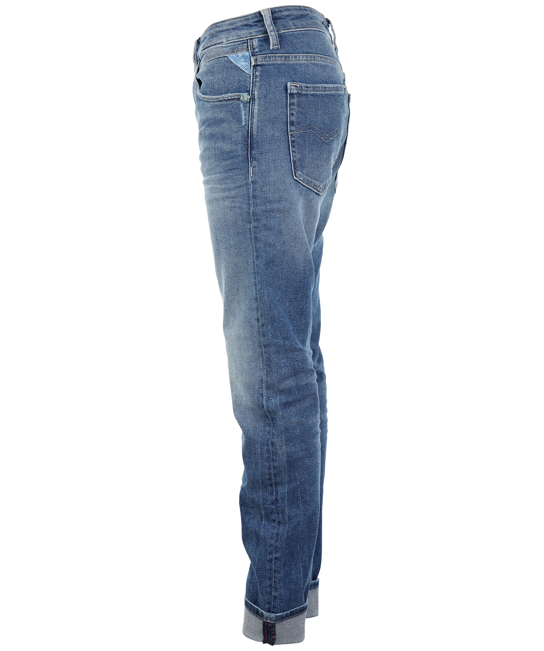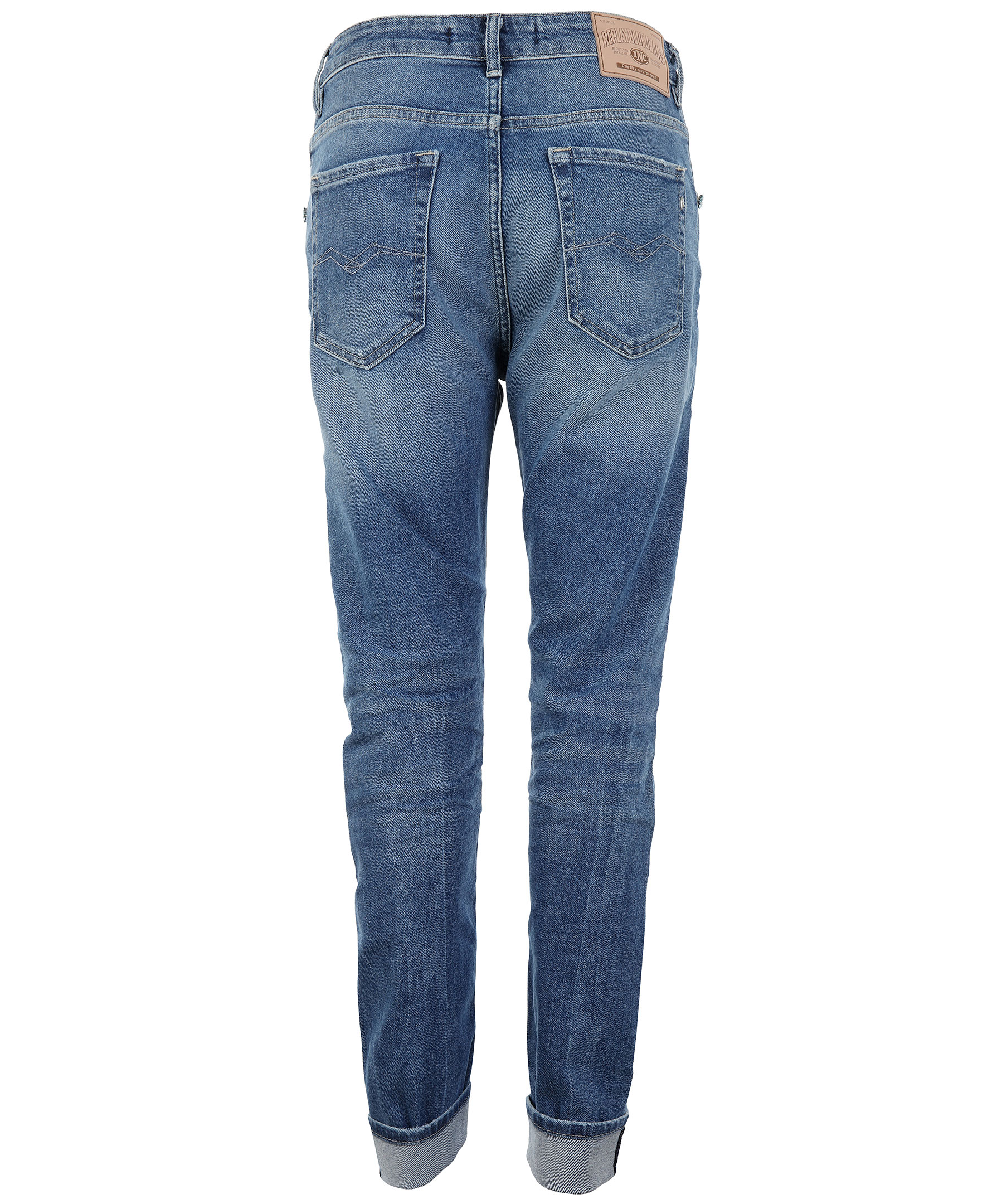 Mörkblåa jeans i Slim boyfriend modell från Replay. Fem fickor och hällor för bälte i midjan. Liten trekant med silvriga paljetter på vänster sida vid fickan. Patch i beige läder i midjan bak.
