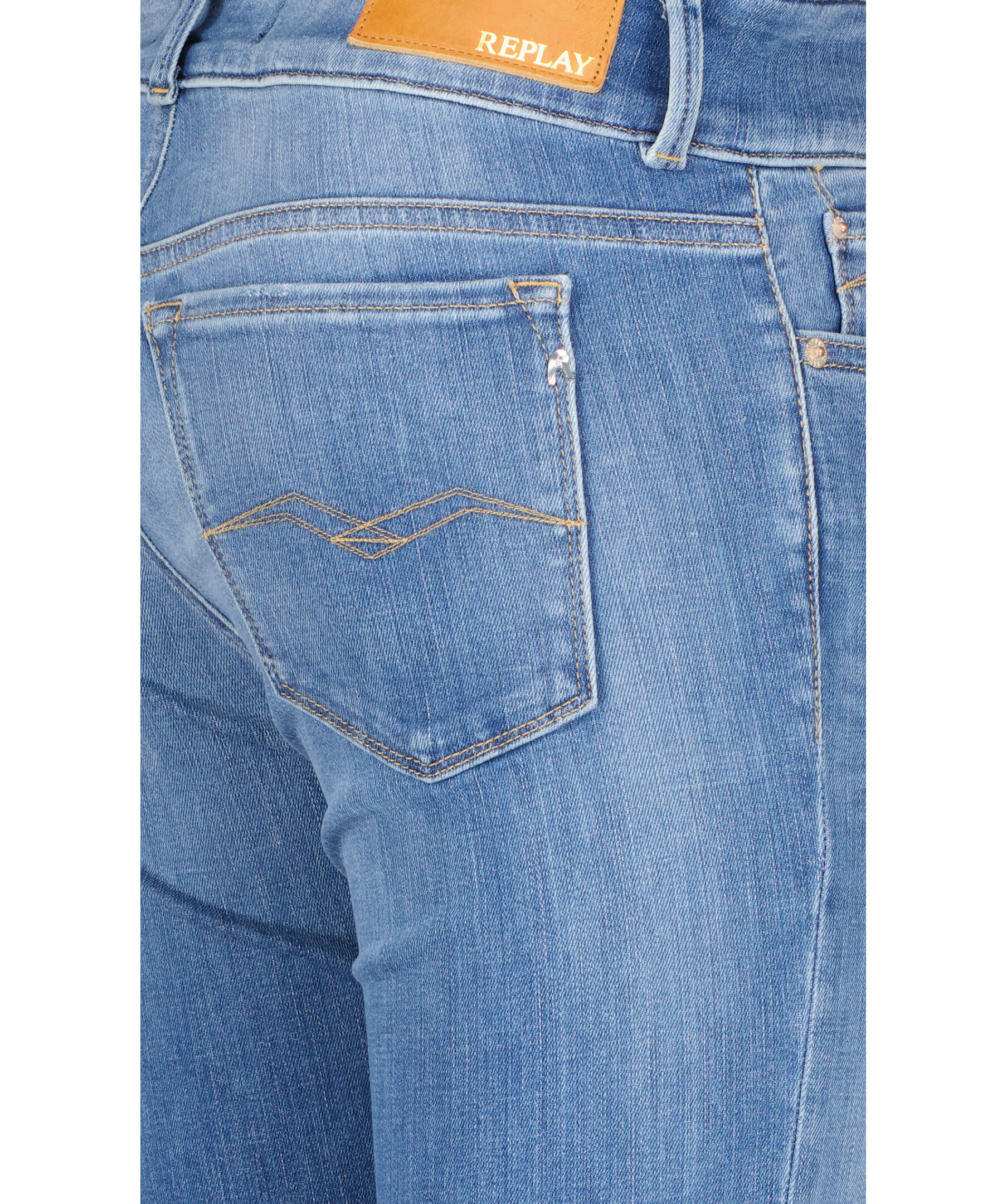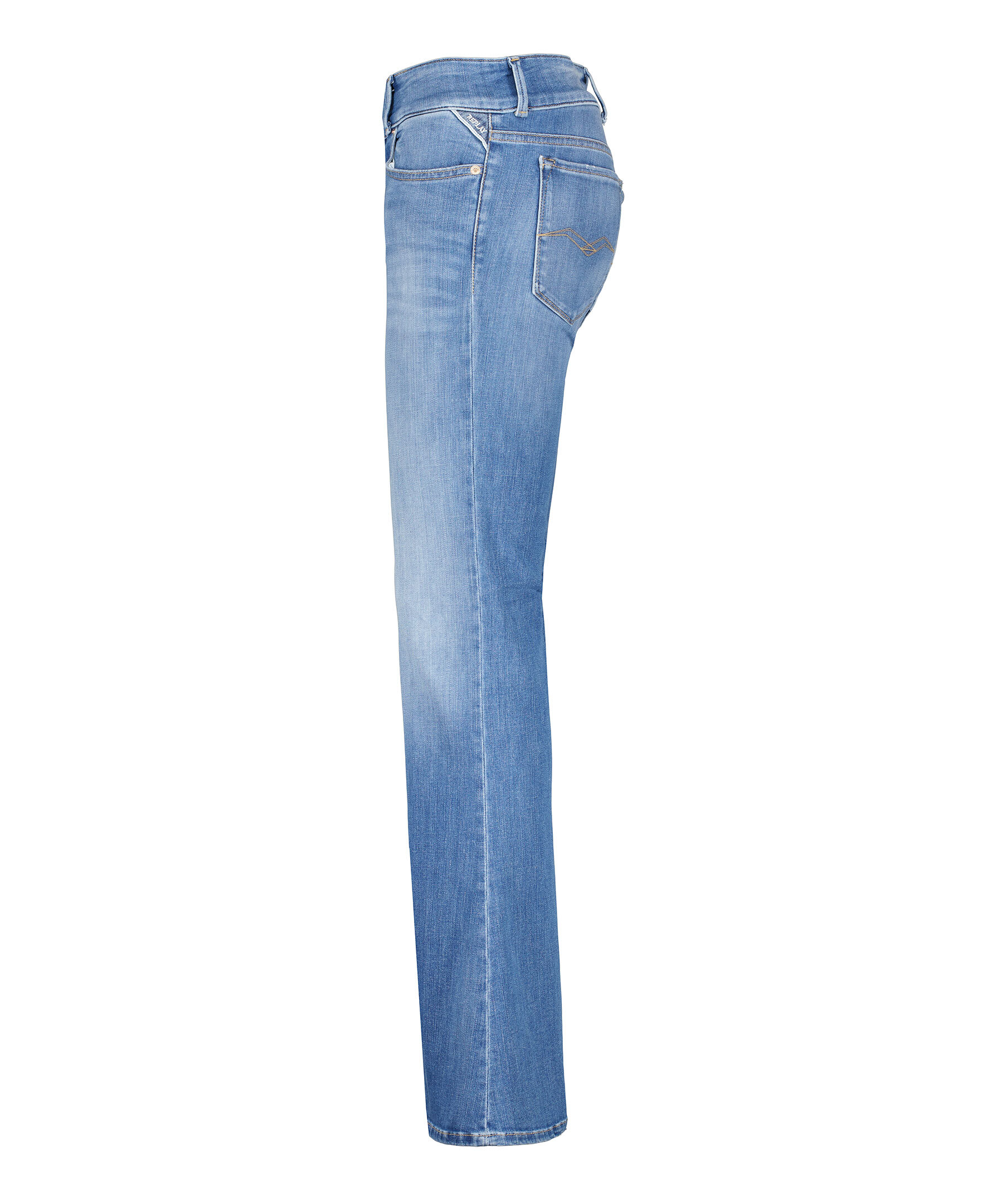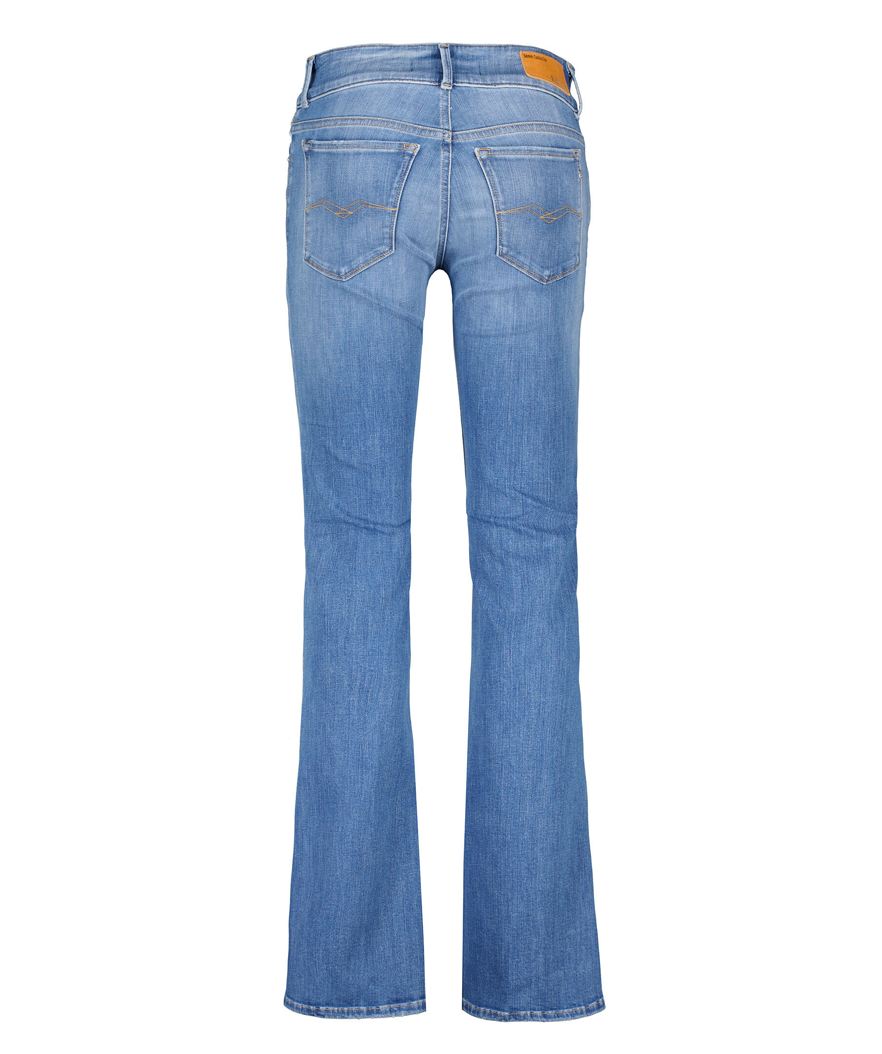 Ljusblåa jeans i utsvängdmodell från Replay. Hällor för bälte, gylf som stängs med dragkedja och dubbla knappar. Fem fickor, triangelformad REPLAY-etikett på vänster ficka, mynt ficka och bakfickor med ikoniska Replay-sömmar. Liten logotyp i metall på höger ficka. Patch i läder med embossad logotyp på högersida. Innerbenslängden är 78 cm på 27'30.