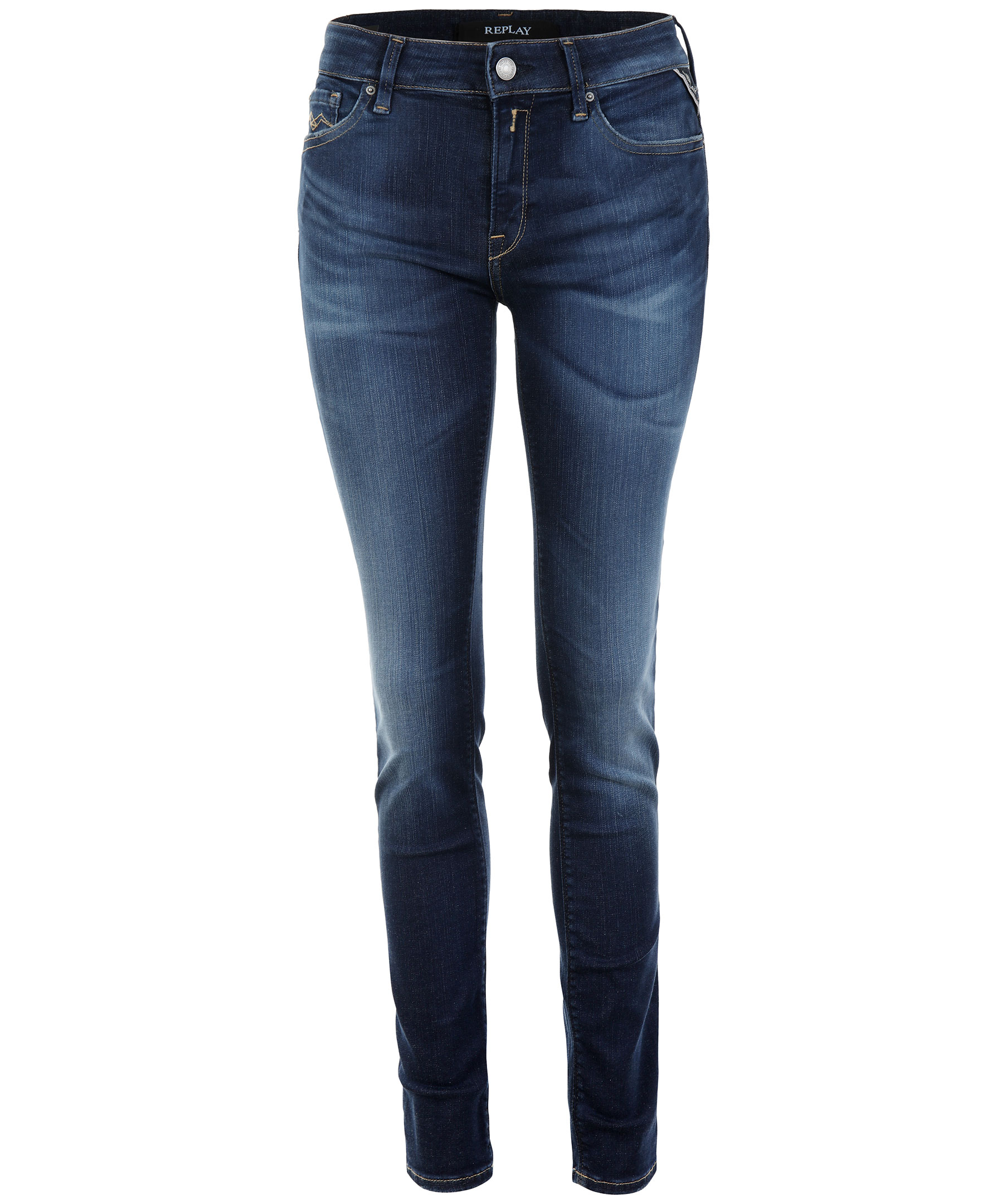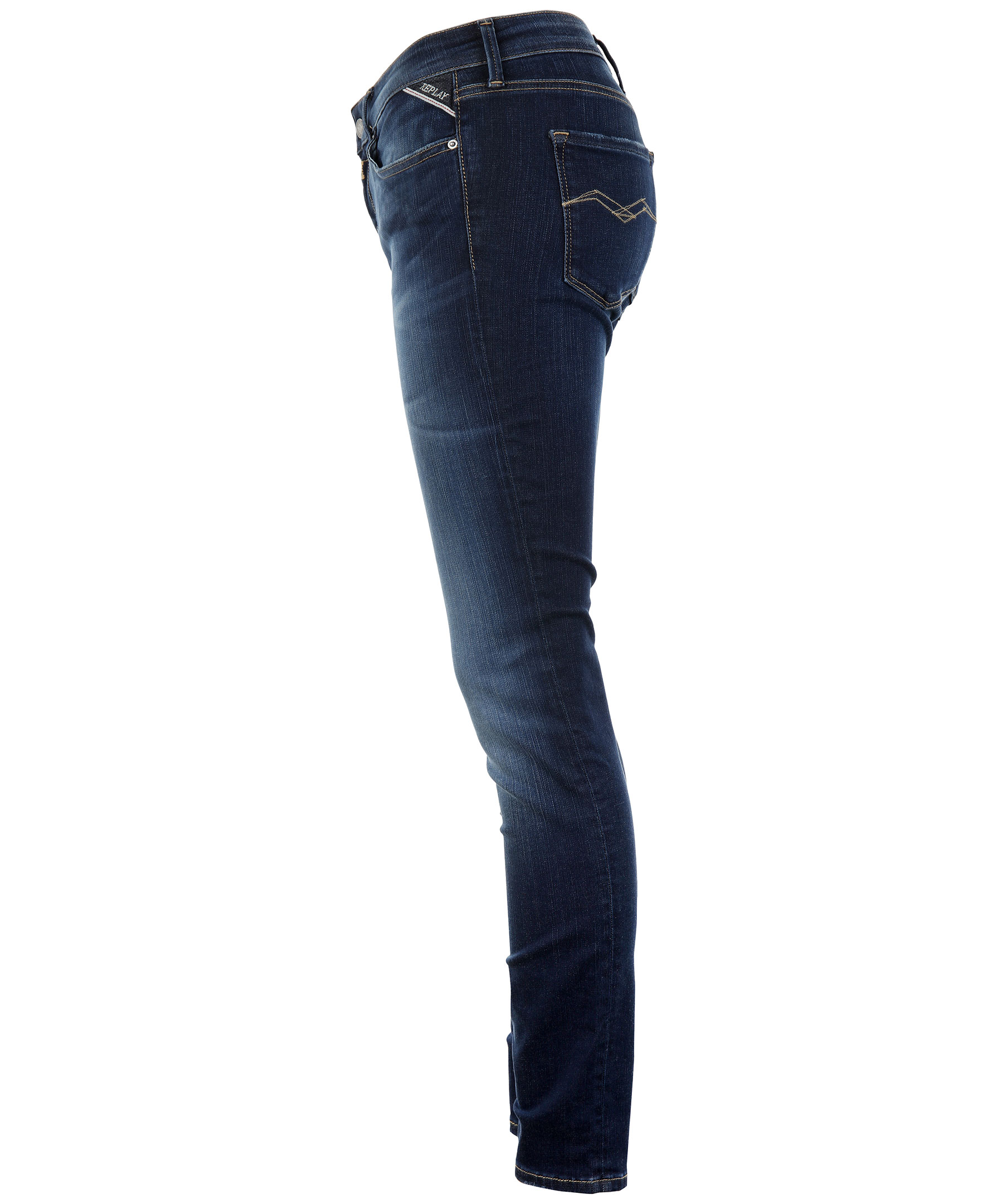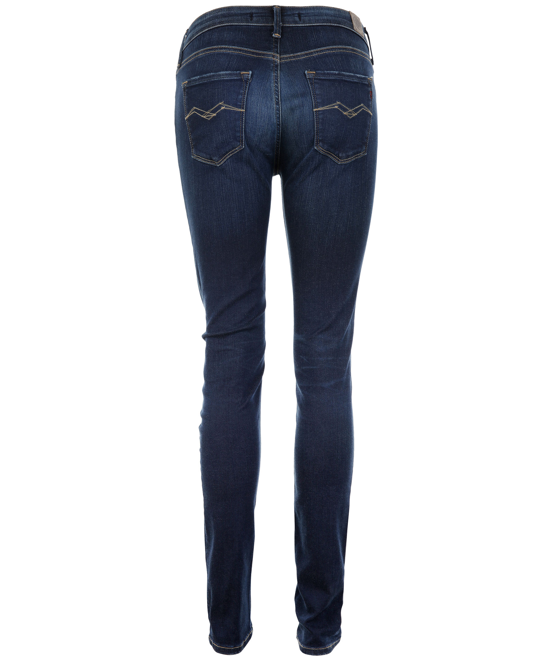 Mörkblåa jeans i Hyperflex modell från Replay. Slim fit, har fem fickor och hällor för bälte i midjan. Liten patch i grått läder i midjan bak.