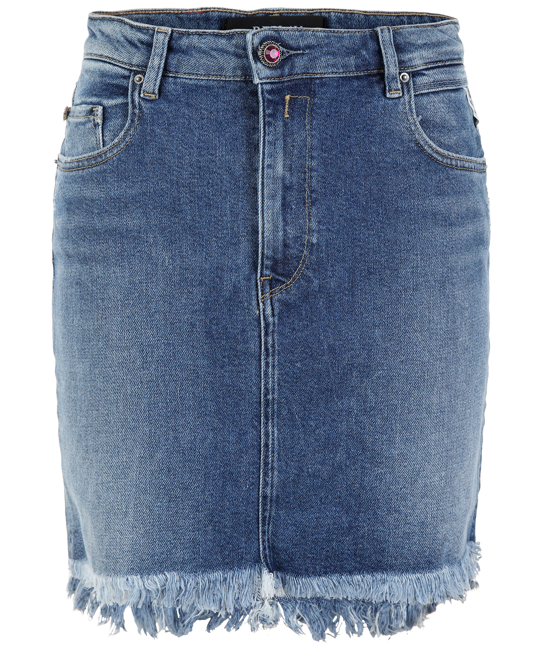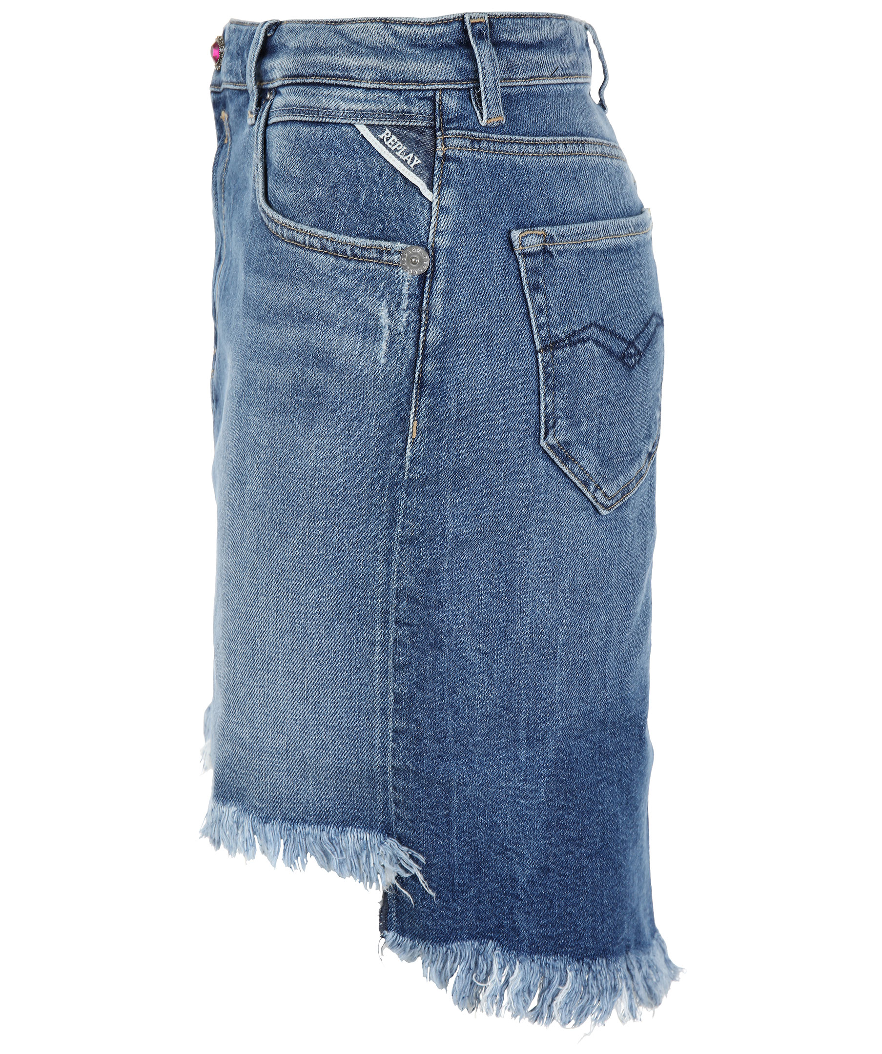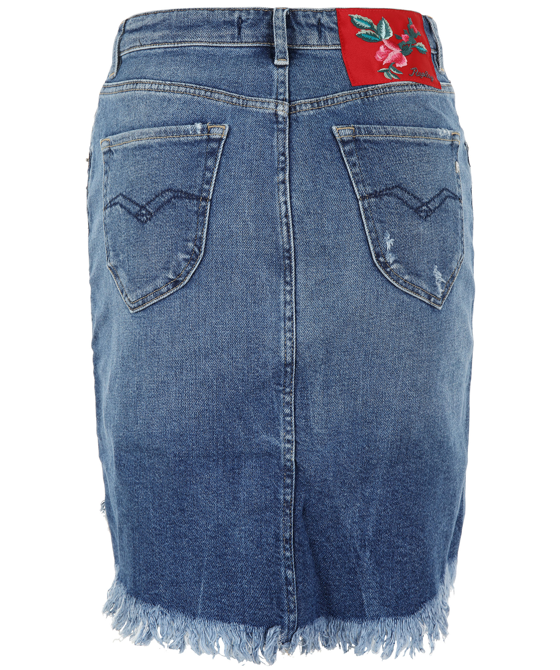Kort jeans kjol från Replay. Kjolen är i femficksutförande med en flerfärgad knapp fäst på den lilla fickan. Råskuret slut med baksidan lite längre än framsidan. Dold gylf med dragkedja och knapp med mörkrosa sten. Broderad logotyp i vänstra fickan samt broderad patch i rött siden baktill i midjan.