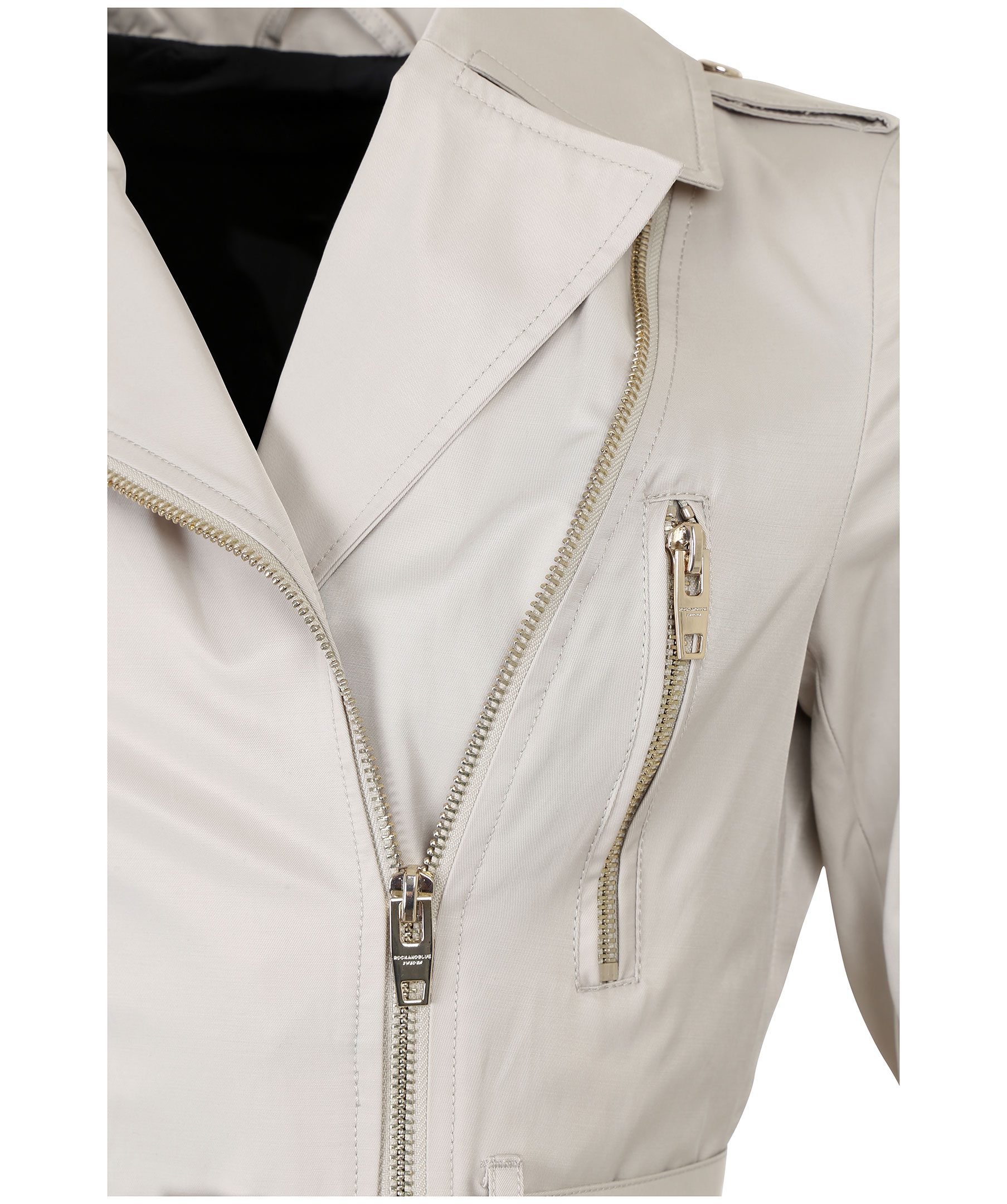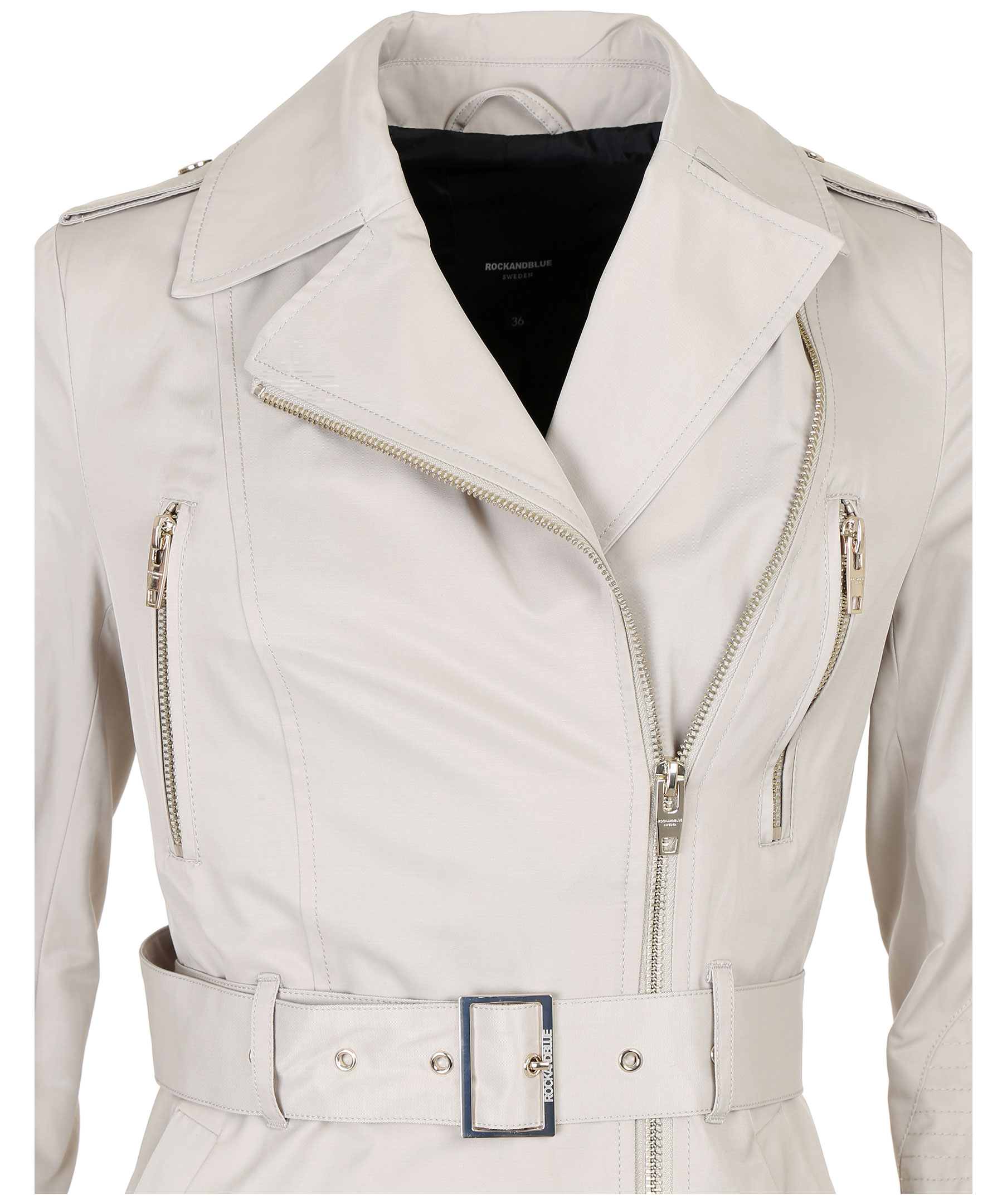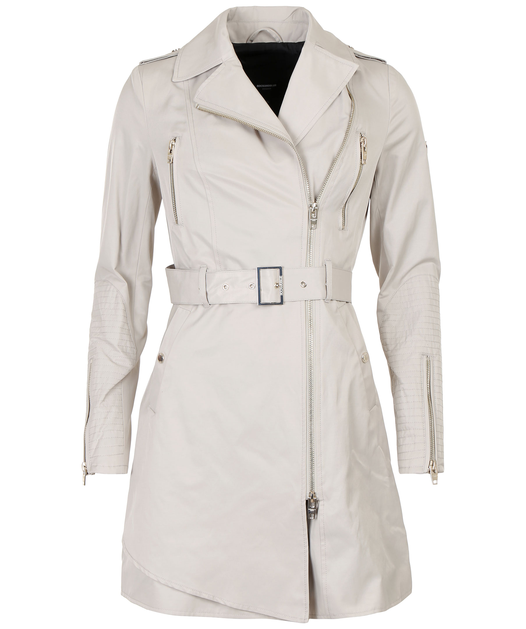 Beige trenchcoat från Rock and Blue med moderna detaljer. Två bröstfickor med guldfärgade dragkedjor, en innerficka samt två framfickor som stängs med trycknapp. Skärp i midja, klassisk trench krage och dragkedja vid ärmslut. Liten logotyp på vänster ärm.