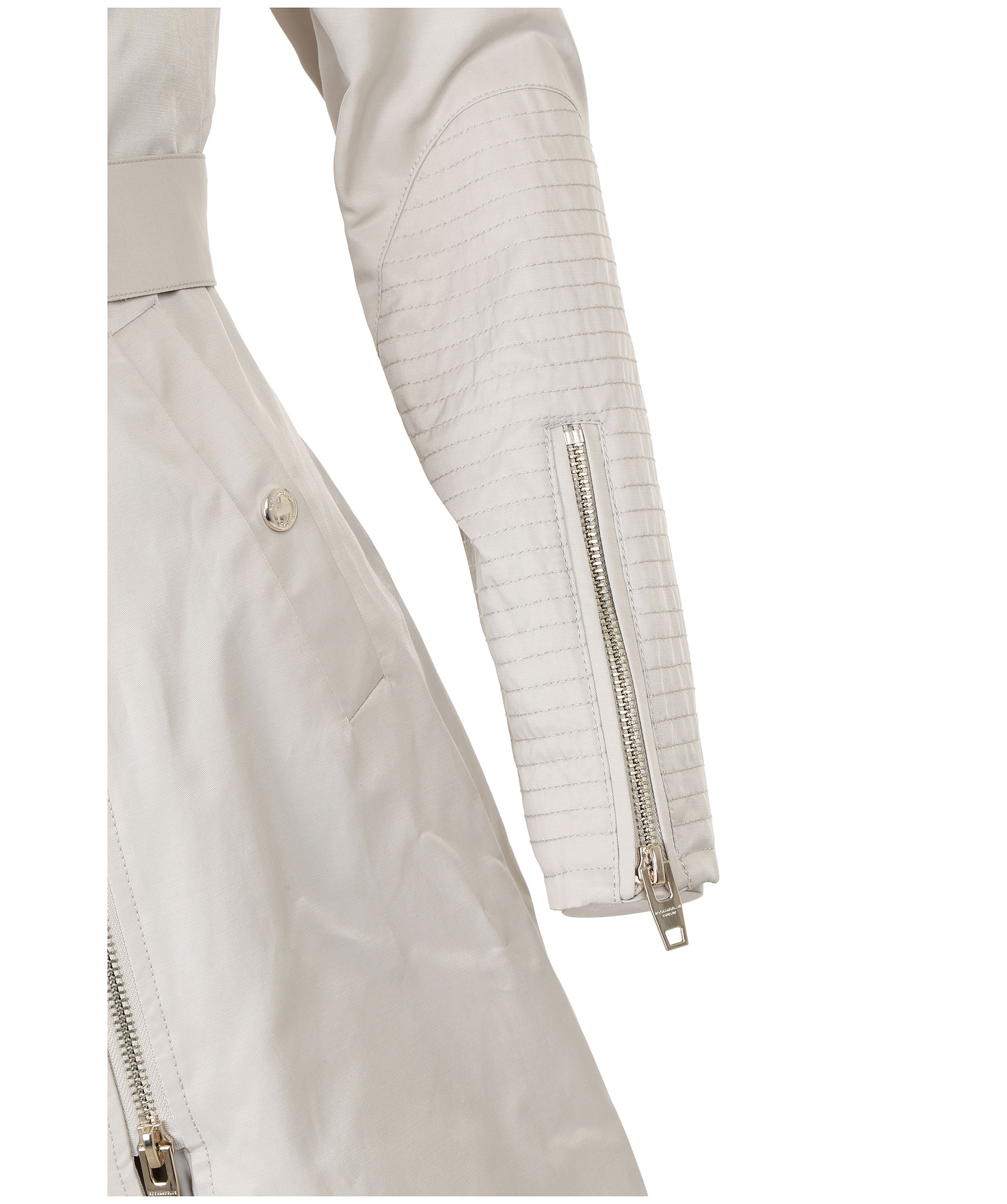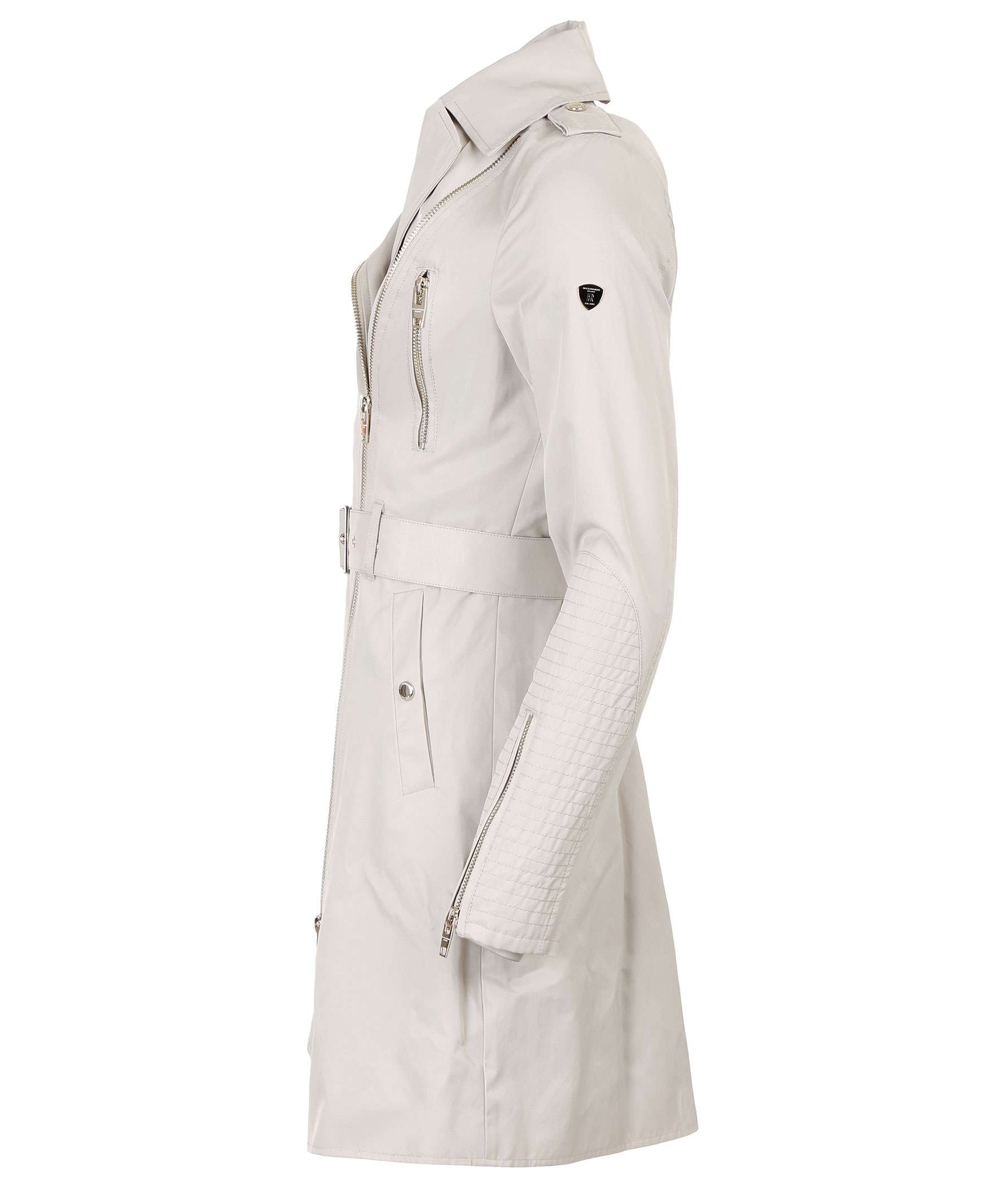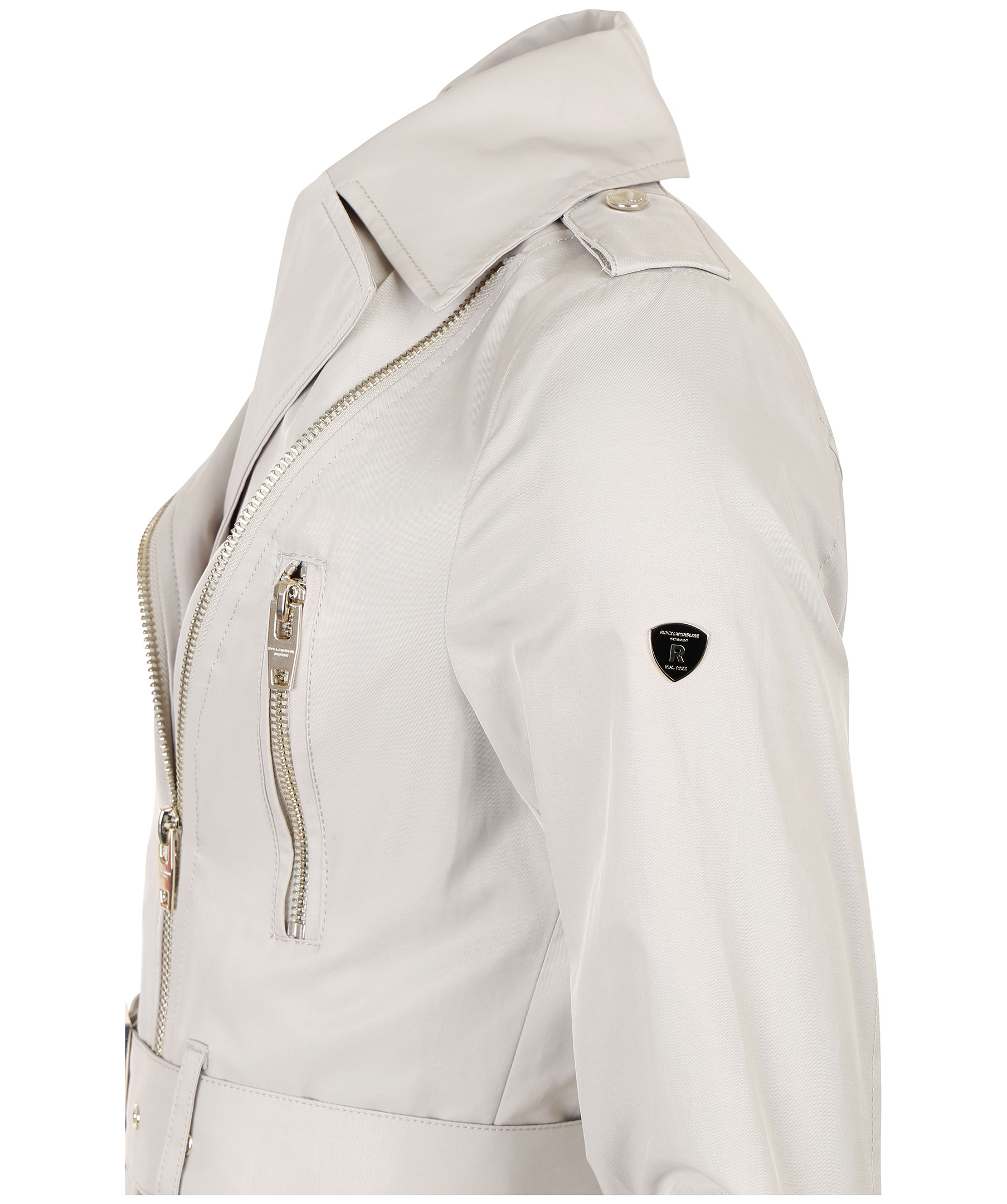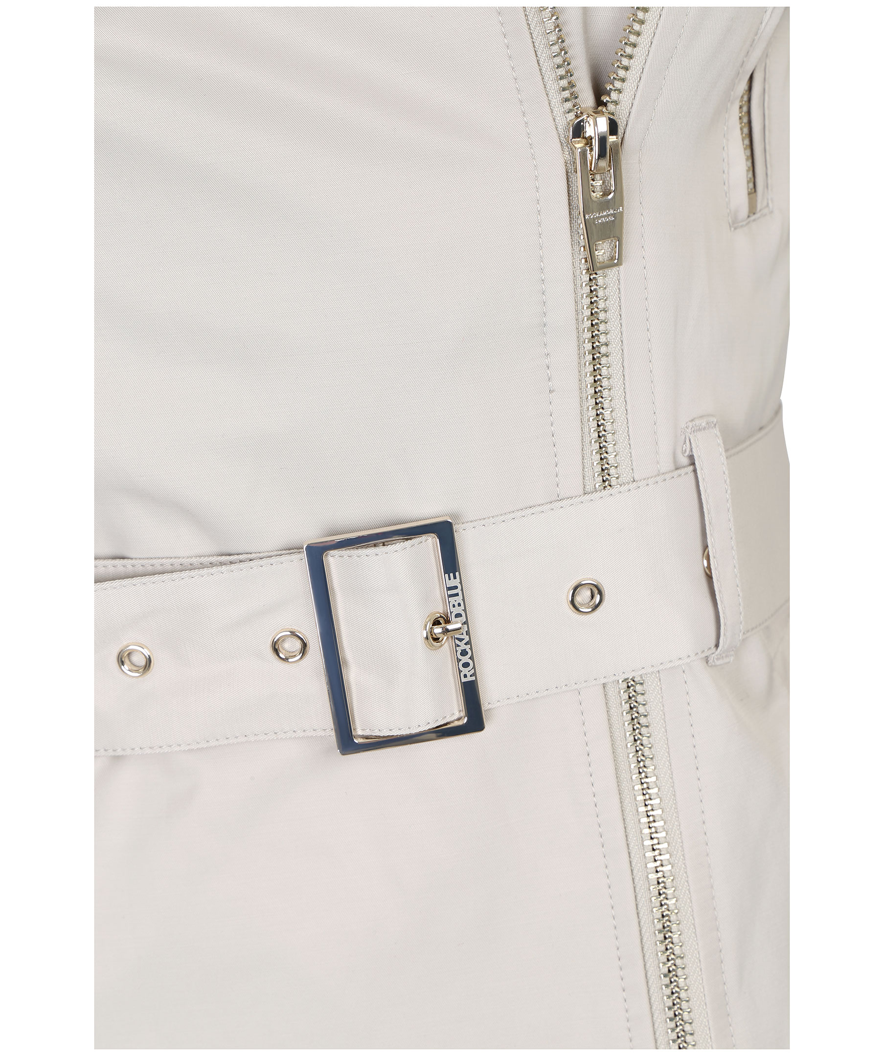 Beige trenchcoat från Rock and Blue med moderna detaljer. Två bröstfickor med guldfärgade dragkedjor, en innerficka samt två framfickor som stängs med trycknapp. Skärp i midja, klassisk trench krage och dragkedja vid ärmslut. Liten logotyp på vänster ärm.