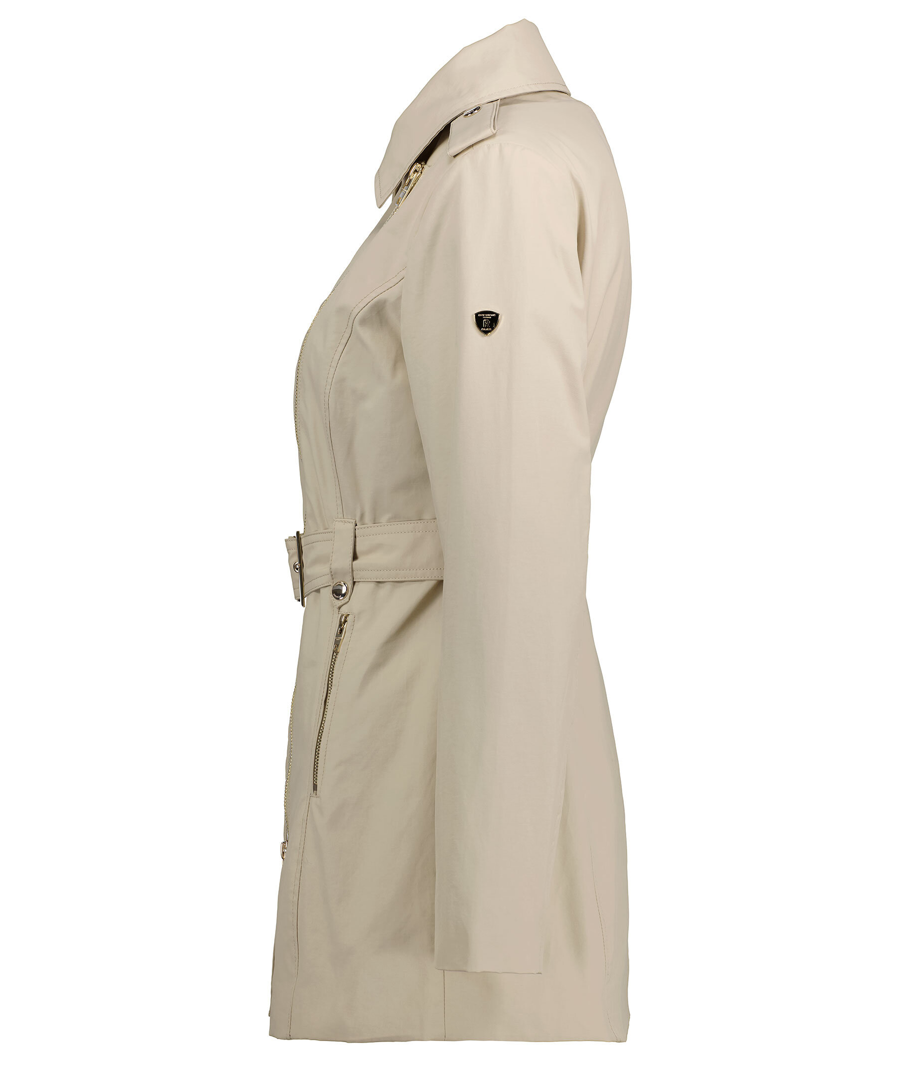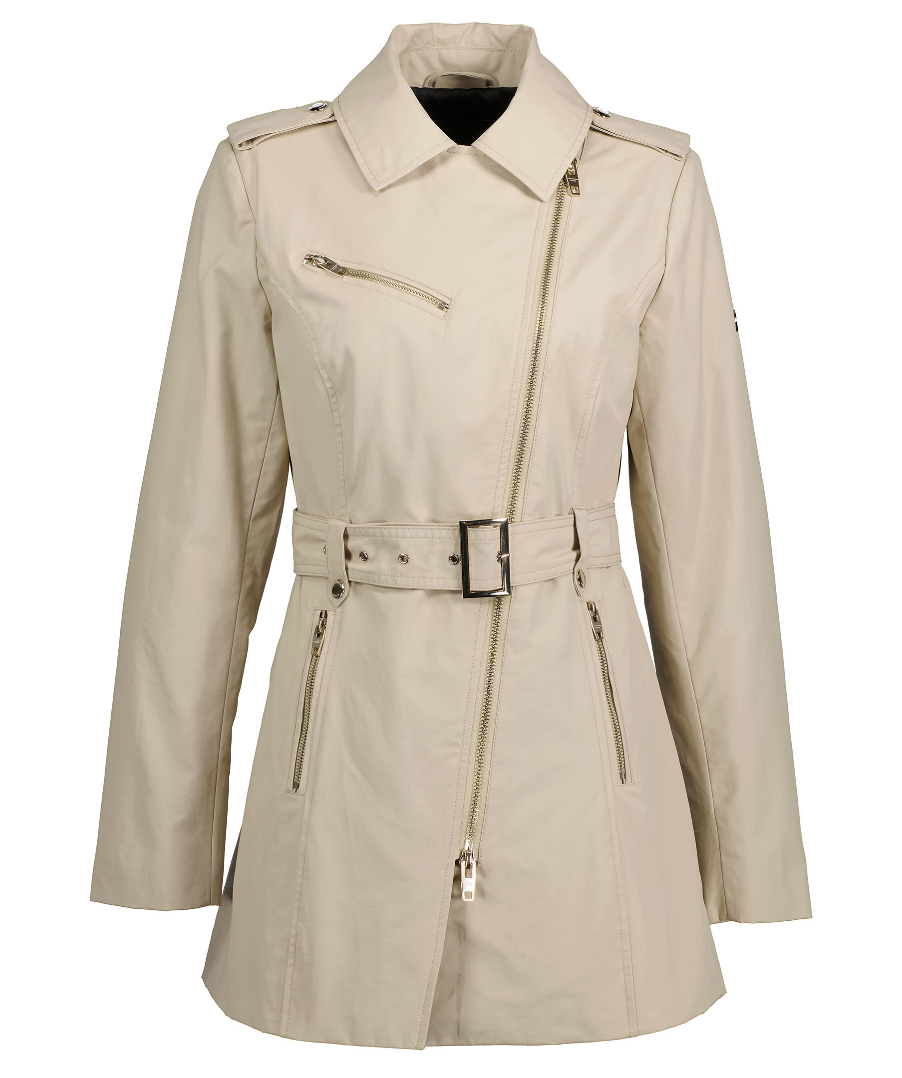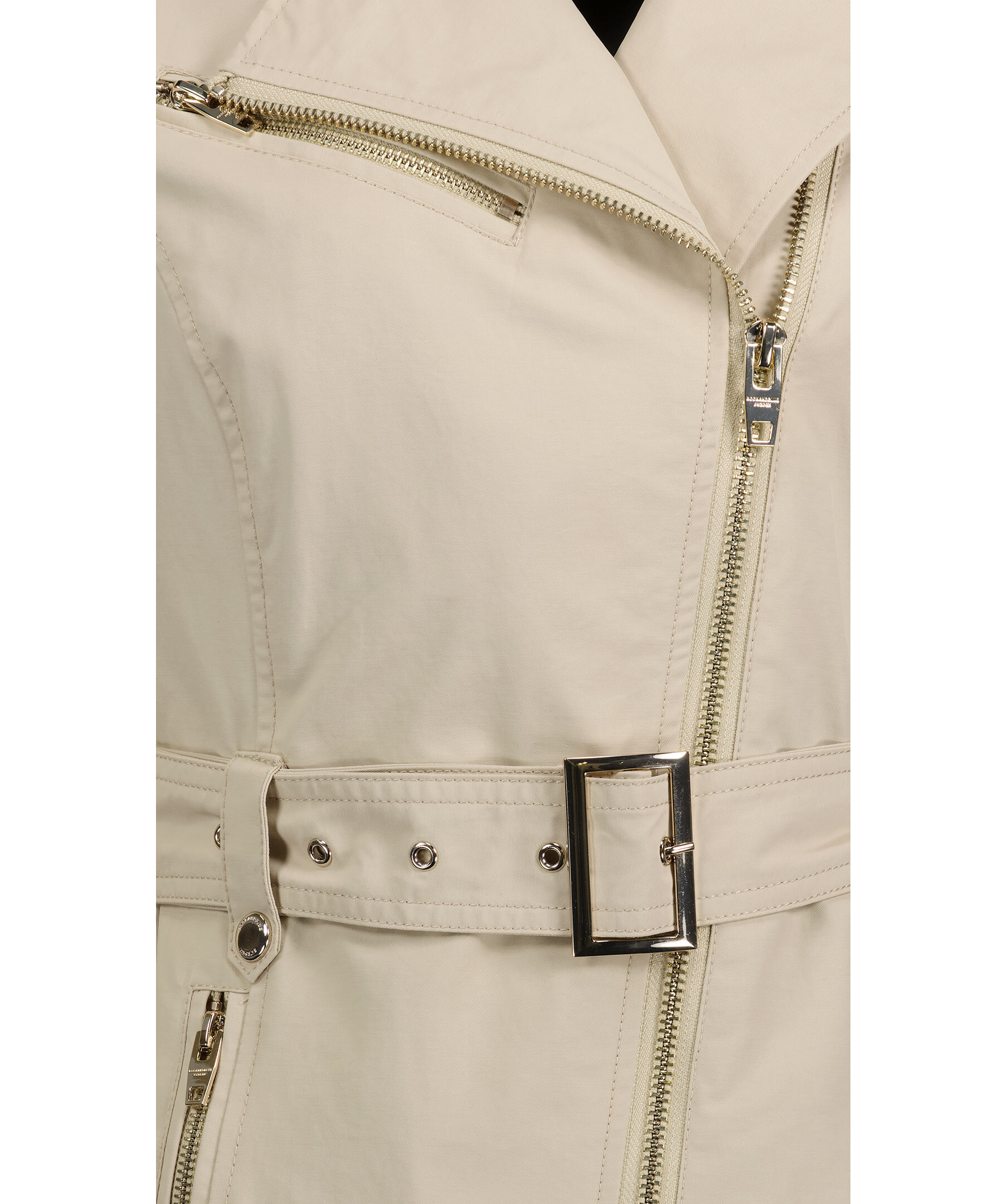 Beige trenchcoat i en lätt figursydd modell från Rockandblue. Slutar mitt på låret, har en spetsig krage och har knäppning med guldfärgad dragkeja. Spänne med guldfärgad tryckknapp på båda axlarna, justerbart, avtagbart bälte i midjan. Framfickor med guldfärgad dragkedja, innerficka med dragkedja och metallbricka med logotyp på vänster ärm. Svart foder.