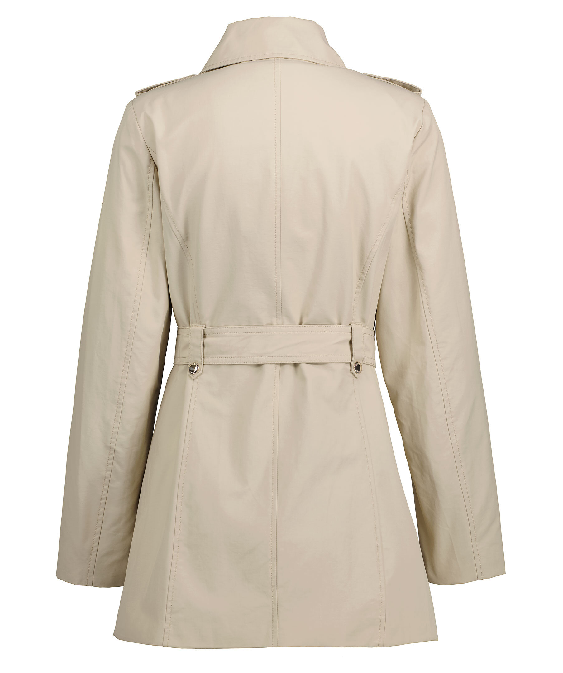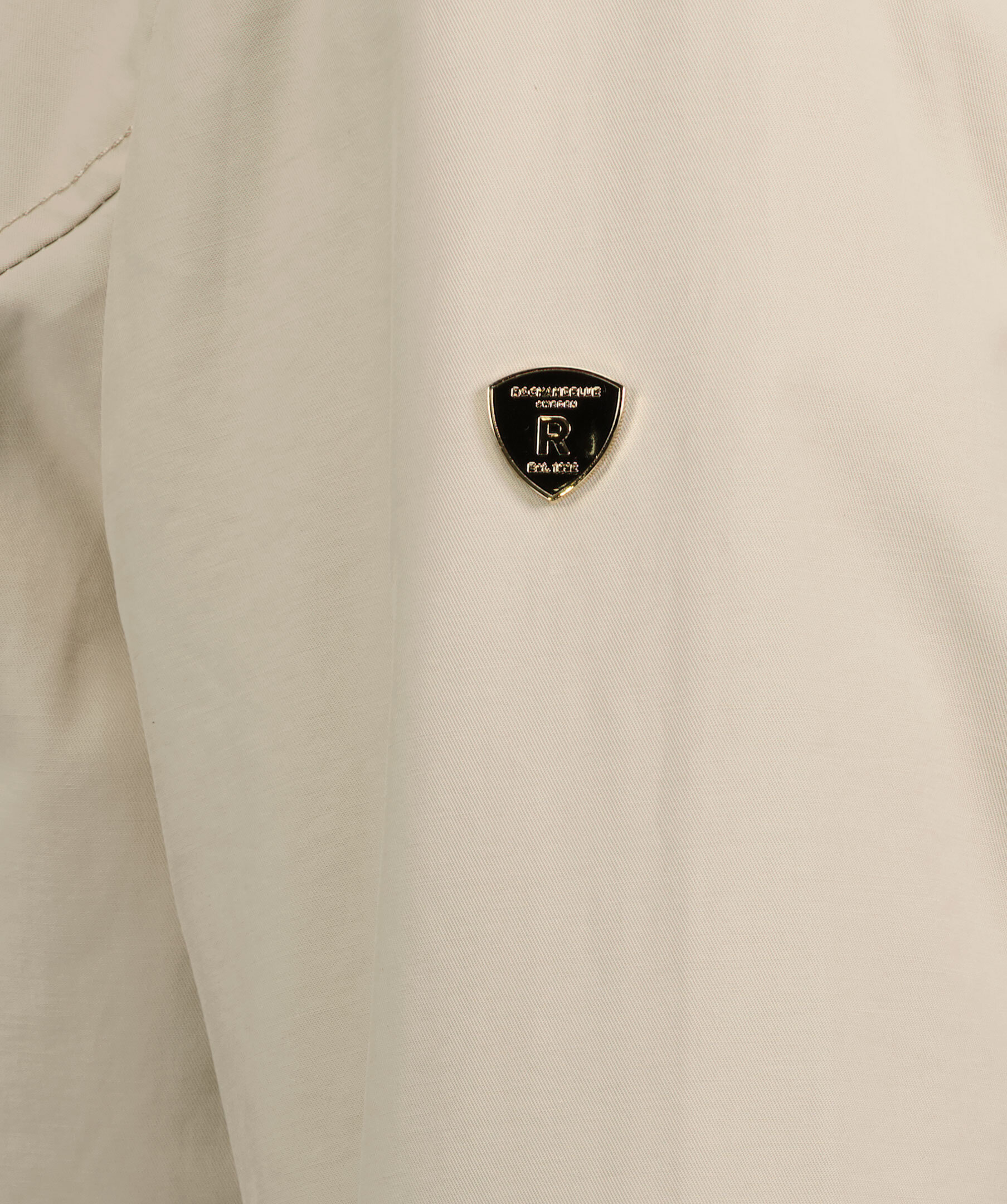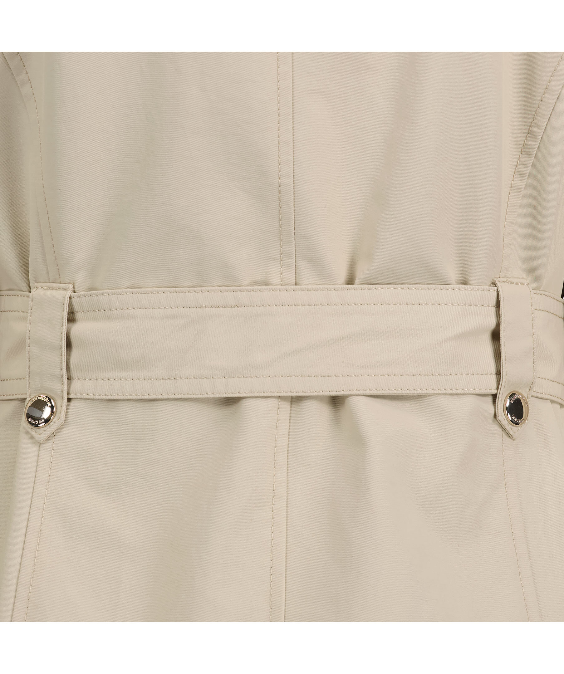 Beige trenchcoat i en lätt figursydd modell från Rockandblue. Slutar mitt på låret, har en spetsig krage och har knäppning med guldfärgad dragkeja. Spänne med guldfärgad tryckknapp på båda axlarna, justerbart, avtagbart bälte i midjan. Framfickor med guldfärgad dragkedja, innerficka med dragkedja och metallbricka med logotyp på vänster ärm. Svart foder.