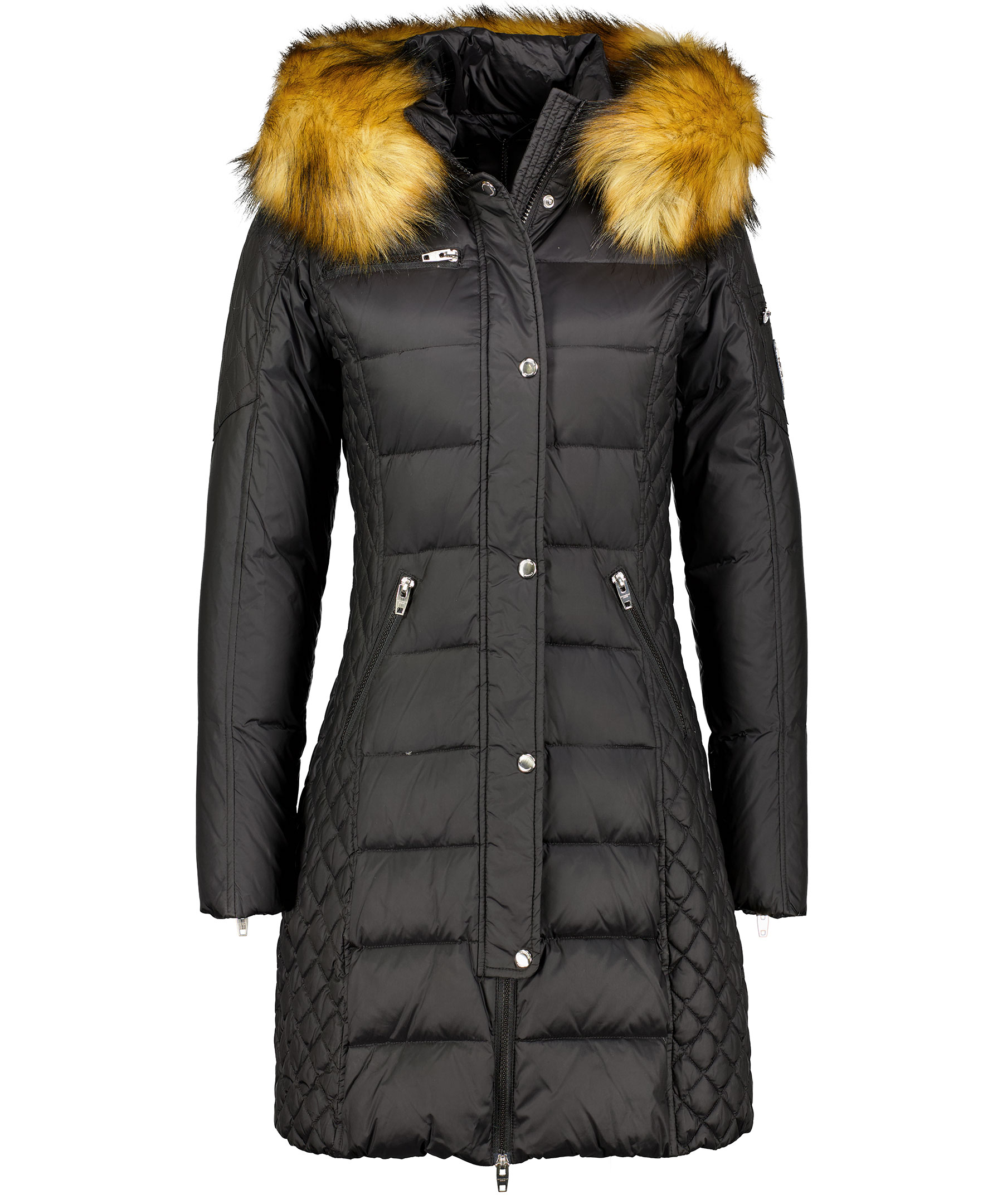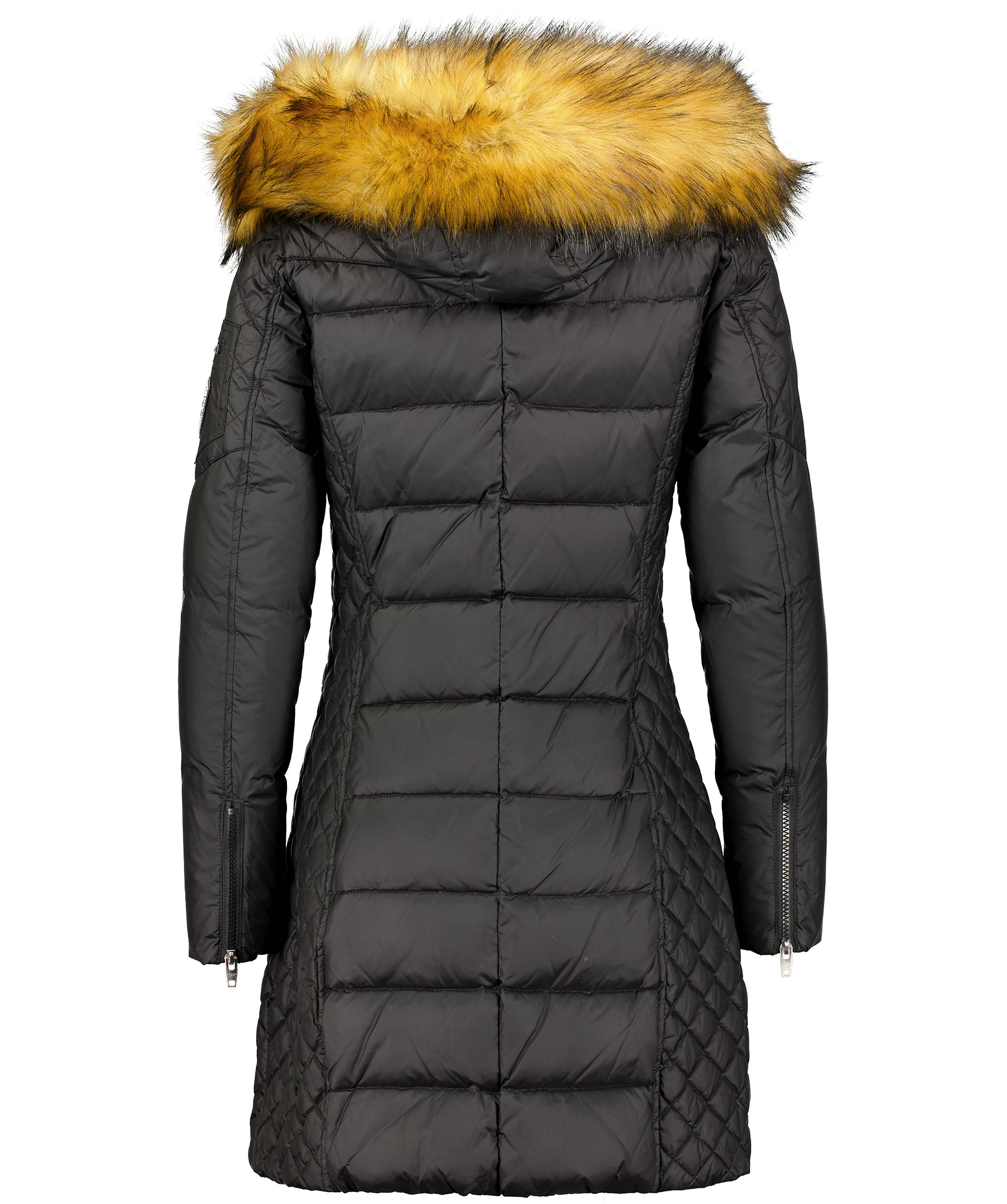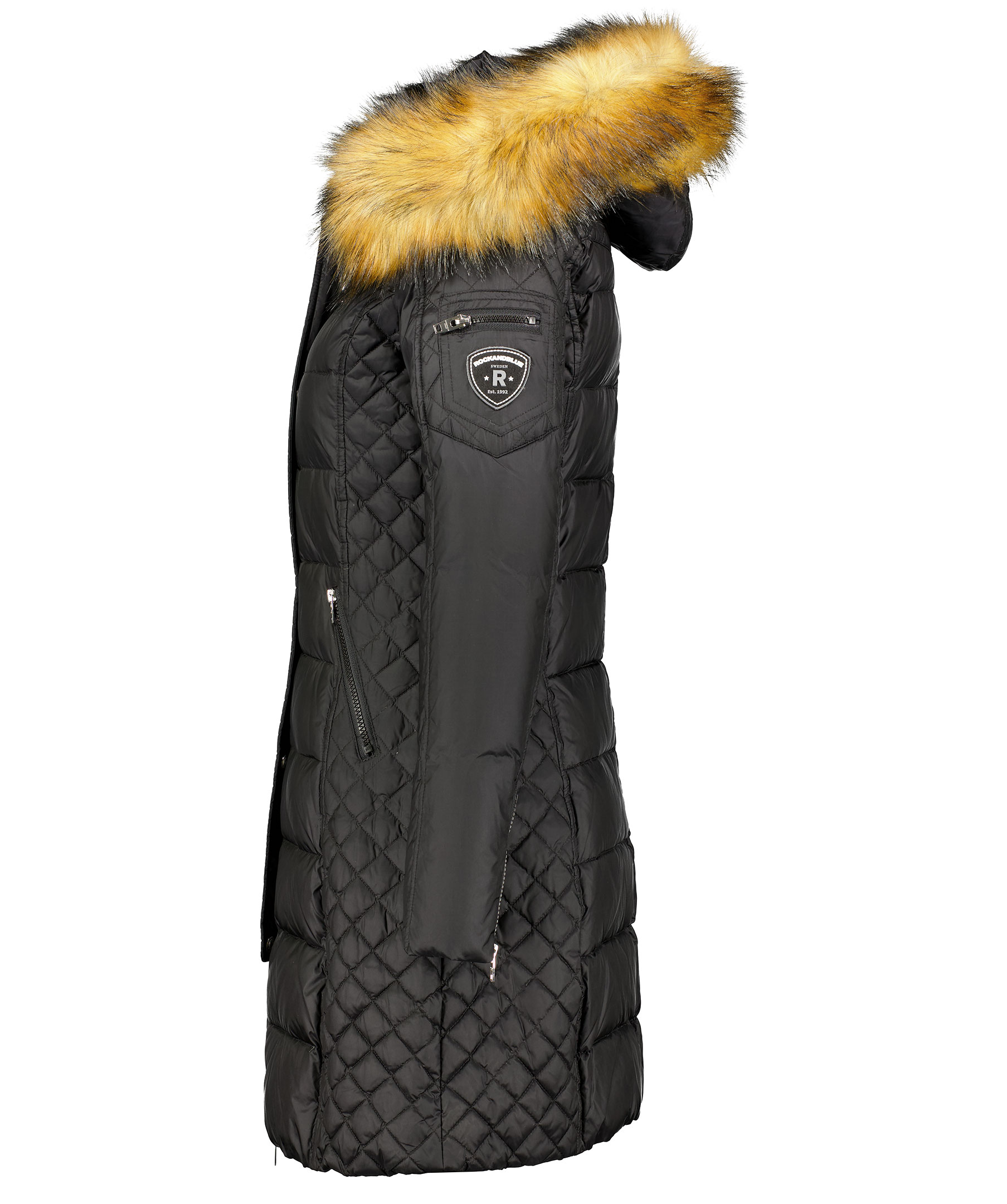 Svart dunjacka från Rockandblue i lång modell. Tre fickor fram, ficka och logga på vänster ärm, avtagbar luva med konstpäls, två innerfickor. Yttertyg i nylon och dunfyllning.