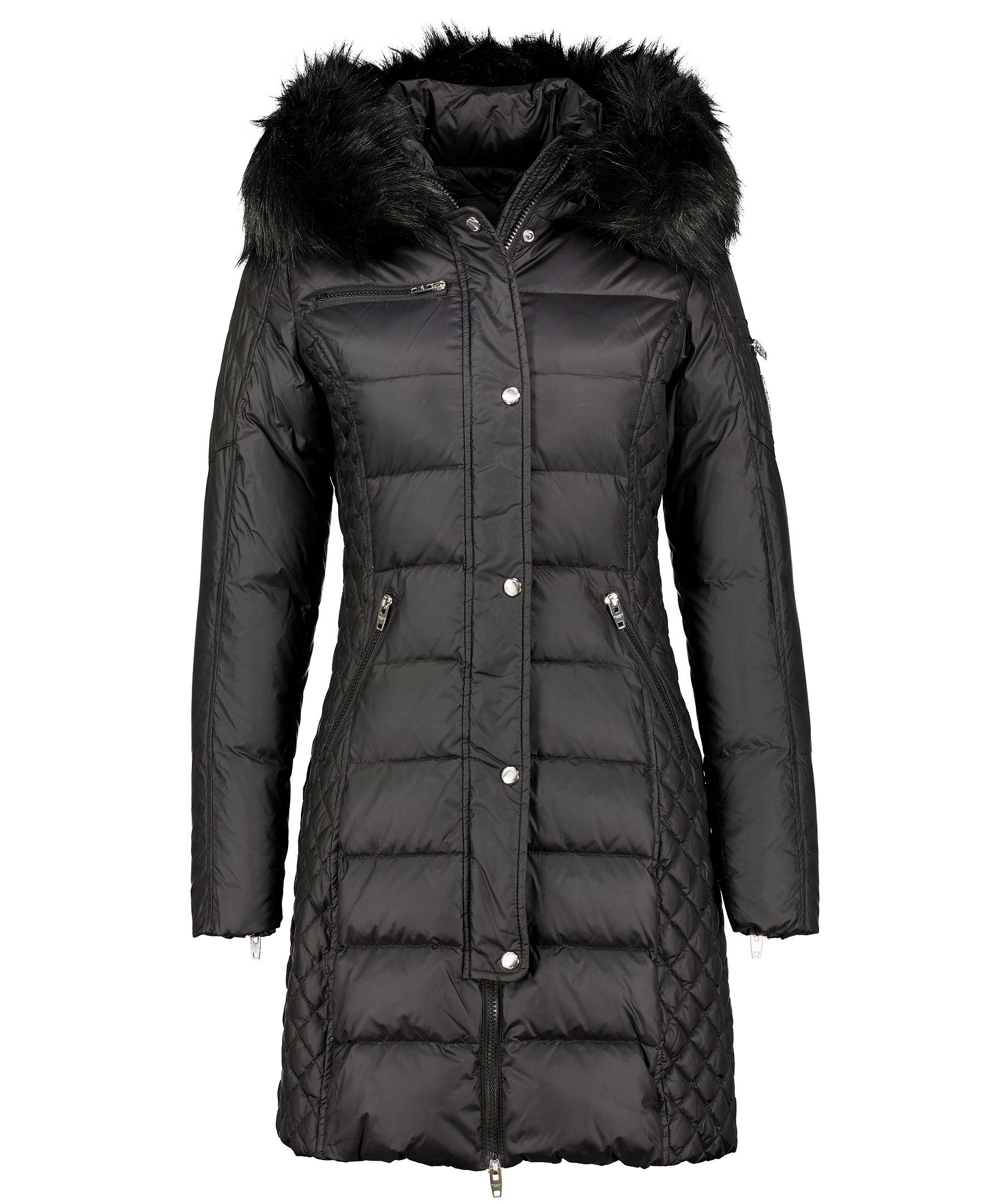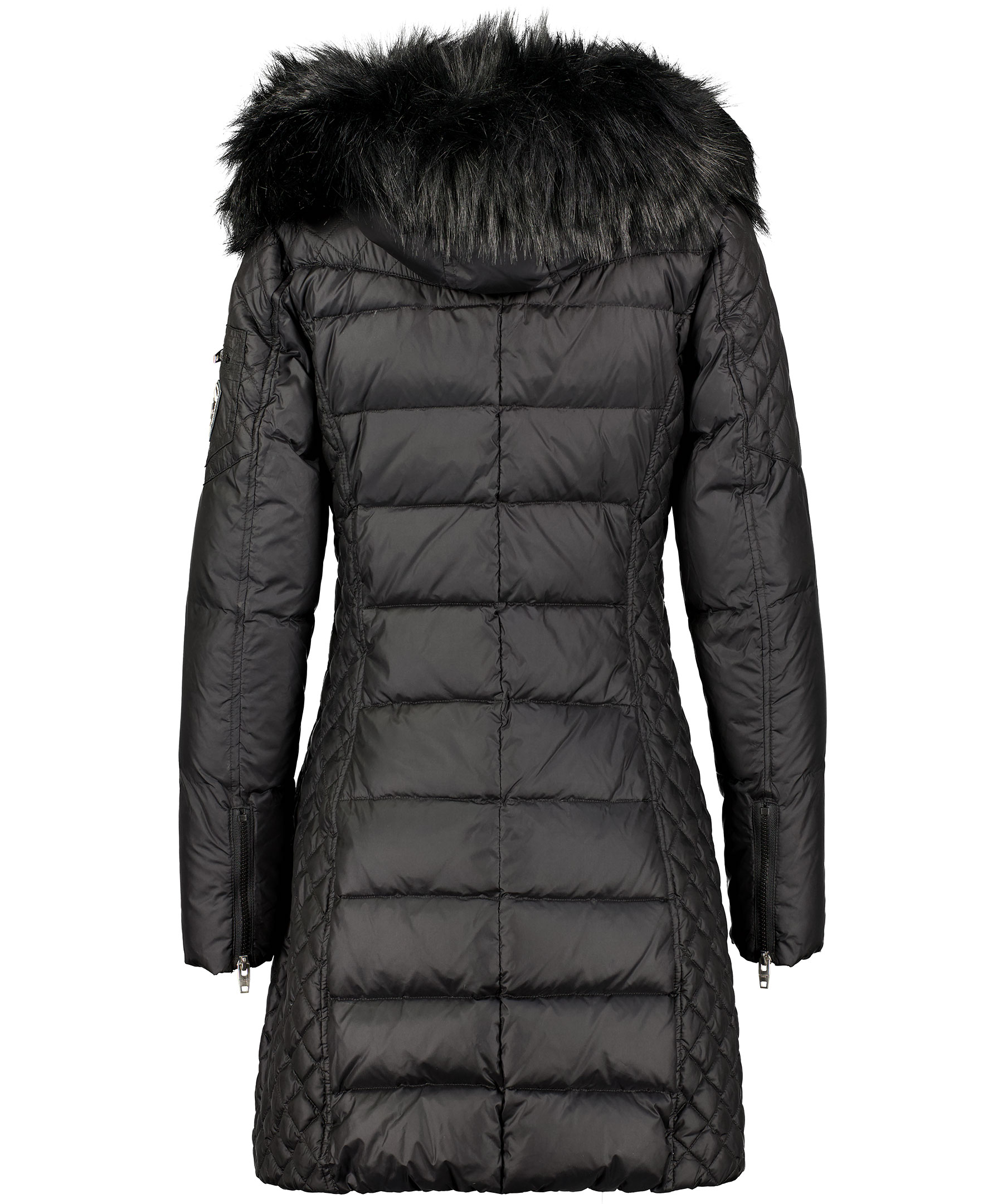 Svart dunjacka från Rockandblue i lång modell. Tre fickor fram, ficka och logga på vänster ärm, avtagbar luva med konstpäls, två innerfickor. Yttertyg i nylon och dunfyllning.
