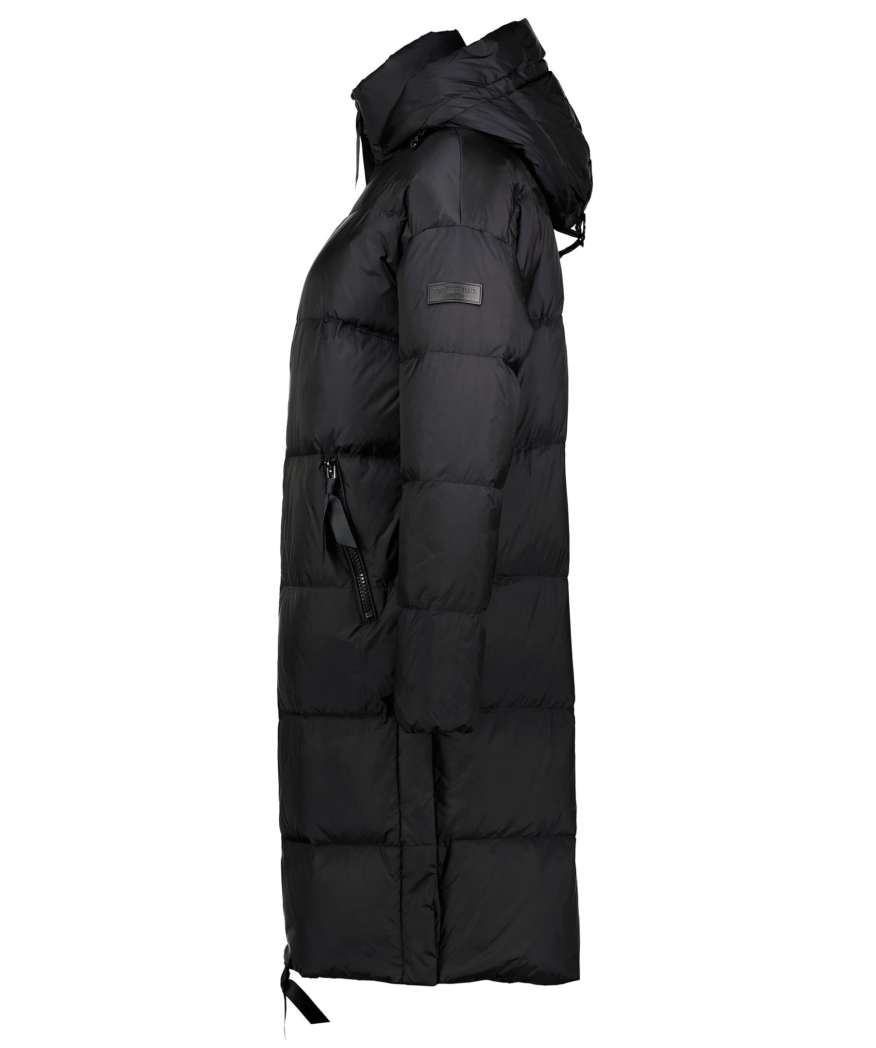 Svart dunjacka från Rockandblue i lång modell. Normal i storlek med passform som är något oversize. Två fickor fram och en innerficka. Stängs med tvåvägsdragkedja och tryckknappar. Logga i läder på vänster ärm, avtagbar luva och hög krage. Yttertyg i nylon och har ett foder i dun.