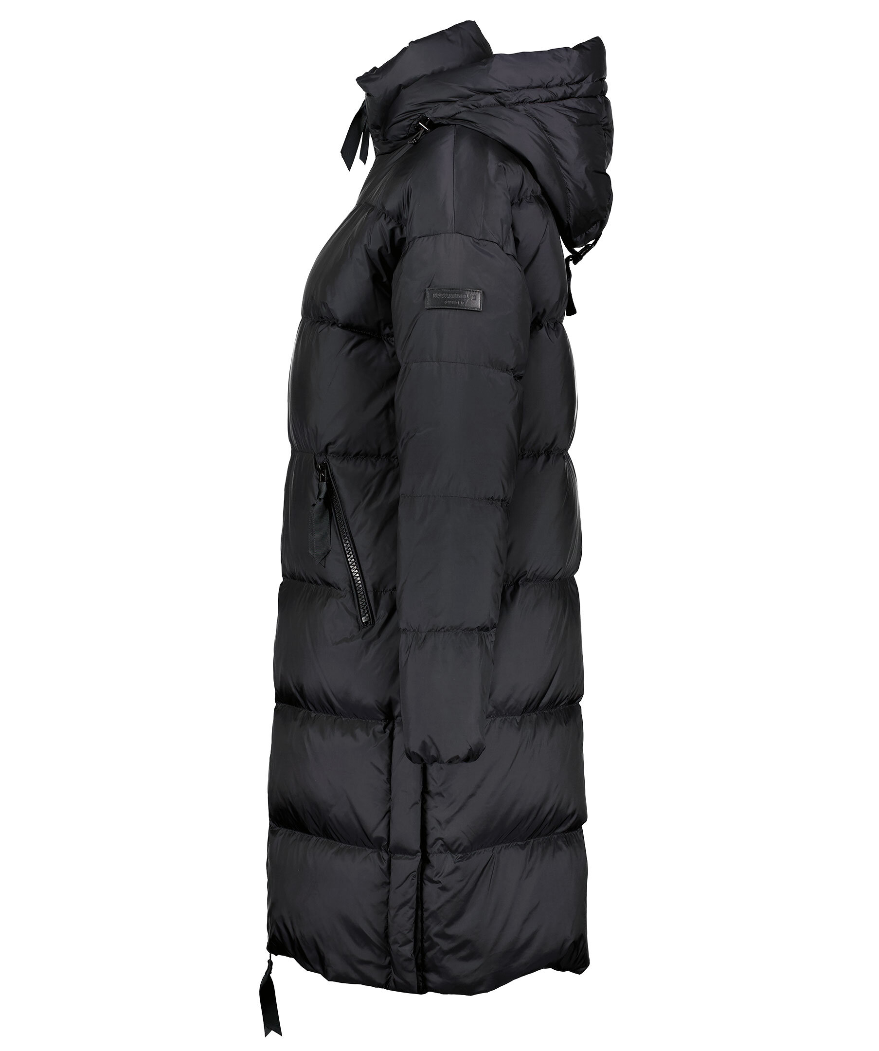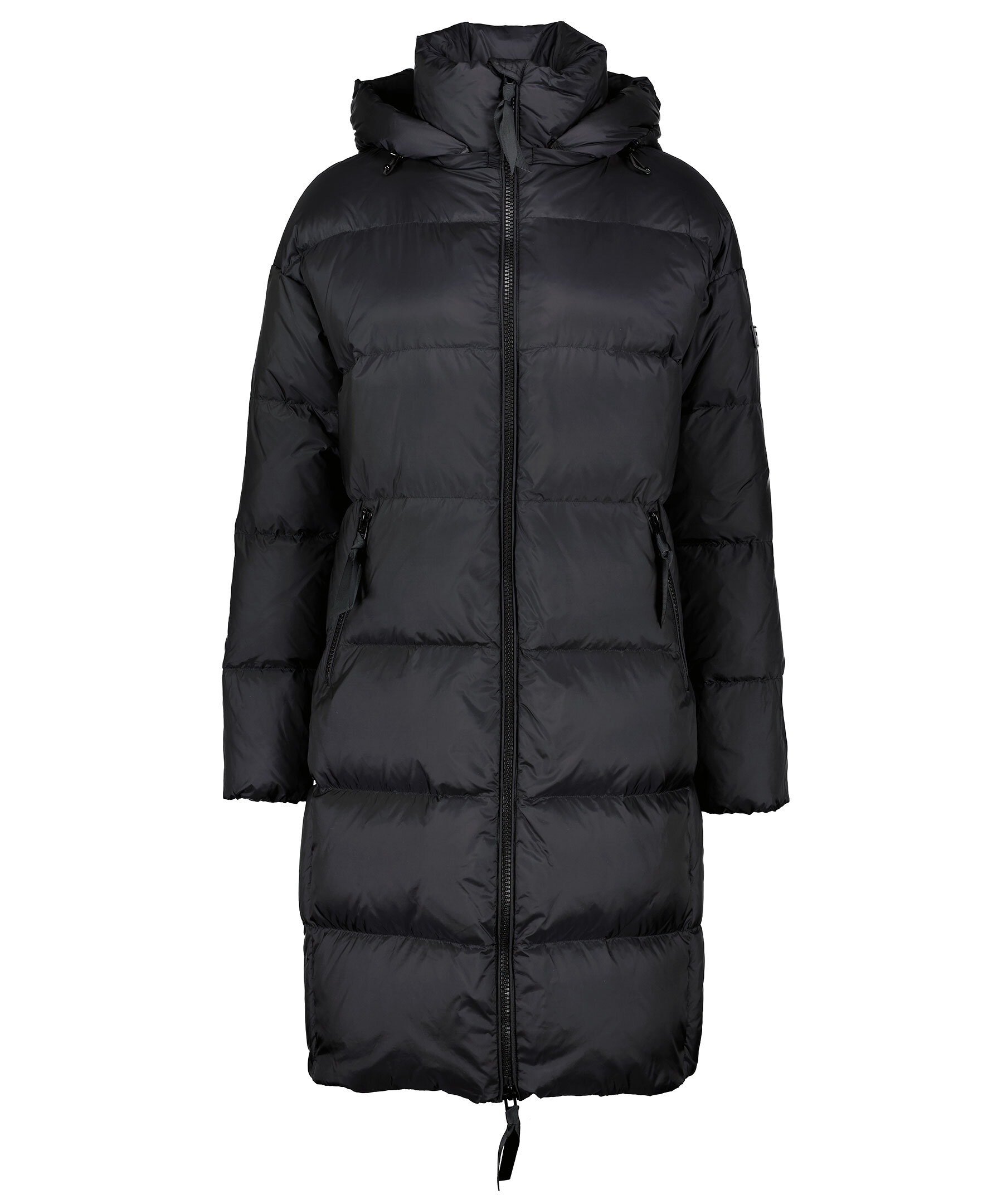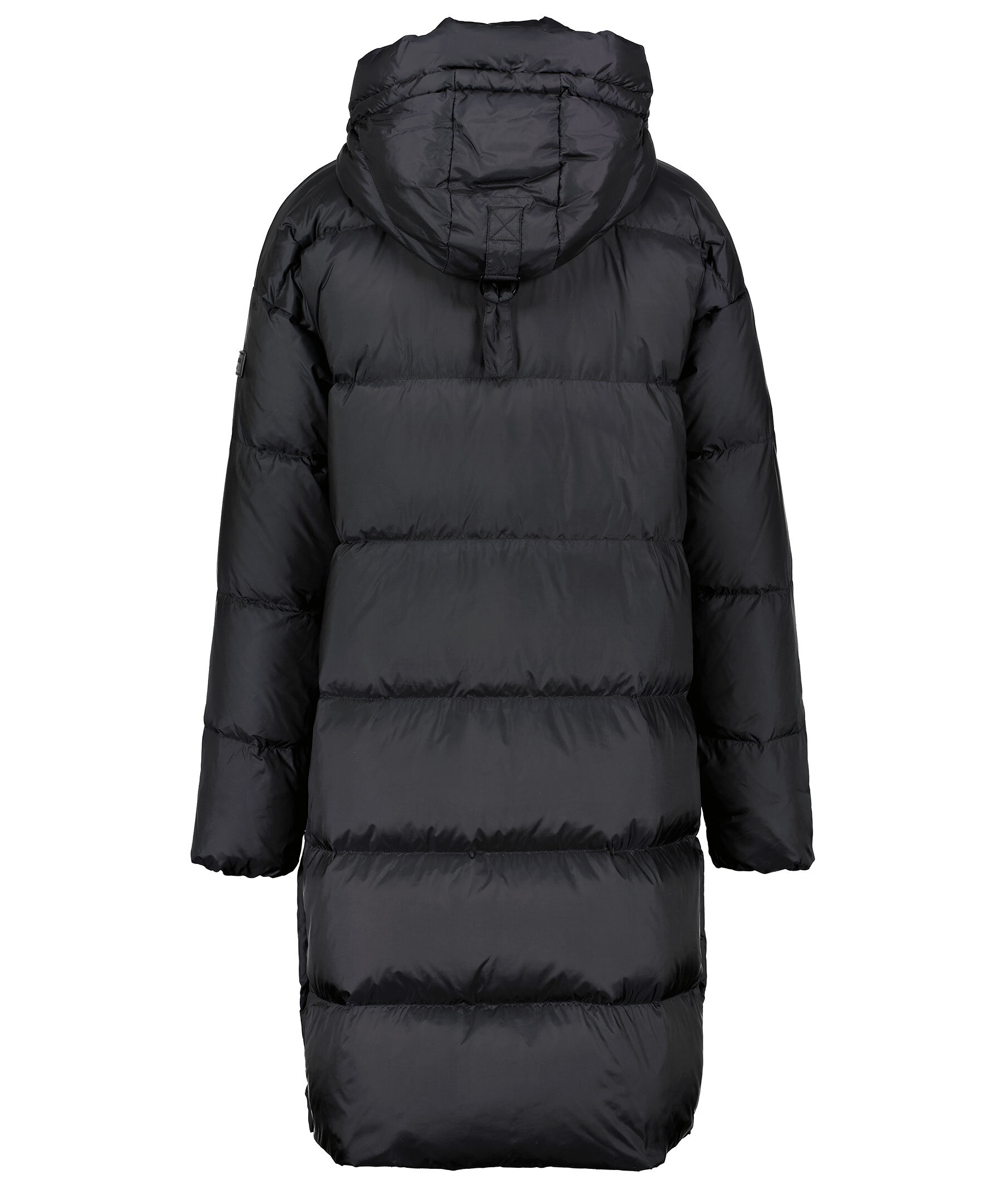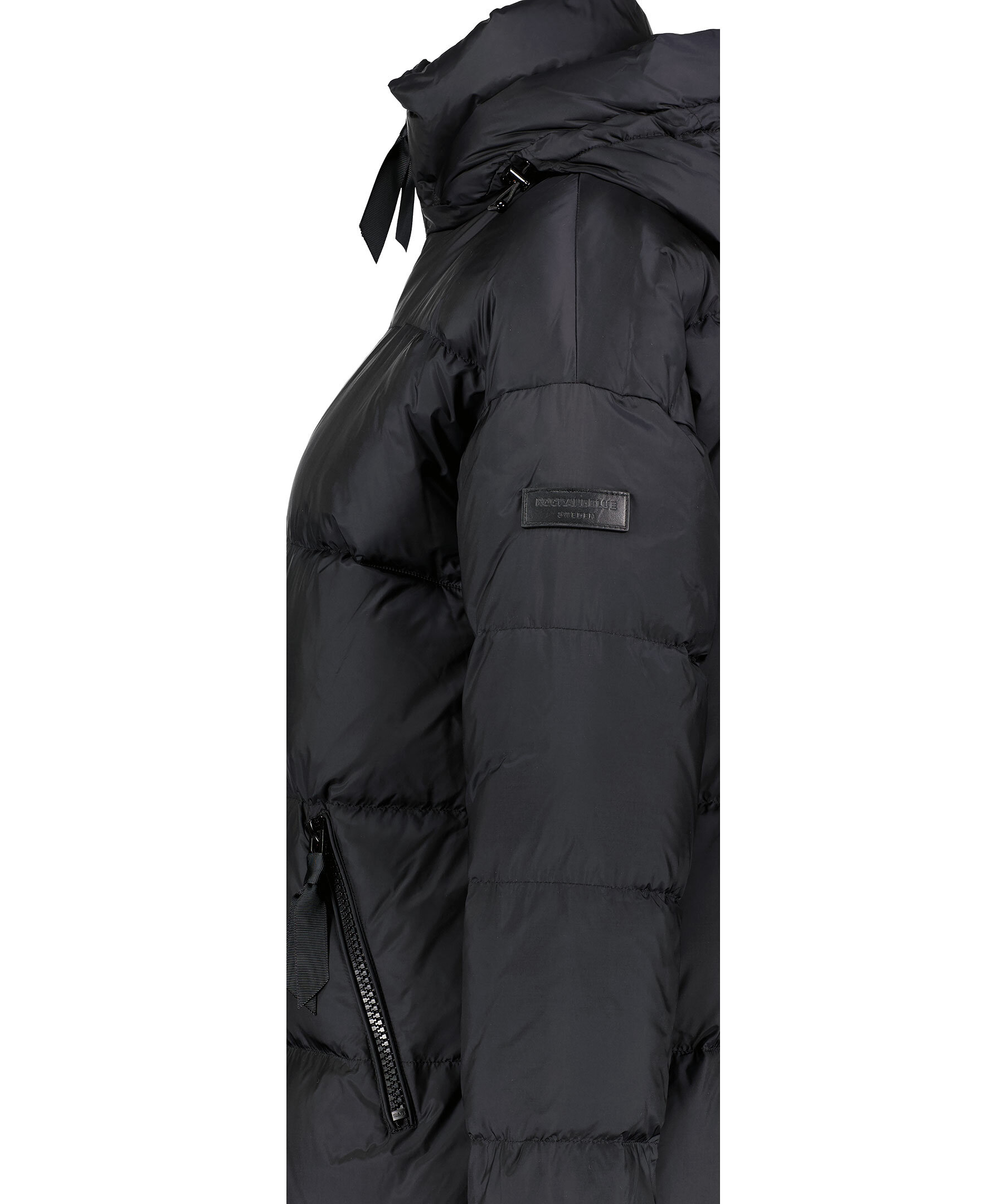 Svart dunjacka från Rockandblue i lång modell. Normal i storlek med passform som är något oversize. Två fickor fram och en innerficka. Stängs med tvåvägsdragkedja och tryckknappar. Logga i läder på vänster ärm, avtagbar luva och hög krage. Yttertyg i nylon och har ett foder i dun.