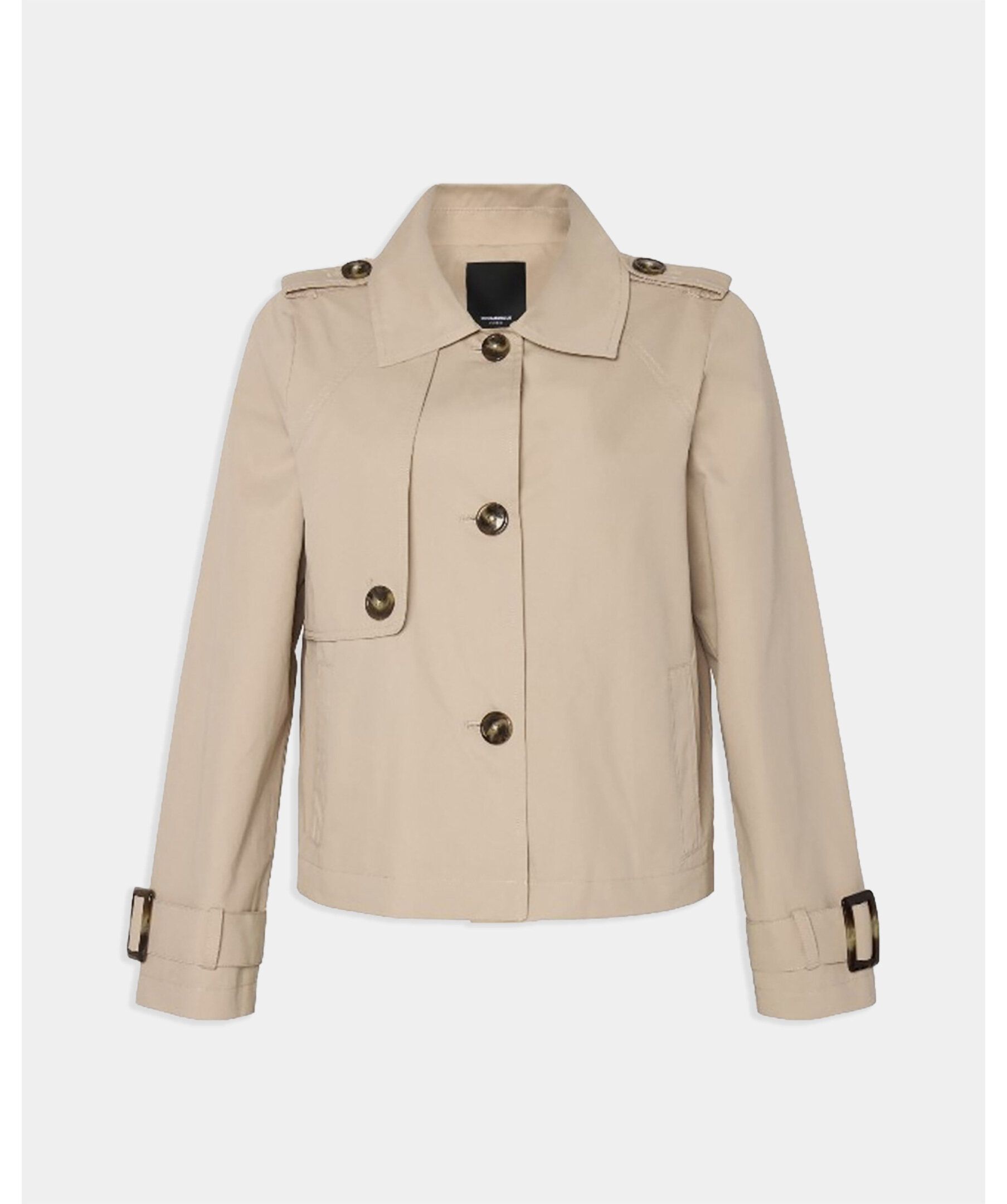 Beige vårjacka från Rockandblue. Jackan är gjord i en beskuren trench-stil och stängs med knappar framtill. Den har elegant skjortkrage, statement-knappar och signaturdetaljer med stormflikar, justerbara manschettremmarna och axelepauler. Tillverkad i en bomullsblandning.
