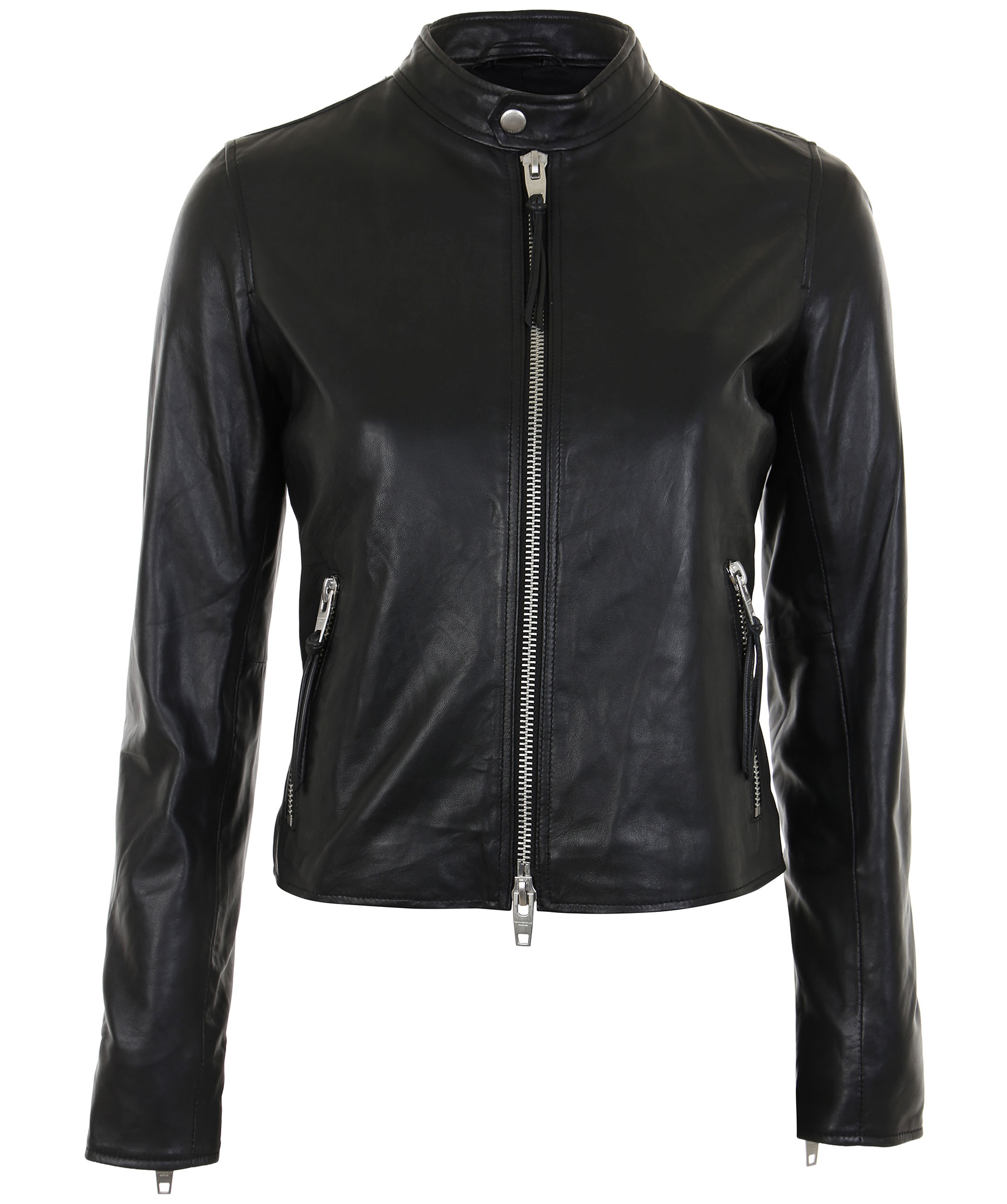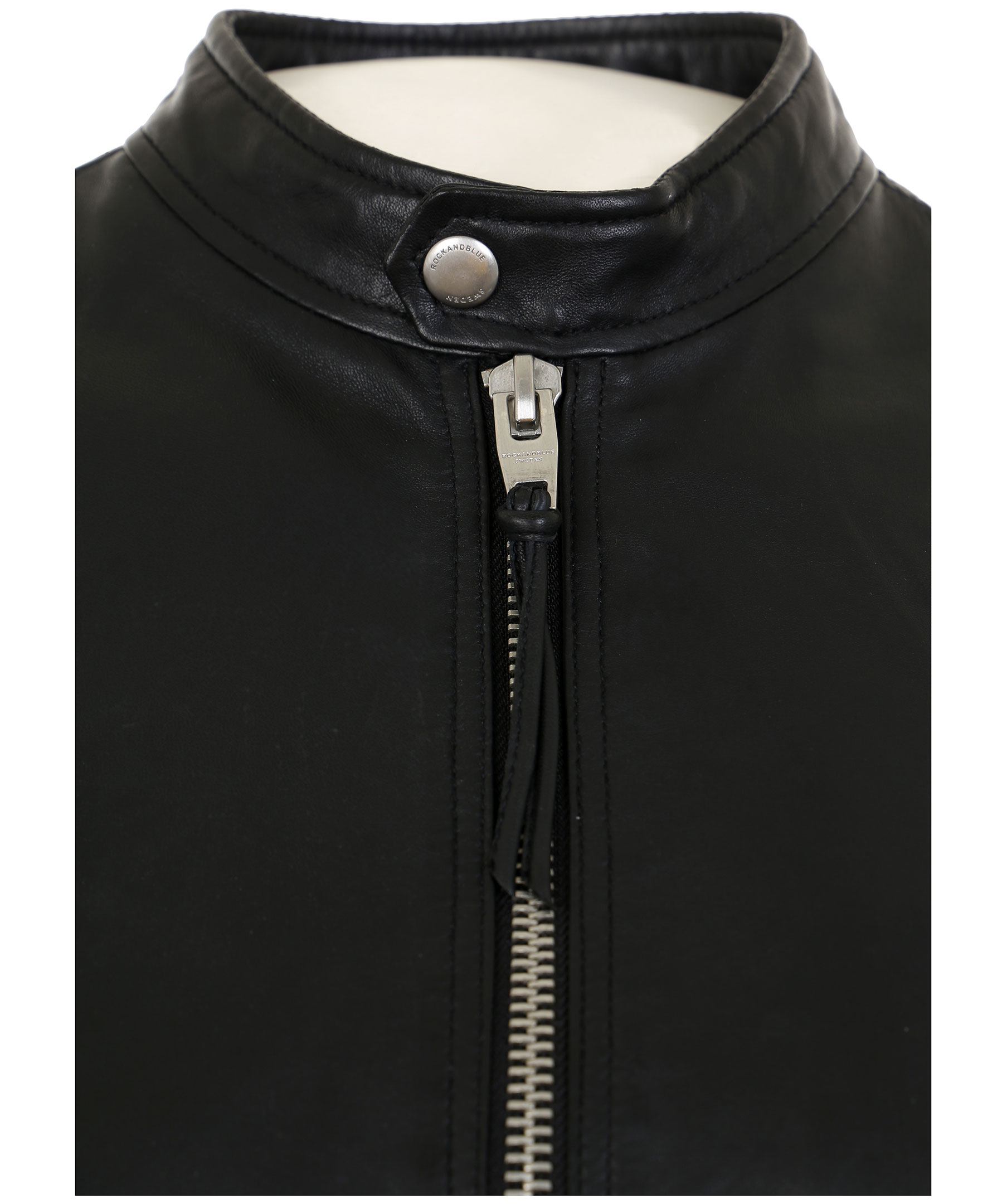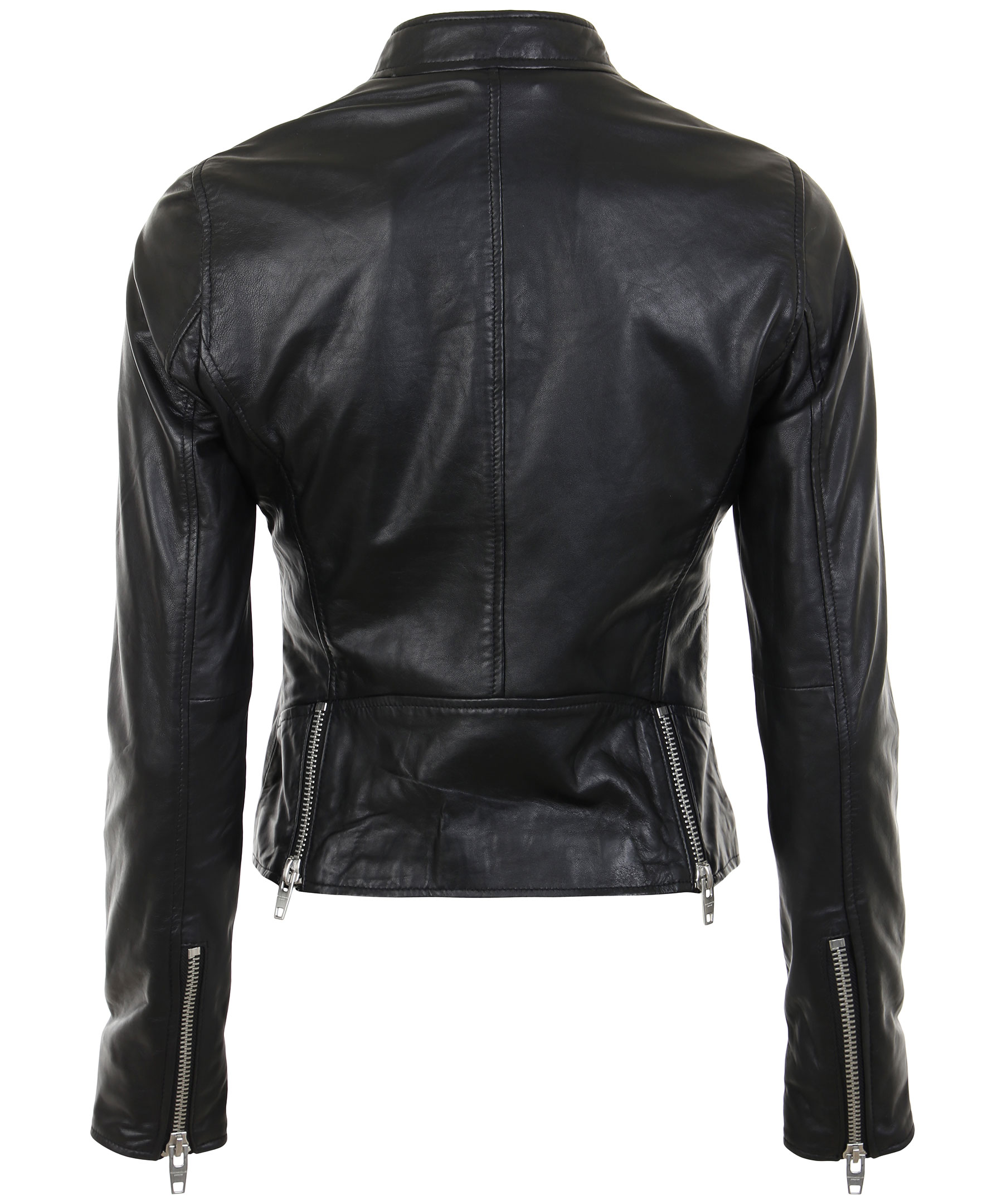 Svart, tunn jacka i äkta skinn från svenska Rockandblue. Jackan har två fickor fram, en innerficka samt dubbelt sprund bak. Ärmarna pryds av dragkedjor framtill och kragen stängs med knapp.