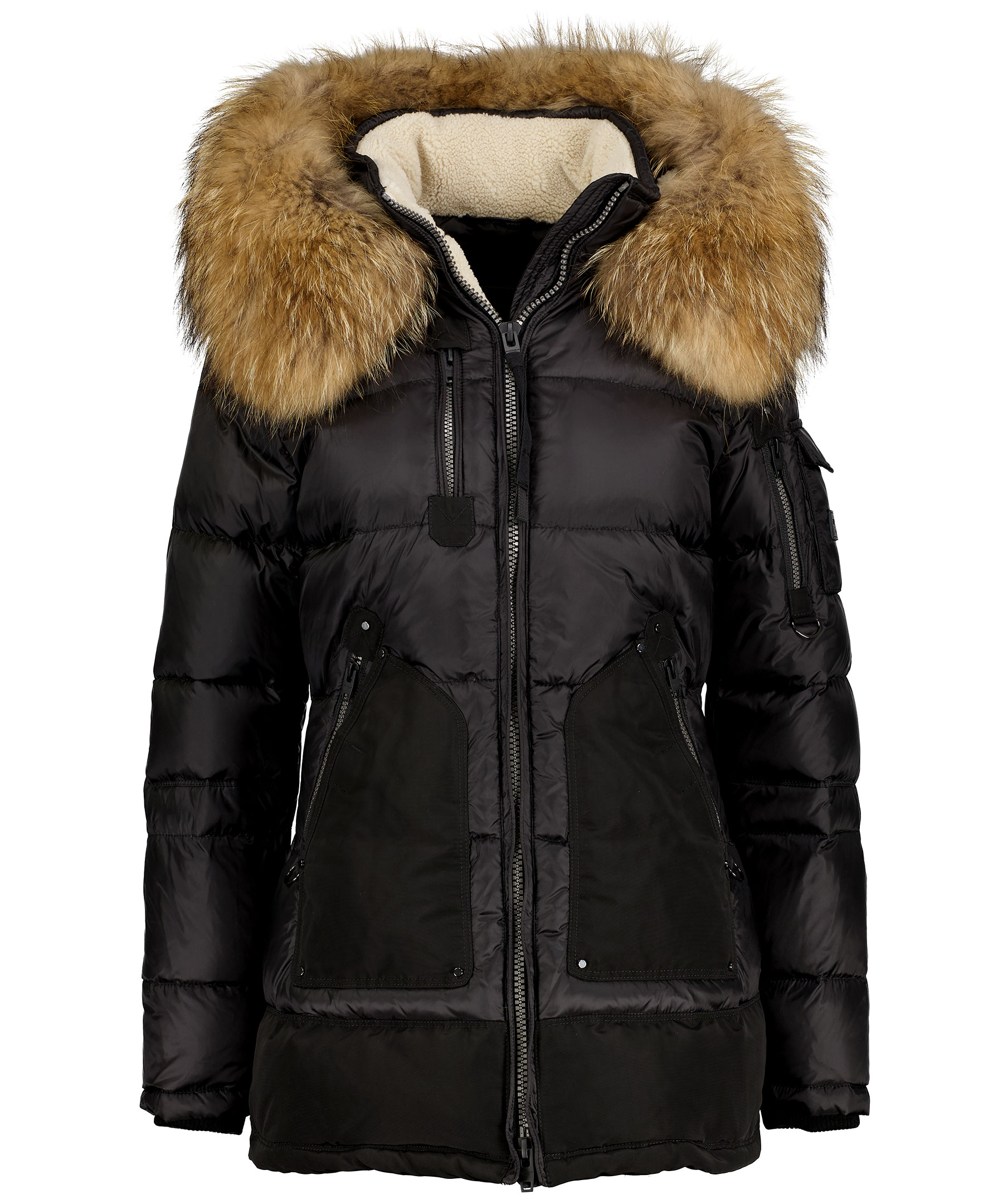 * Tvåväsdragkedja * Avtagbar krage i naturpäls * Tio fickor