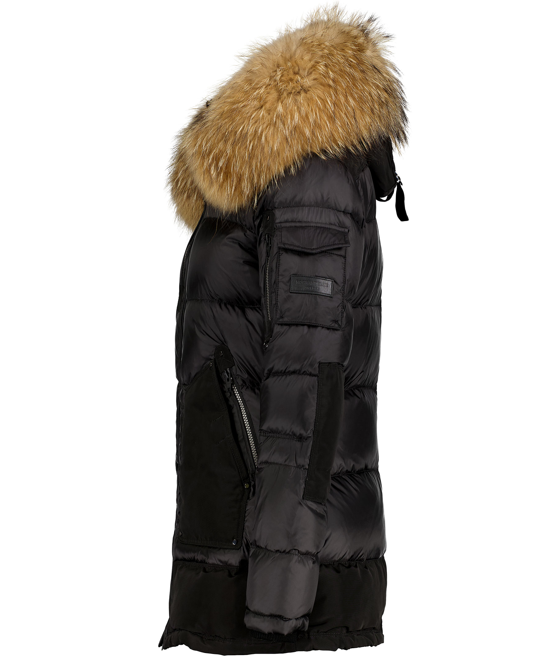 Svart, dunjacka i längre modell från Rockandblue. Luva med avtagbar pälskrage i beige naturpäls. På insidan av luvans kant och på insidan av kragen finns vitt teddytyg. Fyra framfickor, två med tryckknapp samt två bakom dessa med dragkedja, en bröstficka med dragkedja och fyra innerfickor, två med dragkedja. Dold mudd i ärmslut och två fickor på vänster ärm, en med dragkedja och en med ficklock och tryckknapp. Ovanpå fickorna på ärmen finns en svart patch med logotyp. Jackan stängs med tvåvägsdragkedja och har dragsko i midja och i plaggslut. Yttermaterial i polyester. TIPS! Ånga pälsen för att få den stor och fluffig. OBS! Naturpälsar är unika och kan skilja sig från bilden.
