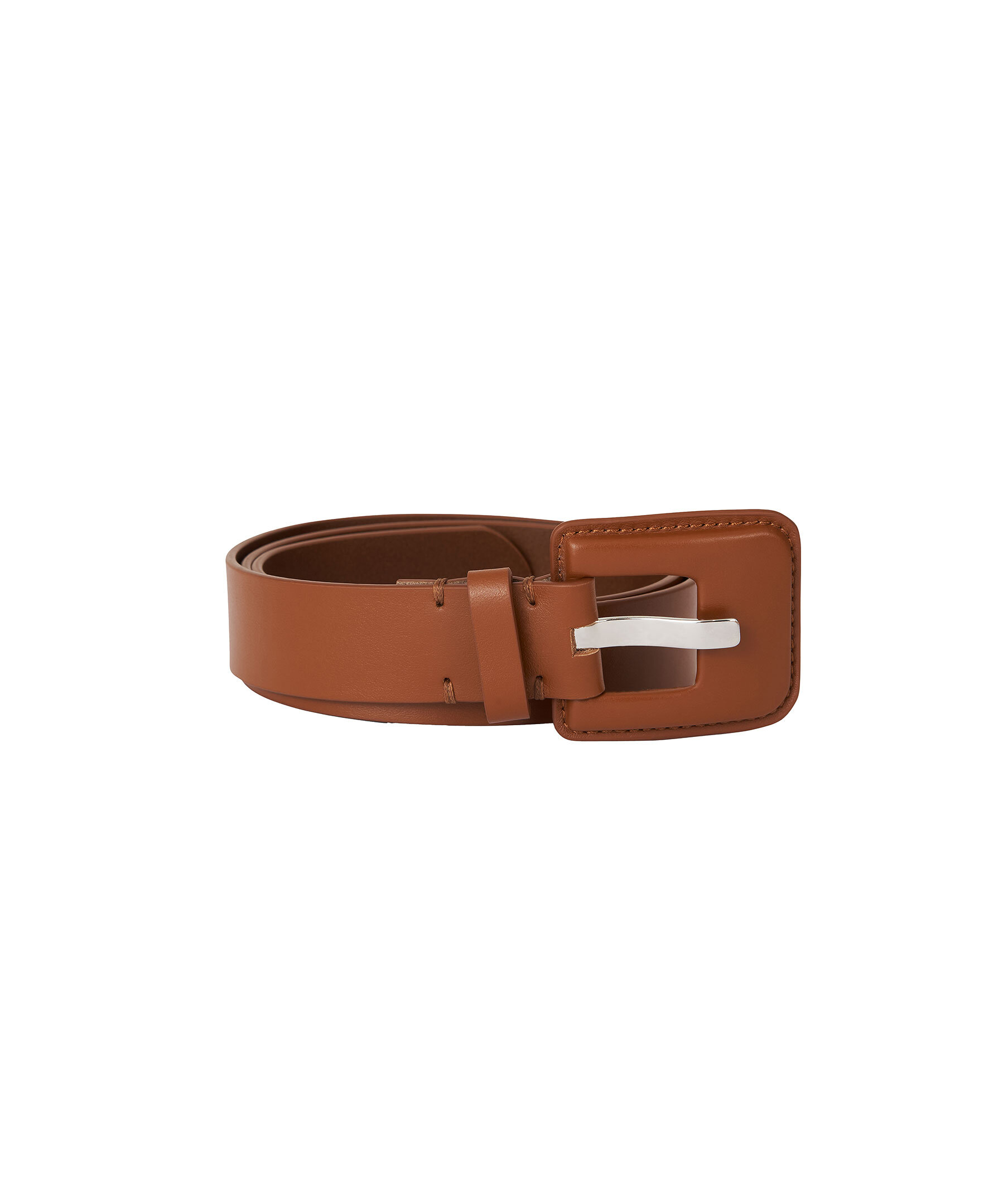 Brunt, stilrent läderbälte med ett spänne klätt i läder från Rodebjer. Det passar perfekt till alla dina byxor, eller välj en storlek mindre för att bära det runt midjan.
