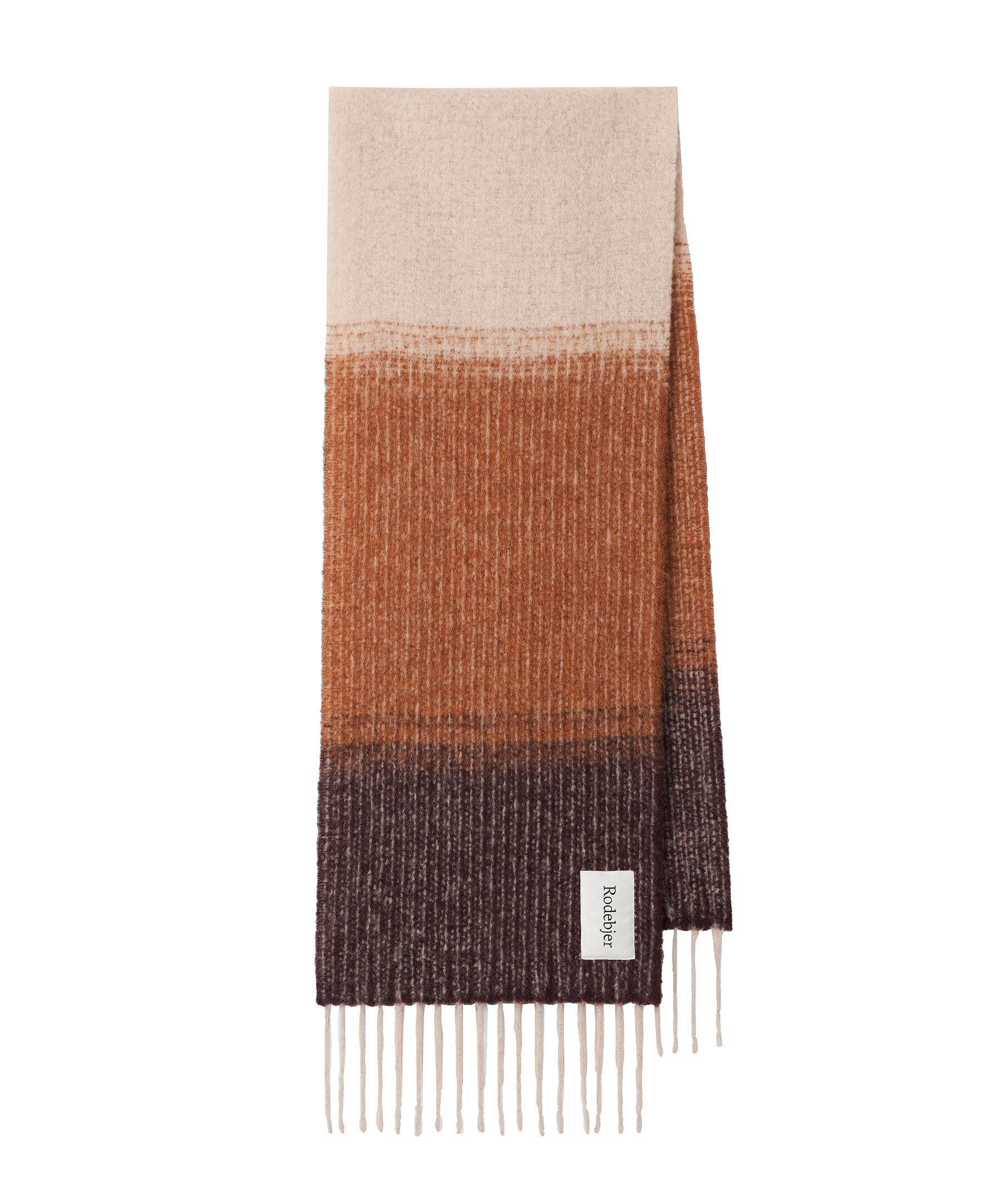 Karamellfärgad scarf från Rodebjer. Beau är en scarf med dégradé-effekt spunnen av en underbart mjuk borstad alpacka. Den är färdig med fransar och en Rodebjer-logga.