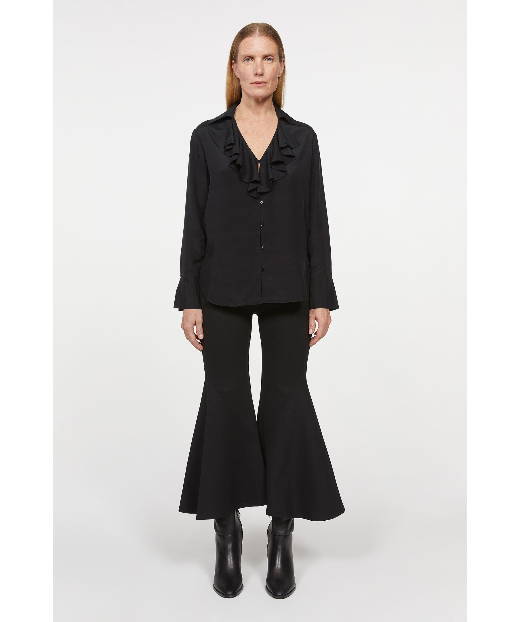 Svart långärmad blus från Rodebjer. Feminin blus med volangkant som ramar in blusens V-ringning. Den är skuren av en hållbar blandning av Tencel-tyg och FSC-certifierad viskos.