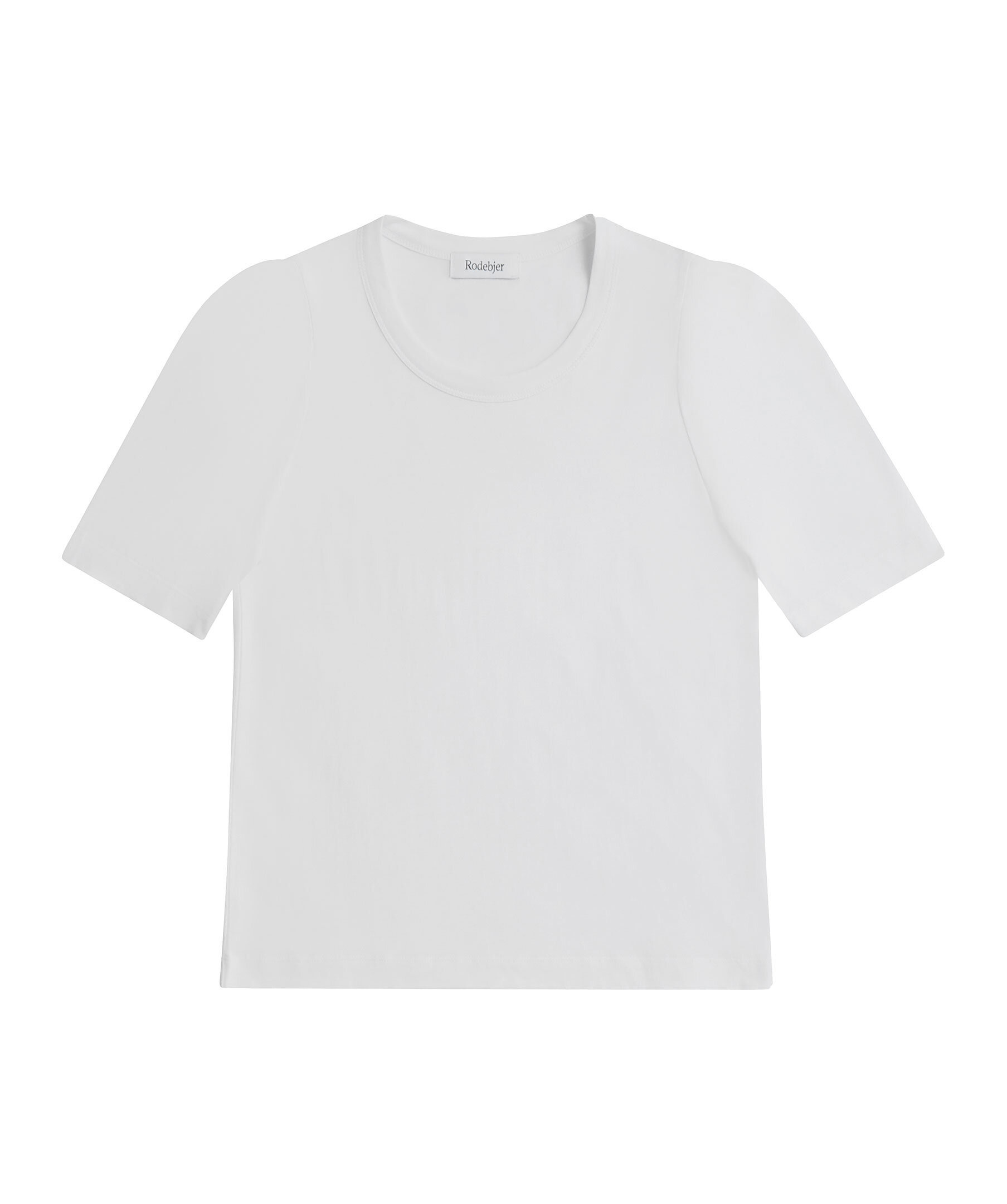 Vit t-shirt från Rodebjer med puffärmar. Ärmen slutar strax ovanför armbågen och har en rundad halsringning. Tillverkad i Lyocell och bomullsblandning.