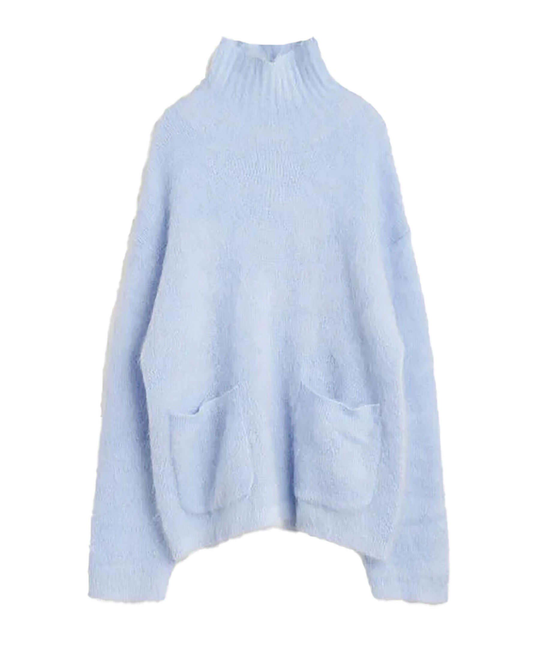 Ljusblå stickad polotröja i en avslappnad, oversized fit från rodebjer. Tröjan är spunnen av en borstad alpackablandning och har fickor fram.