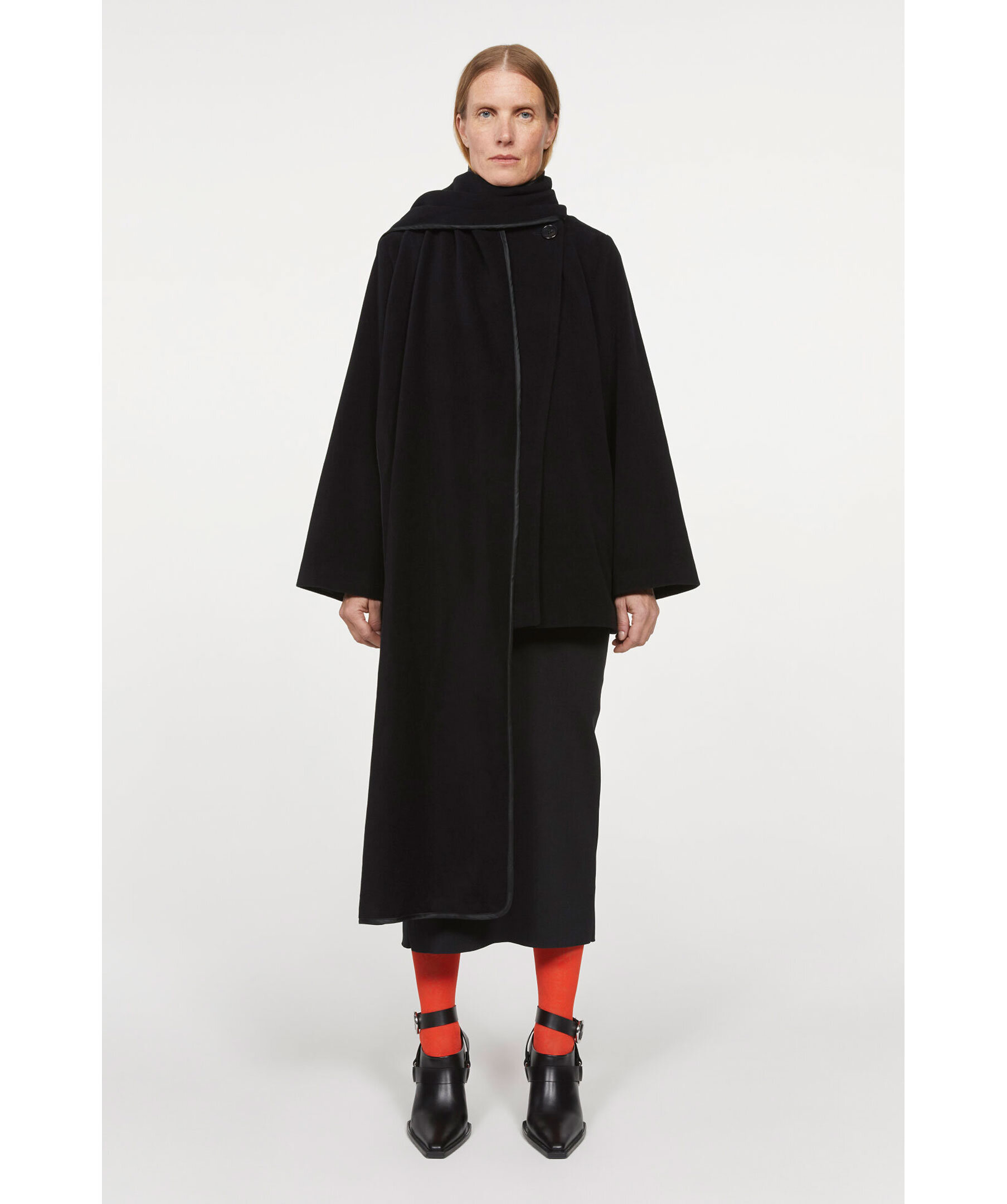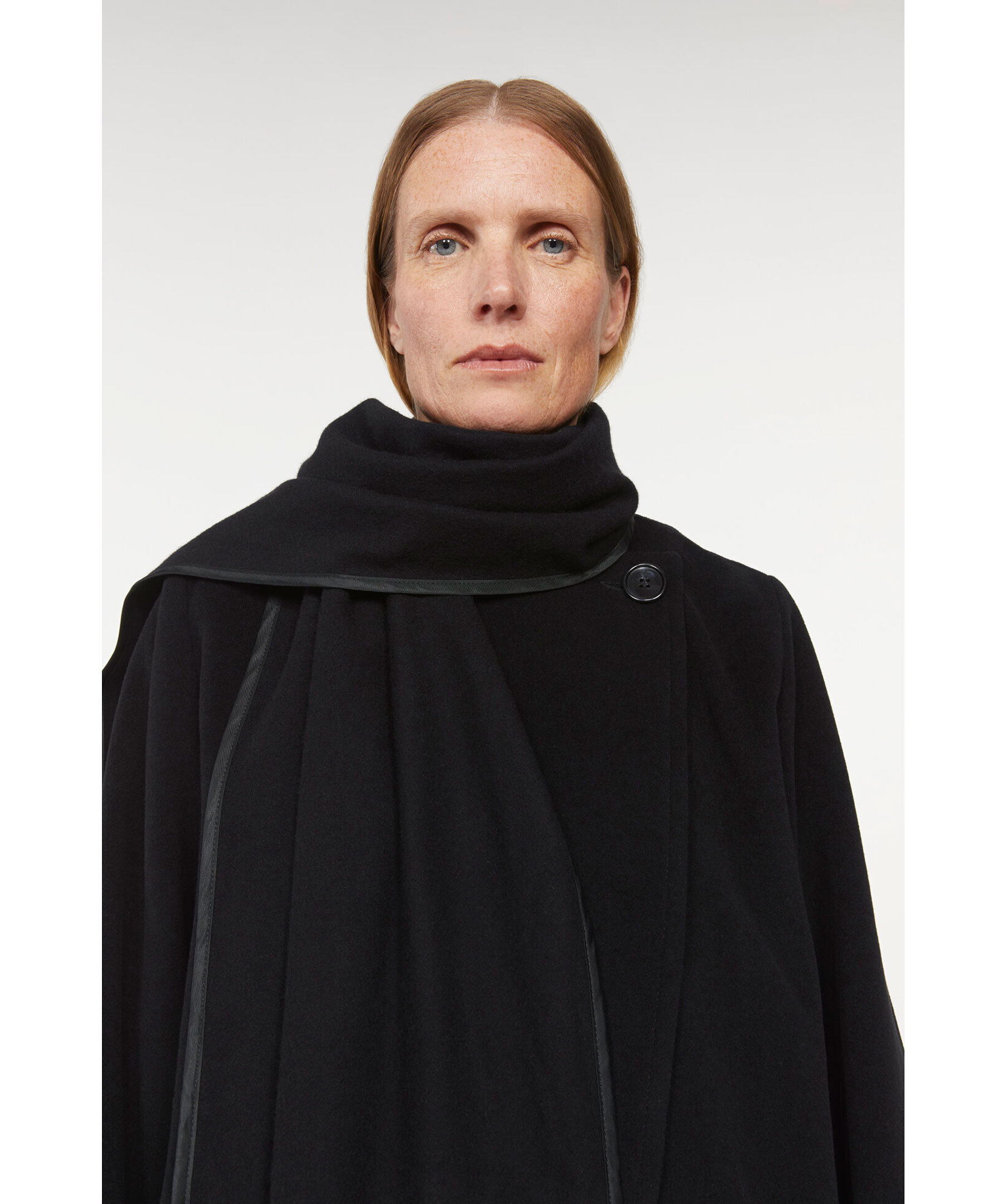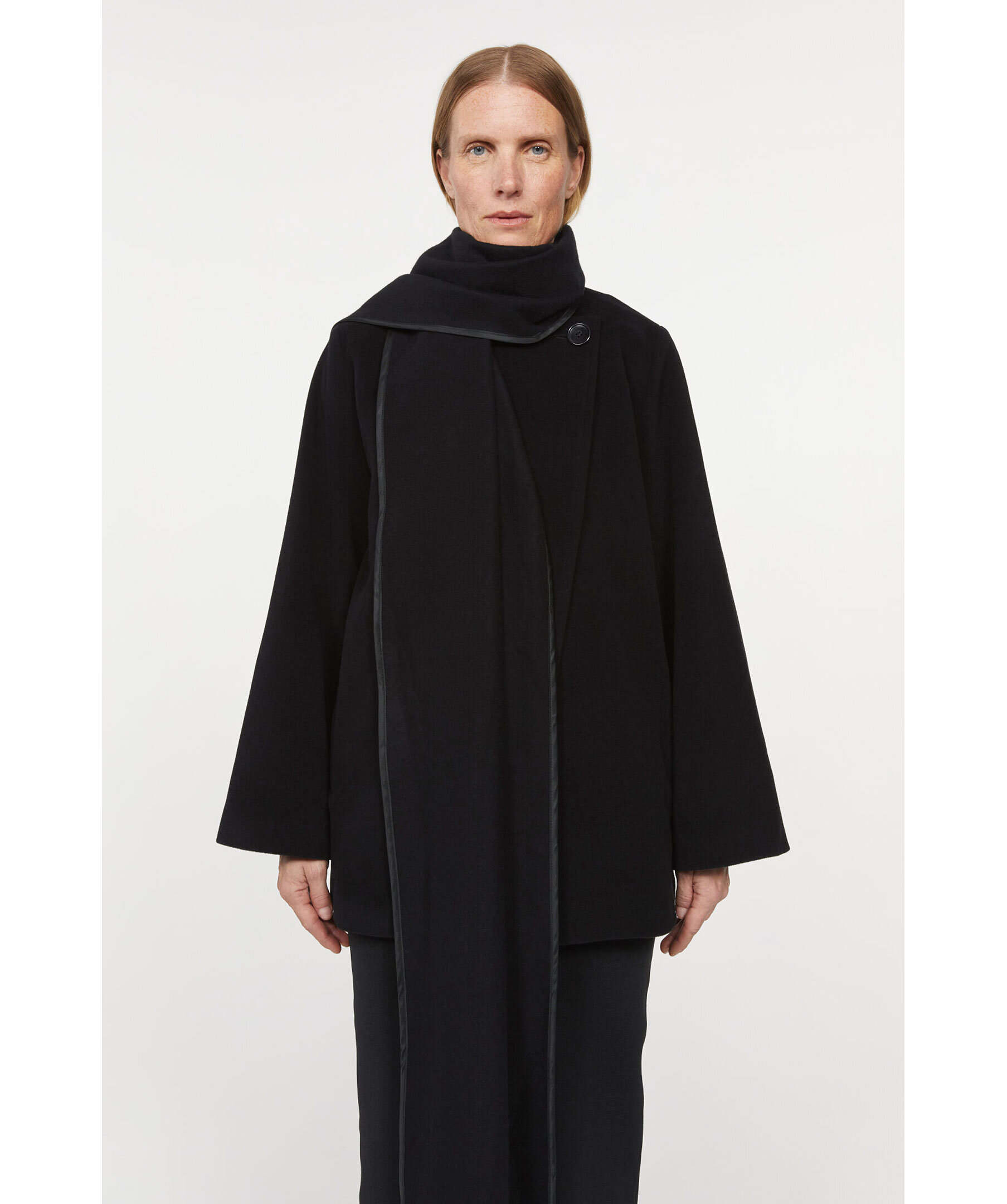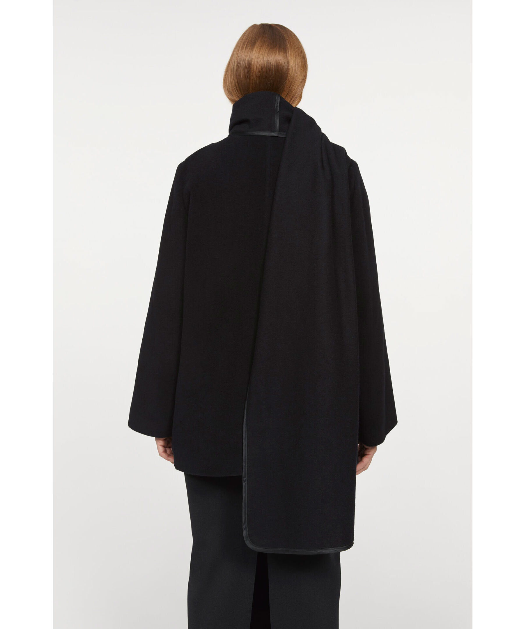 Svart kort kappa i ullblandning från Rodebjer. Kappan har en inbyggd scarf som håller dig extra varm. Avslappnad passform, två framfickor och stängs med två knappar; en vid halsen och vid plaggets mitt. Modellen är 179cm lång och har på sig storlek S.