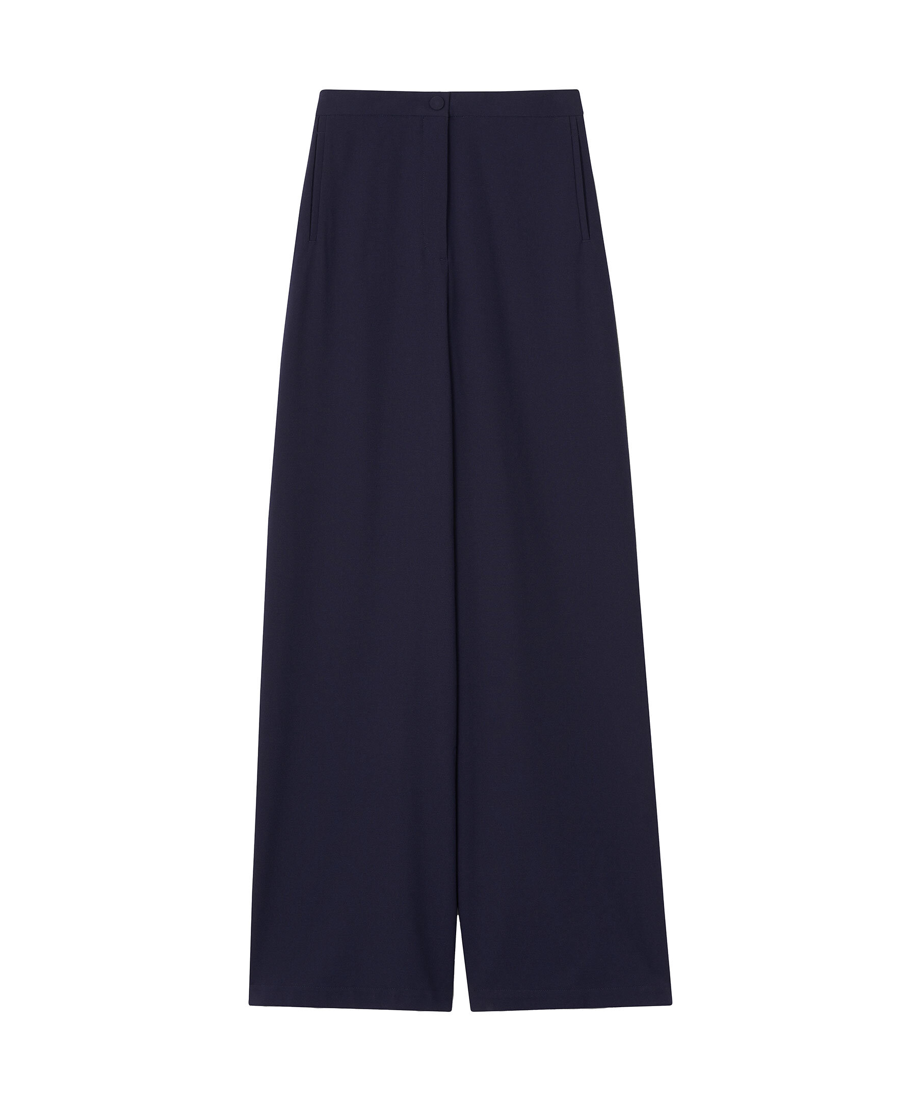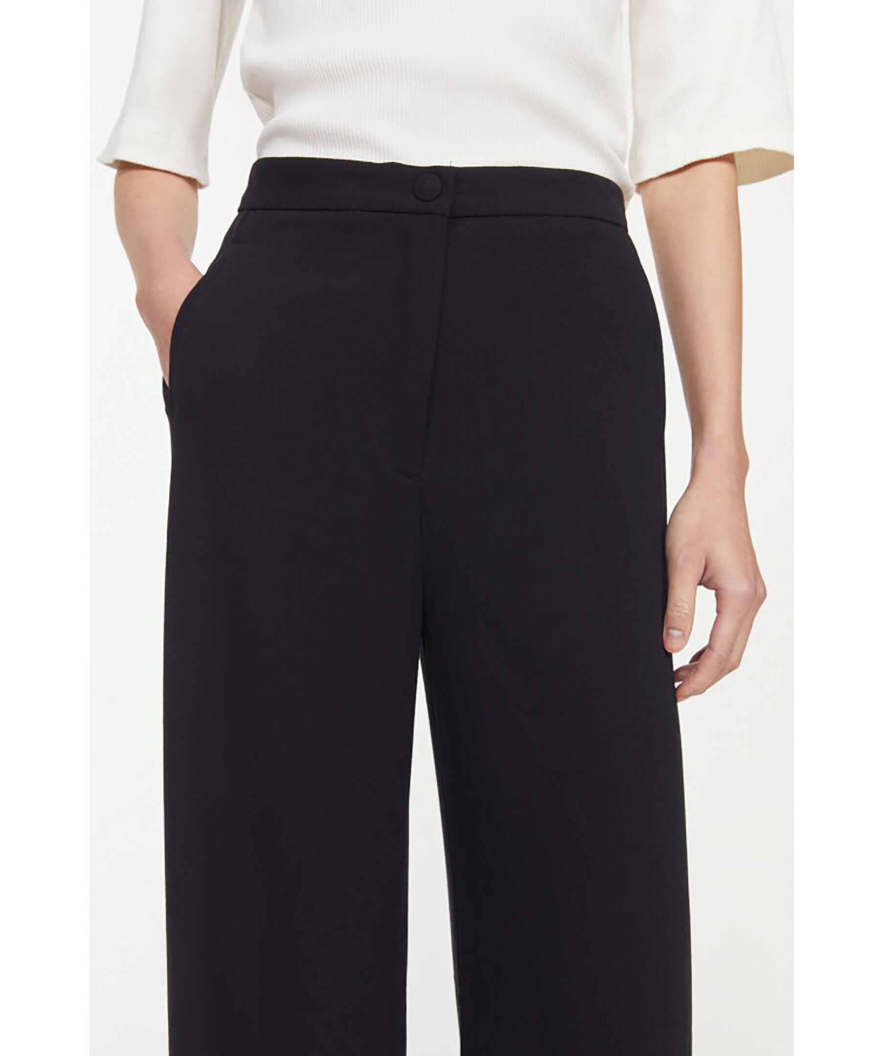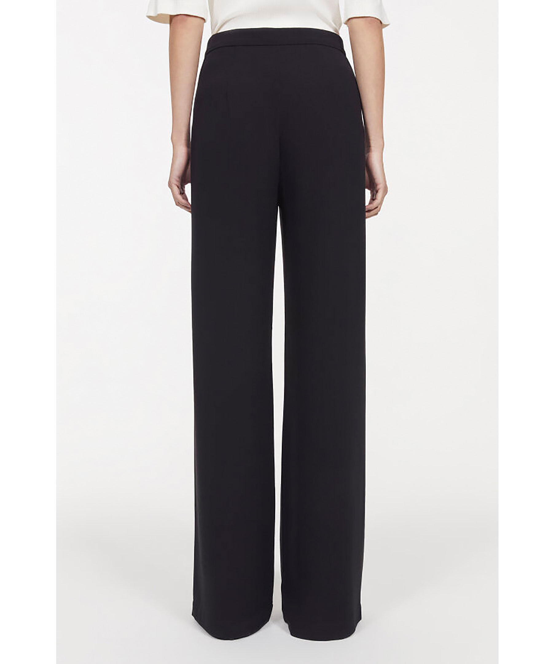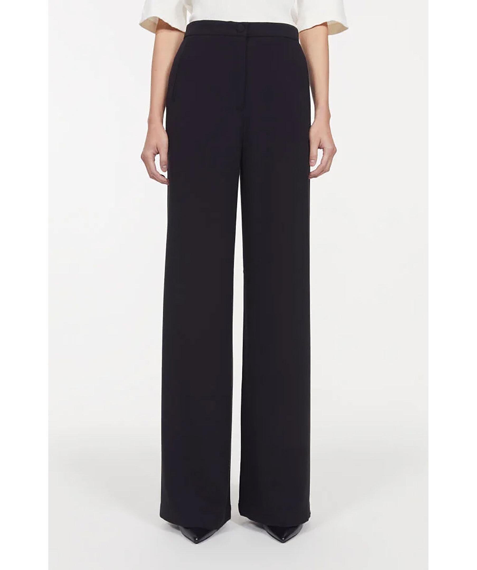 Svarta kostymbyxor från Rodebjer. Byxorna har en tidlös stil med hög midja och vida ben. Den har designats utan sidsömmar för en fantastisk drapering och flyt. Två snedställda fickor, knapp och dragkedja framtill. Tillverkade i en polyesterblandning.