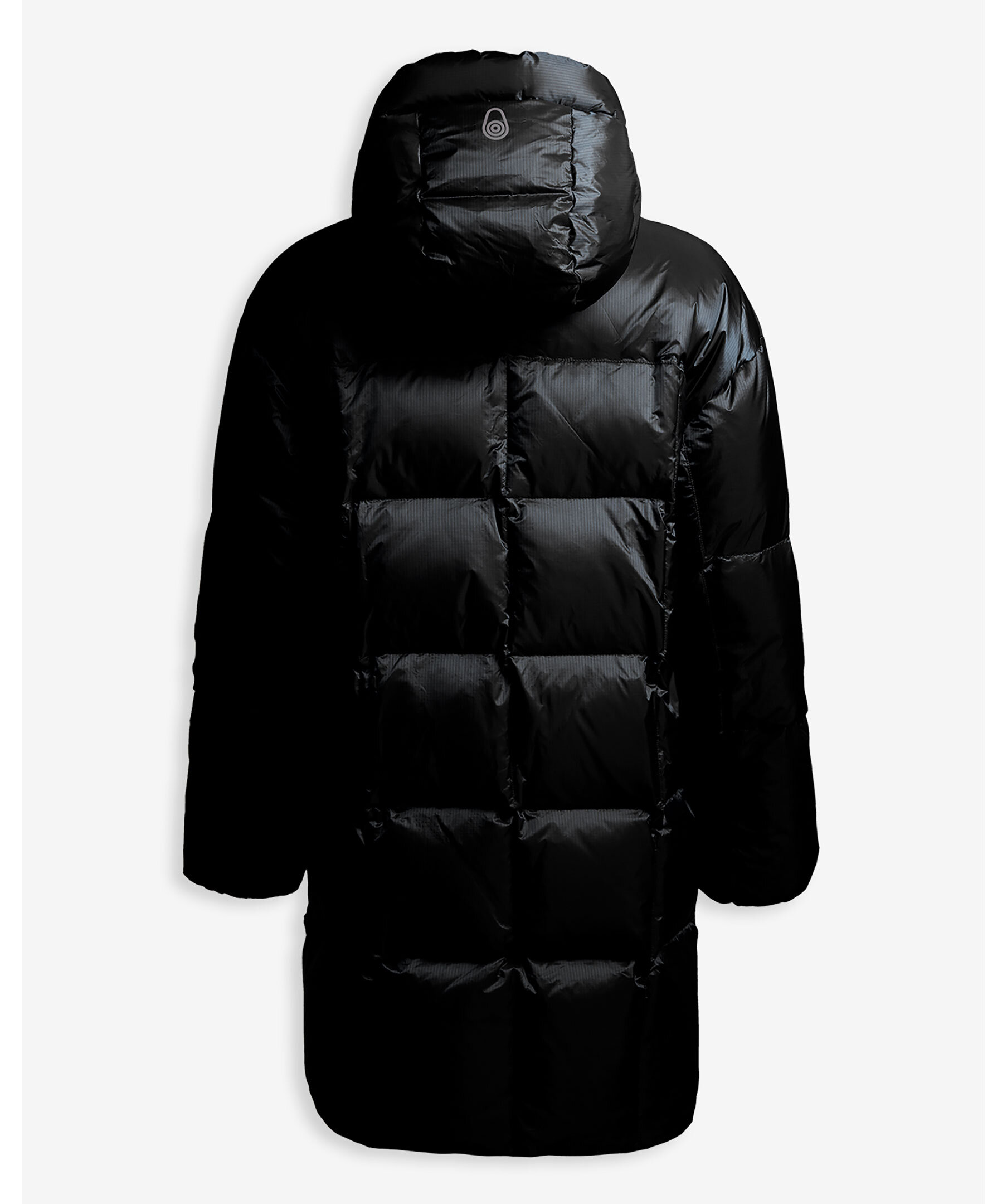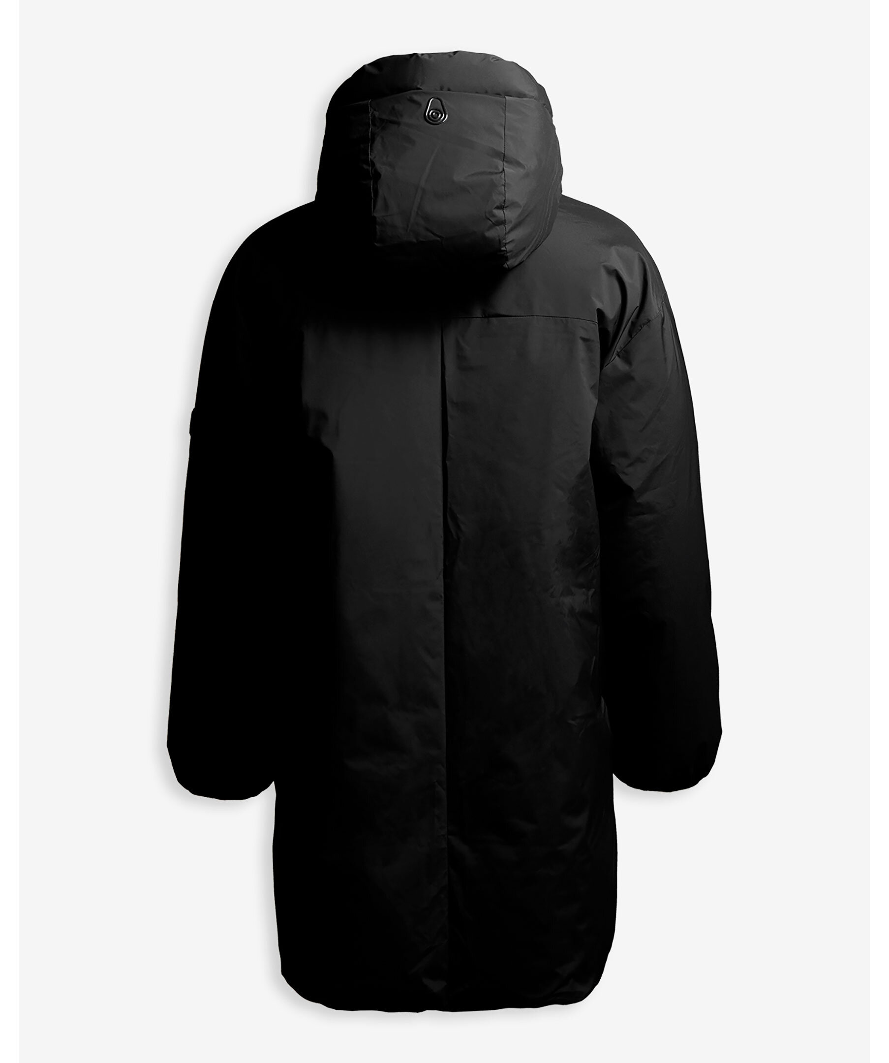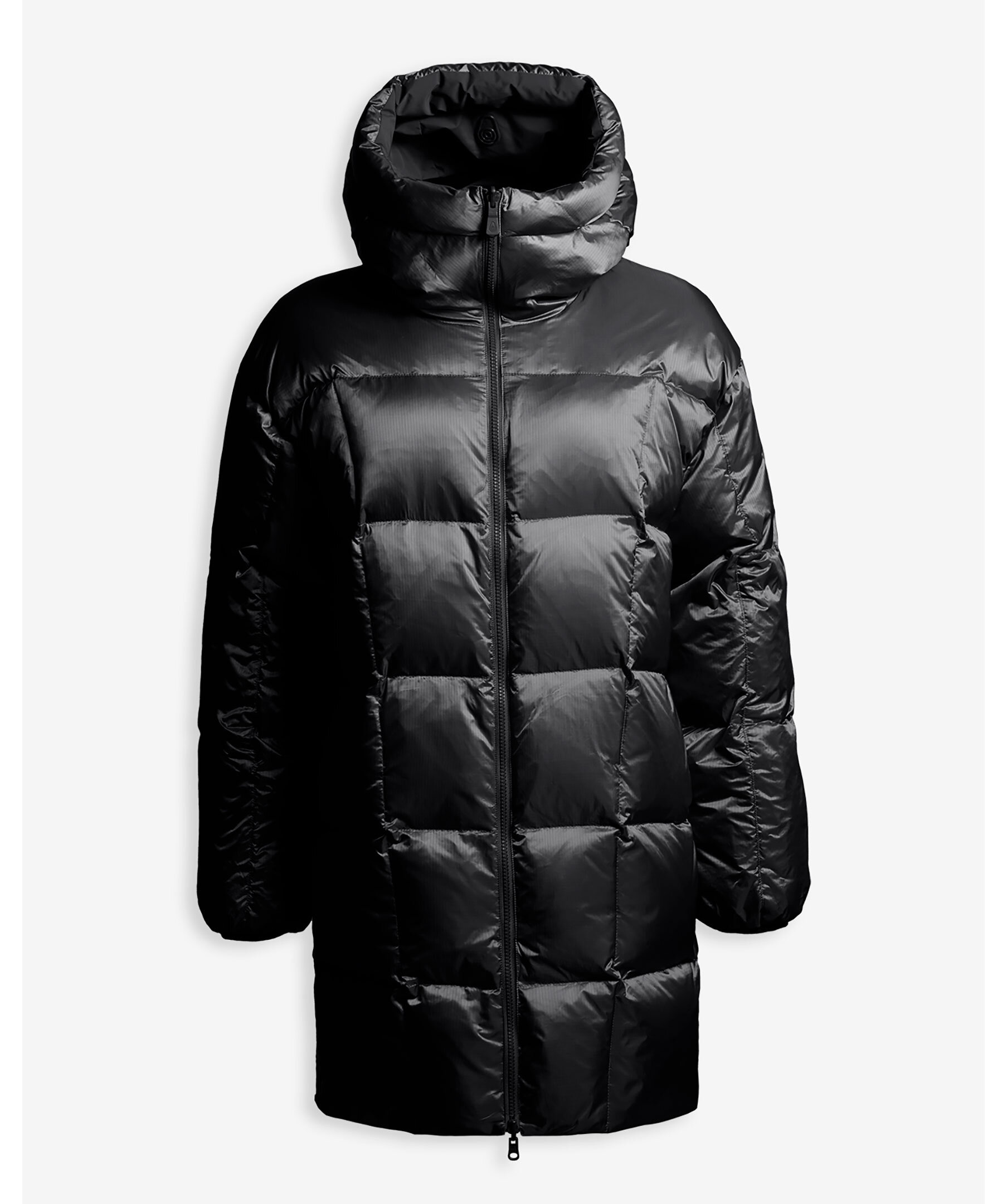 Transarctic Parka är en vind- och vattenavvisande, vändbar dunparka tillverkad i återvunnen nylon och spandex. Ena sidan har en slät finish, den andra en quiltad, metalliskt skimrande yta för ett sportigare uttryck.