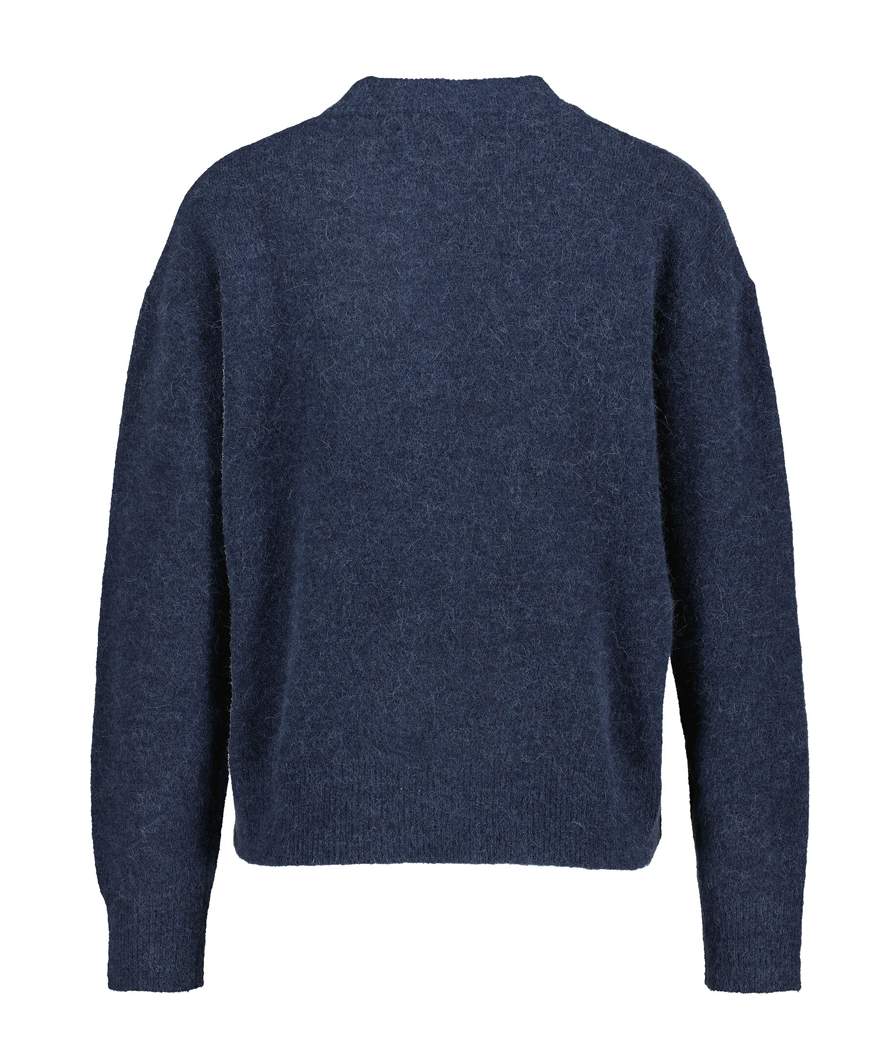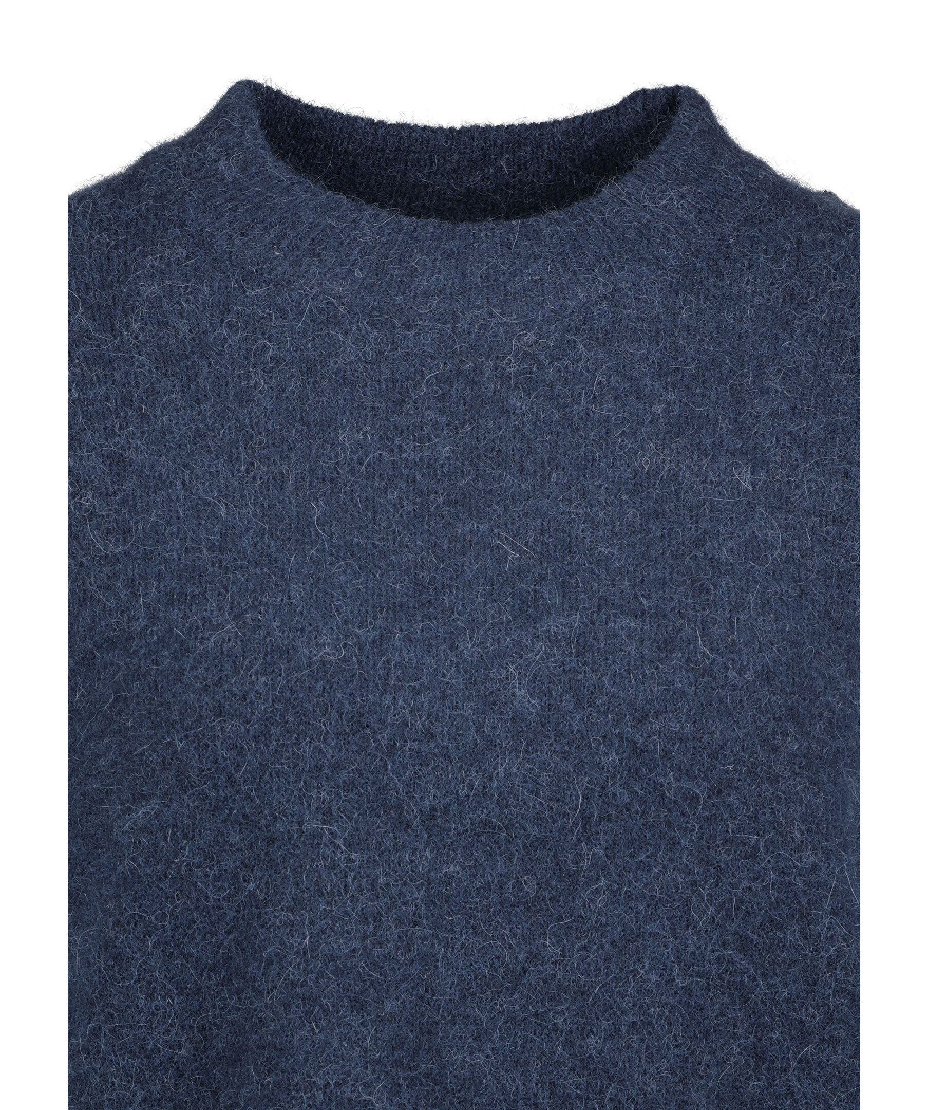Mörkblå tröja med normal passform och nedhasade axlar från Samsoe Samsoe. Ribbstickad rund halsringning, ärmslut och nederkant. Huvudmaterialet består av en elastisk blandning med ull och alpackaull. Denna produkt är RWS-certifierad, vilket garanterar att djurvälfärd och krav på markförvaltning uppfylls från gård till färdig produkt