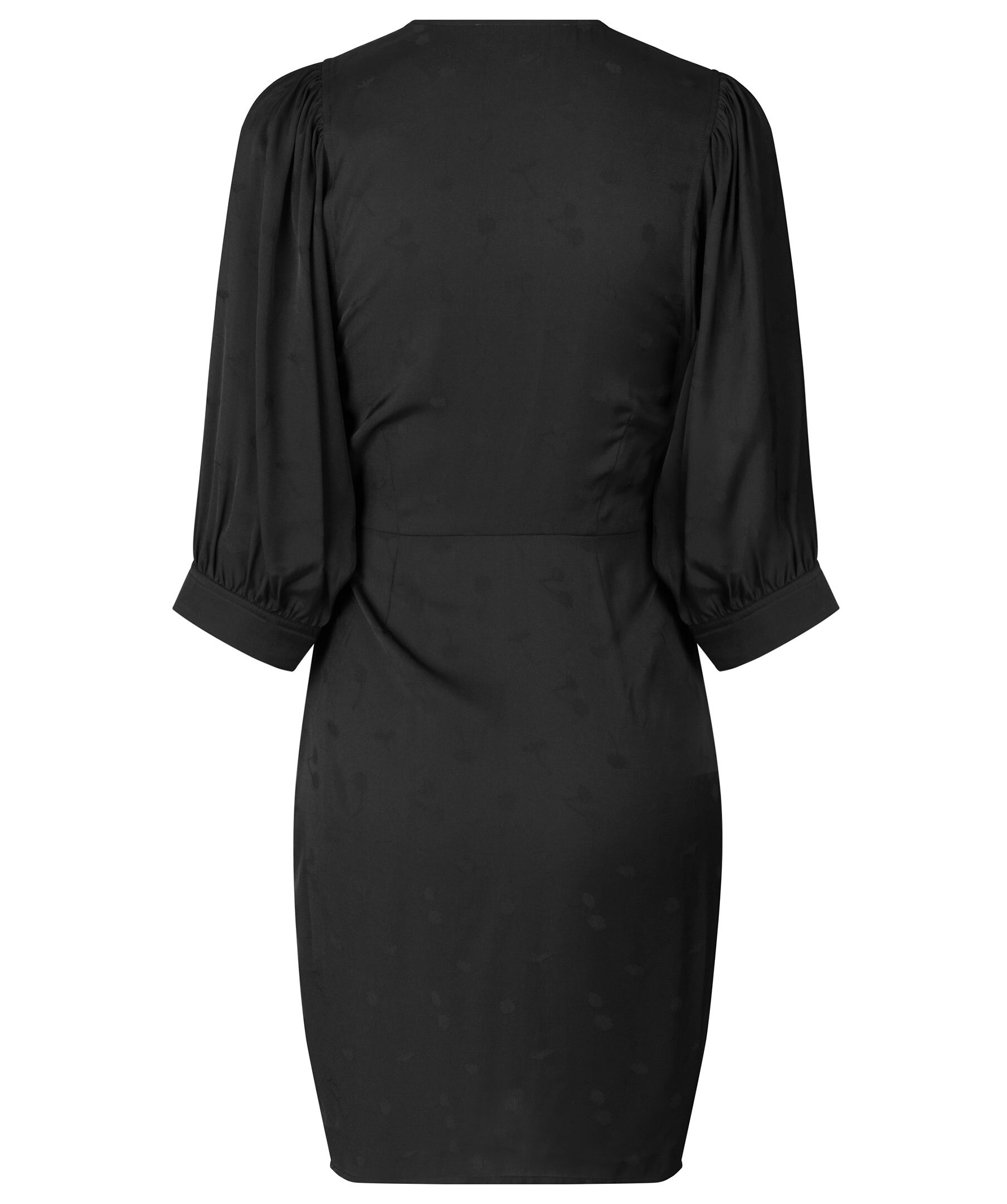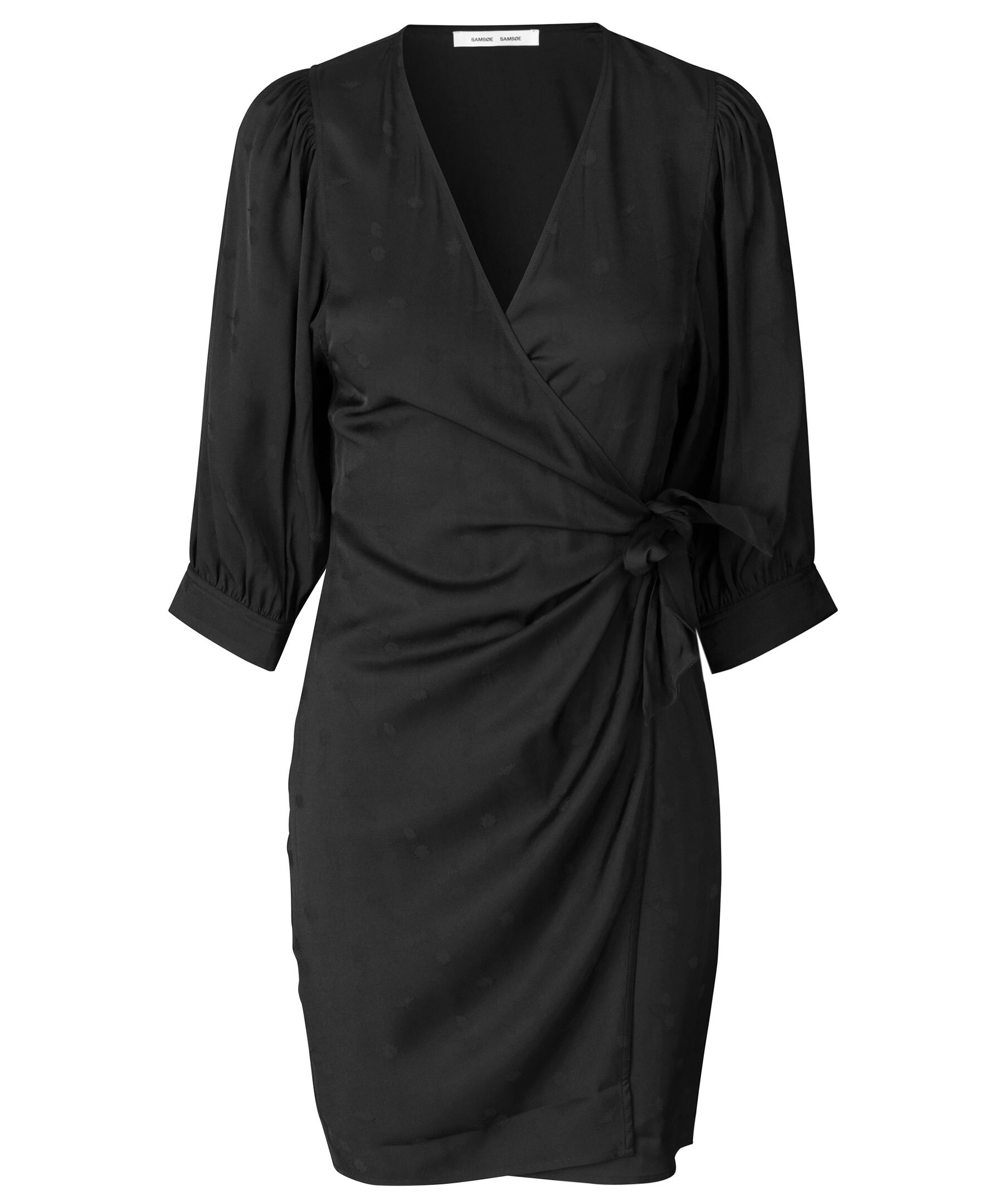 Svart omlottklänning i kort modell från Samsoe Samsoe. Voluminösa puffade ärmar i 3/4 längd. Knyts på sidan i midjan och har en v-ringad halsringning. Skimrande tyg med ett jacquardmönster som är ton-i-ton. Tillverkad i viskos och polyetserblandning.