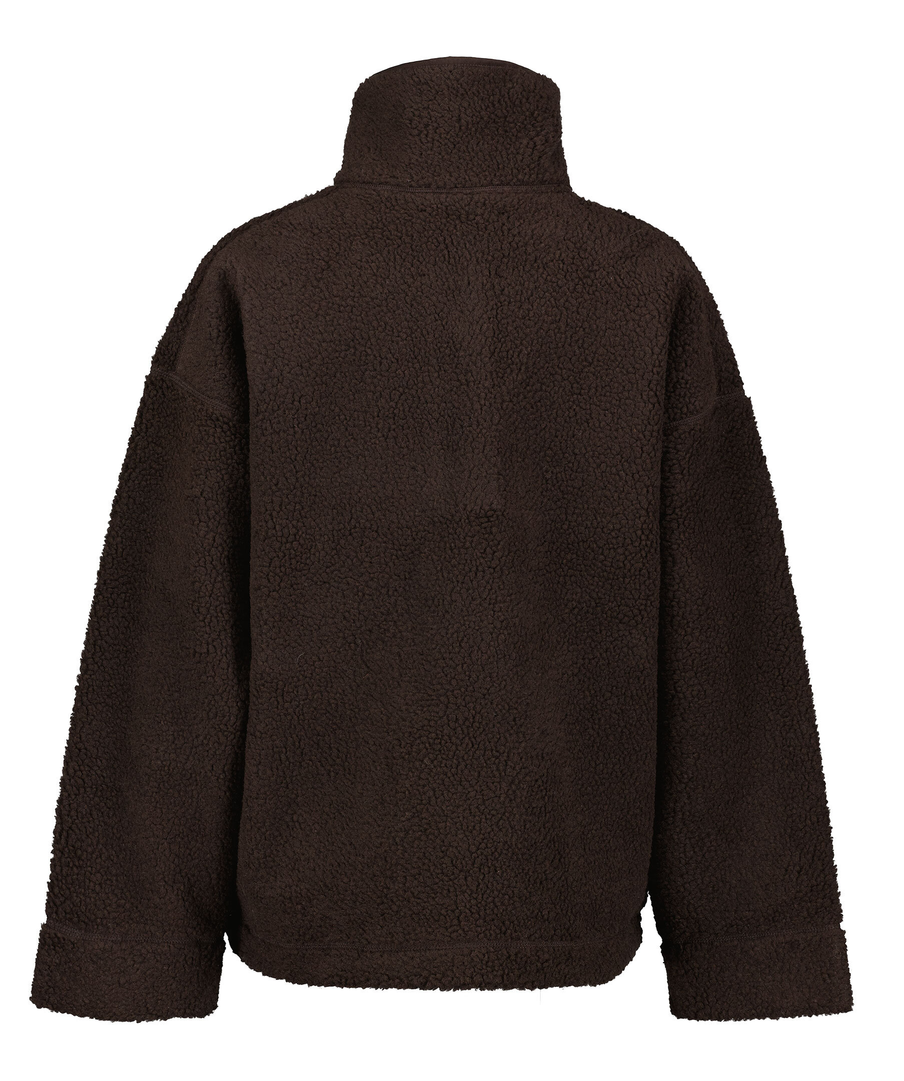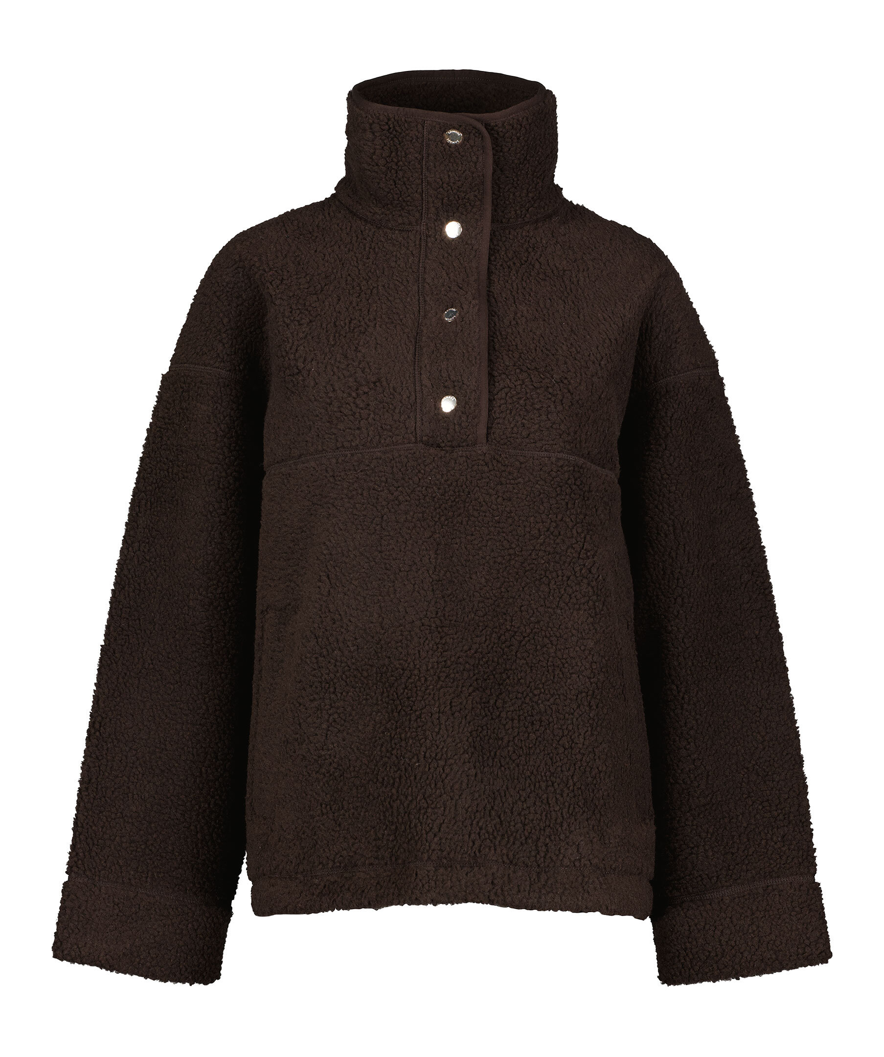 Mörkbrun Pile i anorak modell från Samsoe Samsoe. Hög krage med tryckknappar. Vida ärmar, och dragsko i plaggslut. Två fickor framtill.