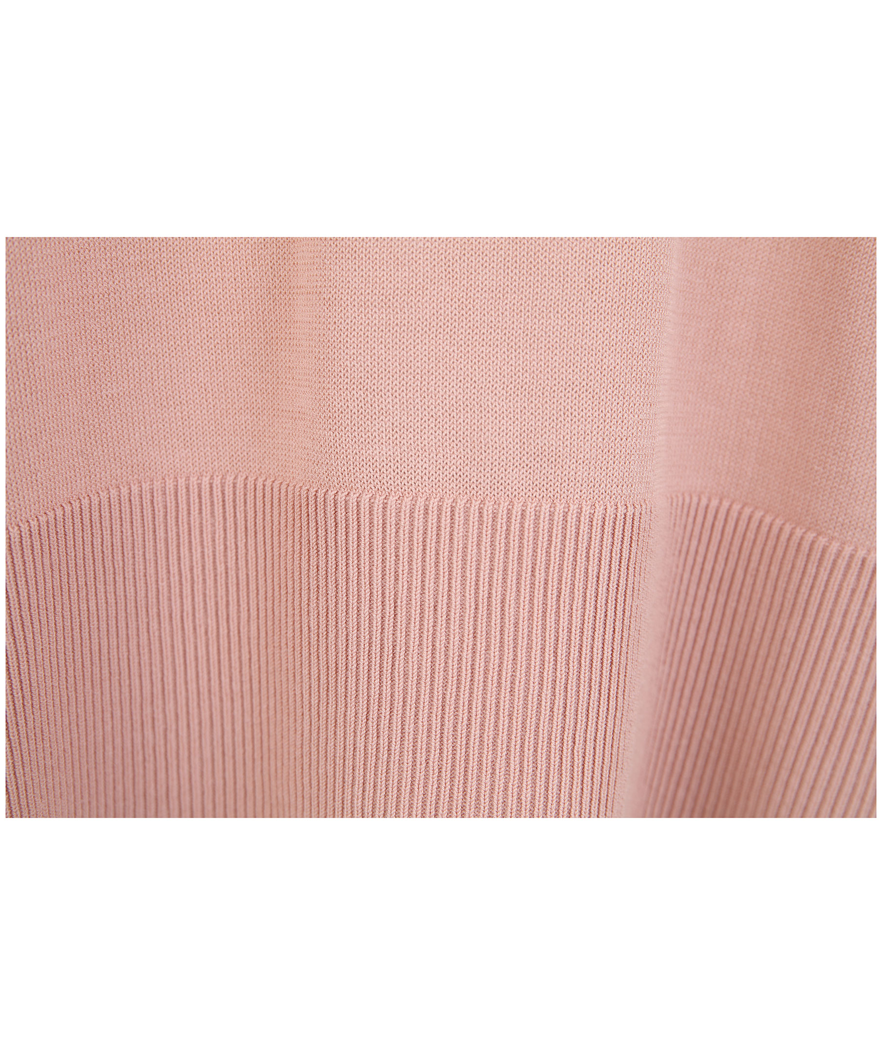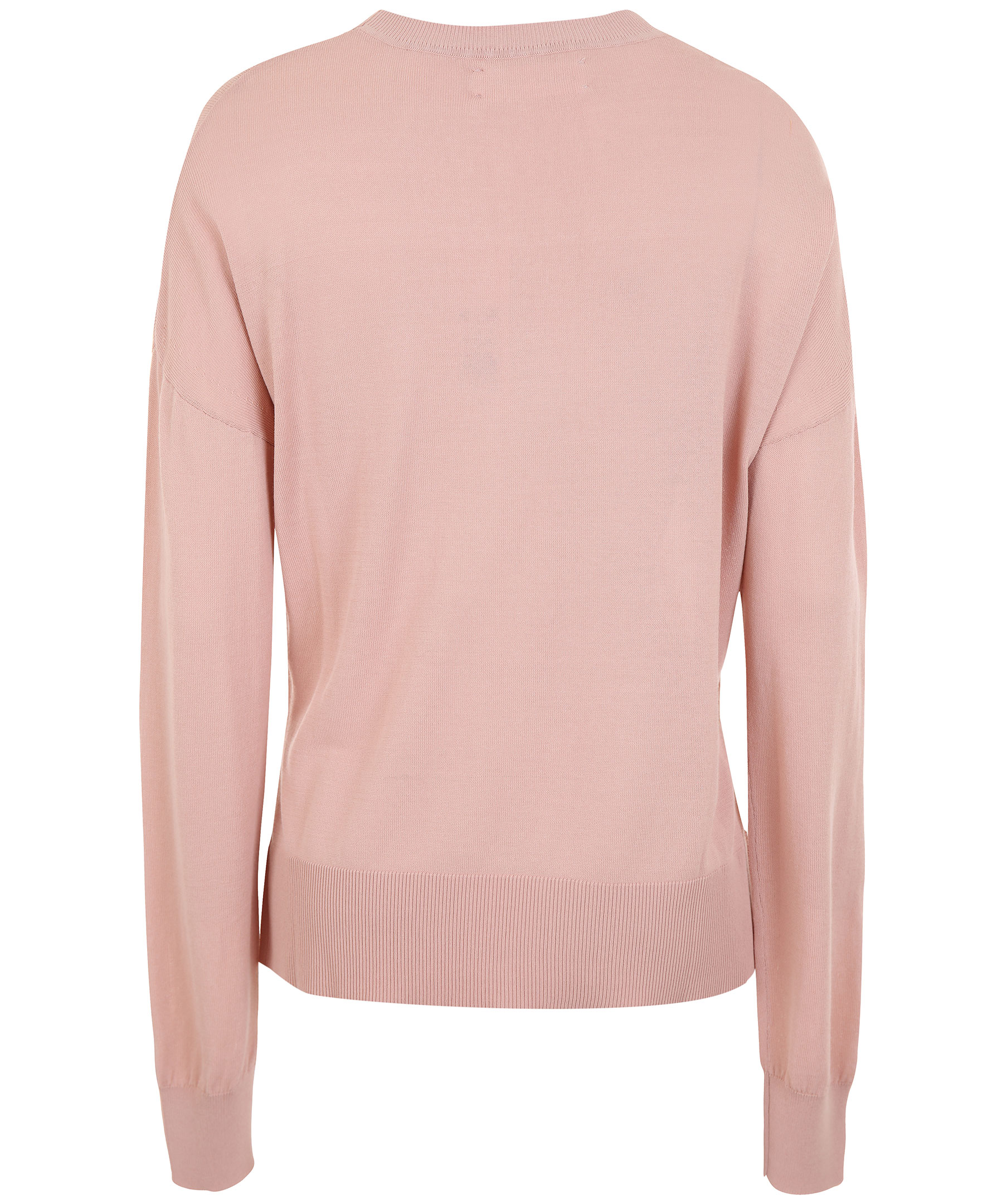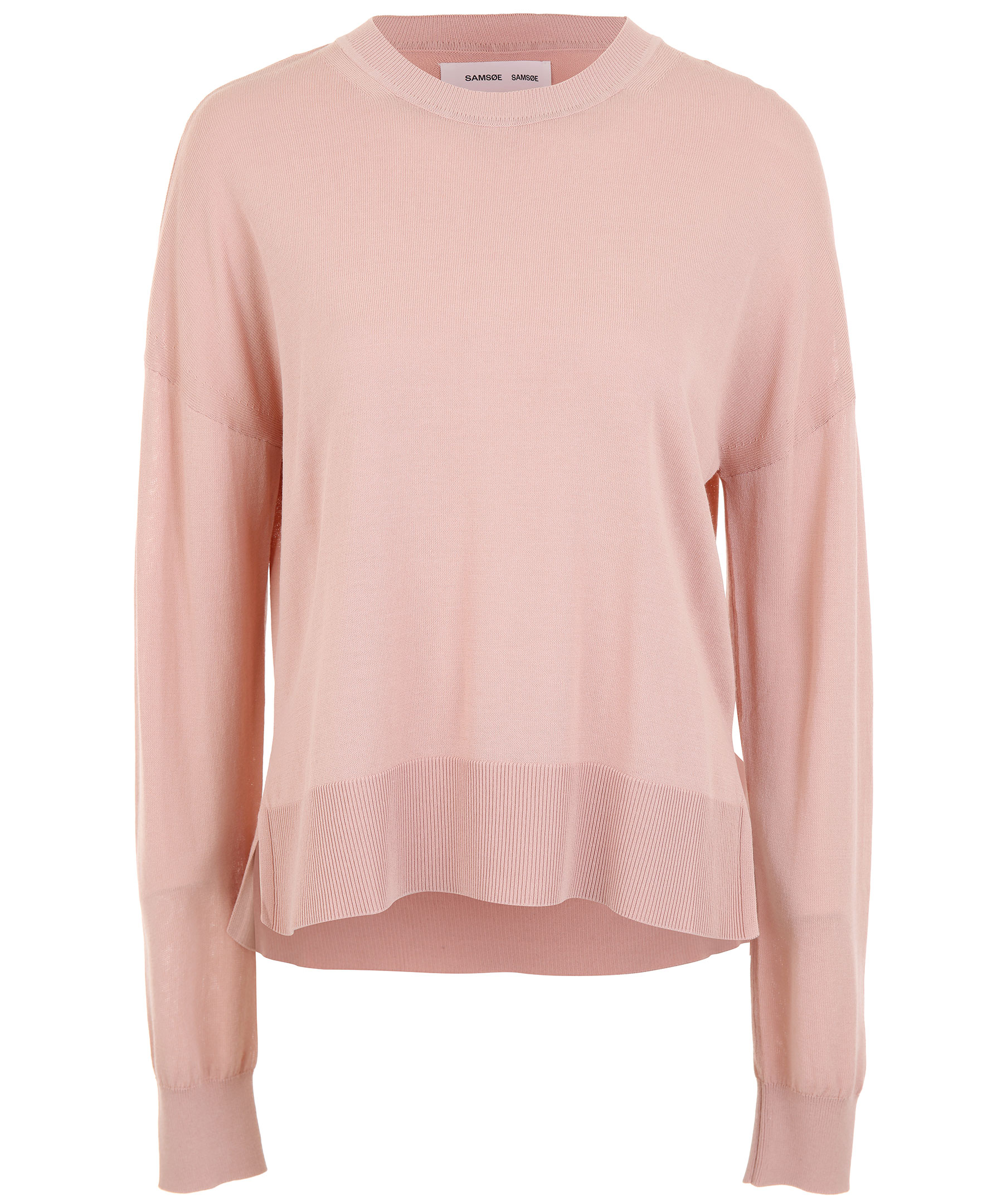 Gammelrosa, tunnt stickad tröja från Samsoe Samsoe. Rundad halsringning och slitsar på sidorna. Ribbade ärmslut och plaggslut. Tillverkad i viskos och bomullsblandning.
