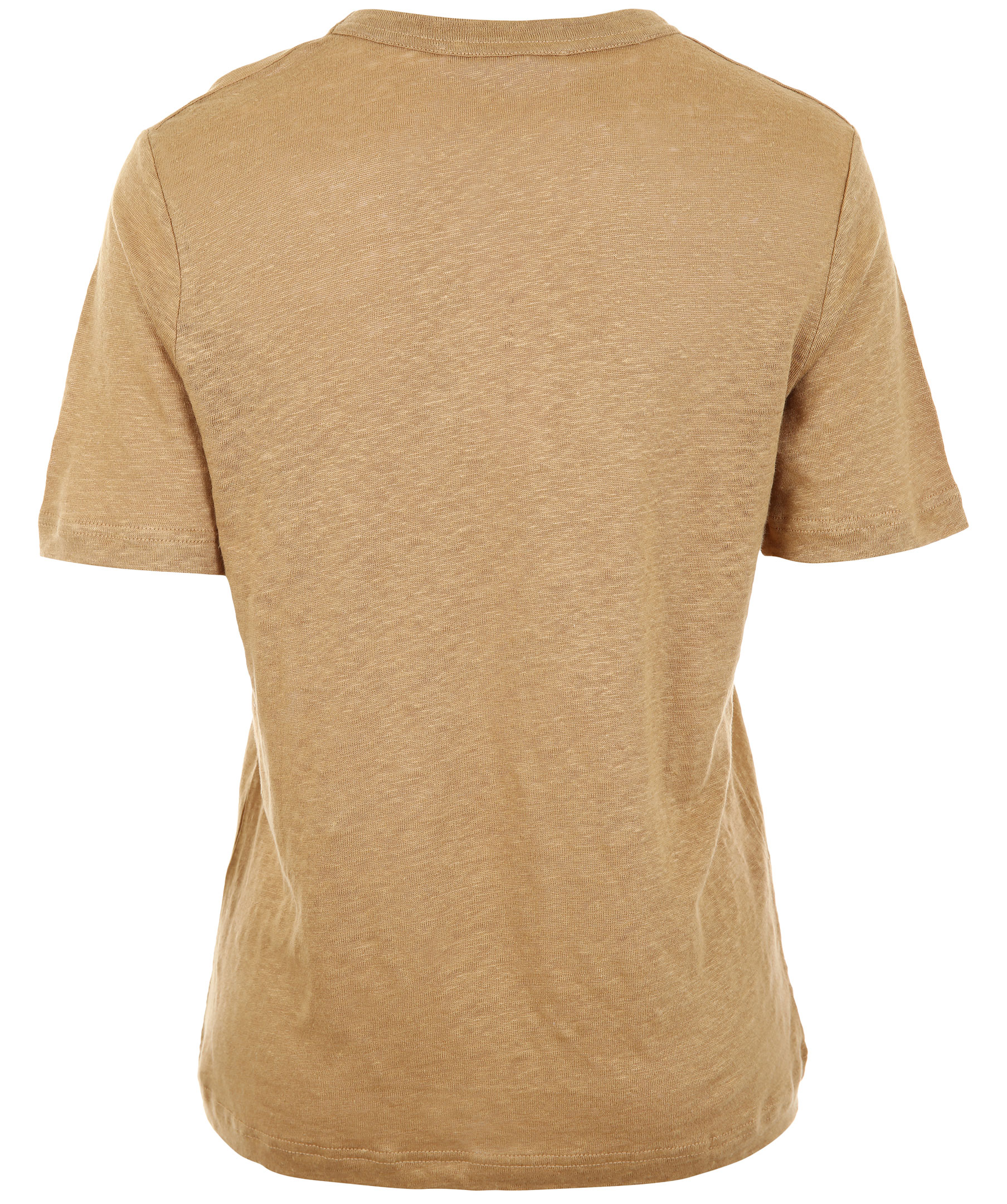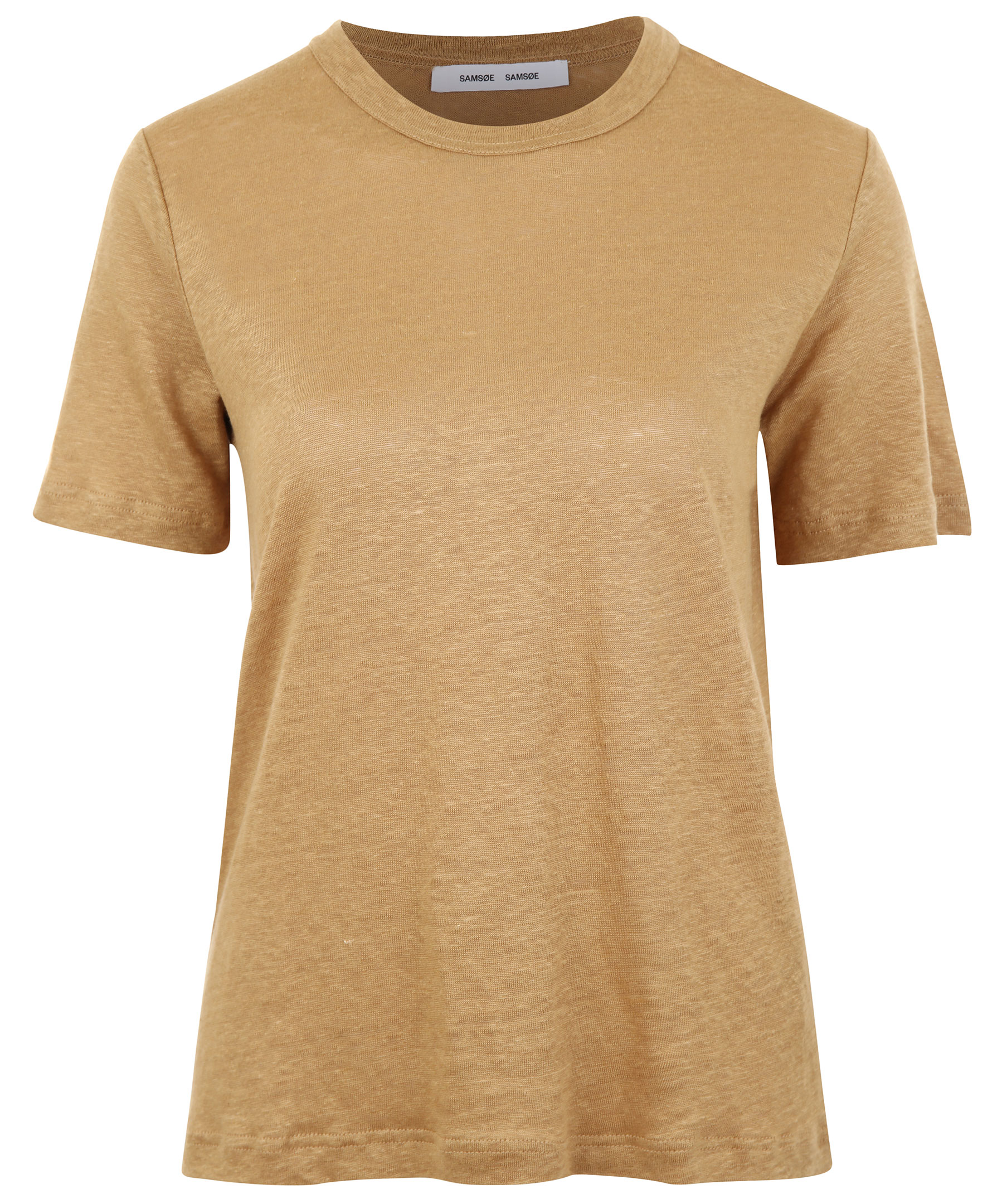 Ljusbrun kortärmad t-shirt i avslappnad passform från Samsoe Samsoe. Gjord i skönt linnetyg och har en mudd vid halsringen.