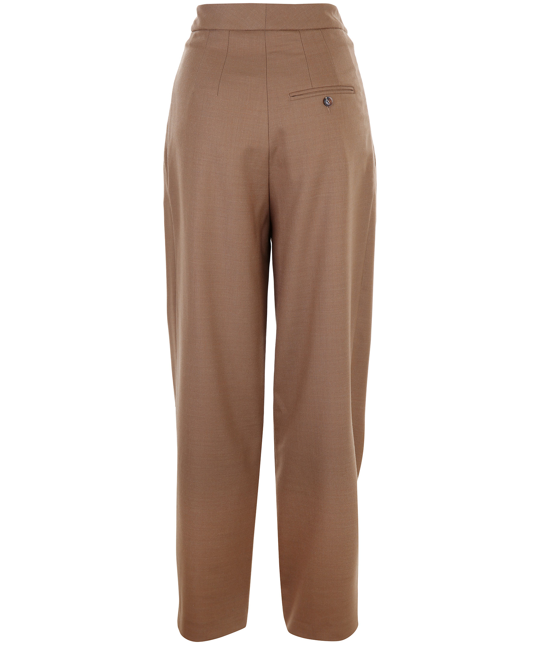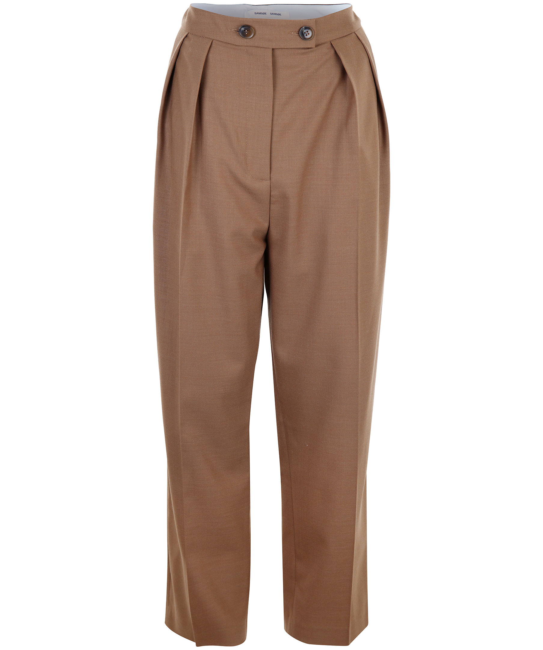Kamelfärgade, vida kostymbyxor från Samsoe Samsoe. Pressveck på framsidan och fickor i sidorna. Dragkedja och två bruna knappar som stänger byxorna fram.