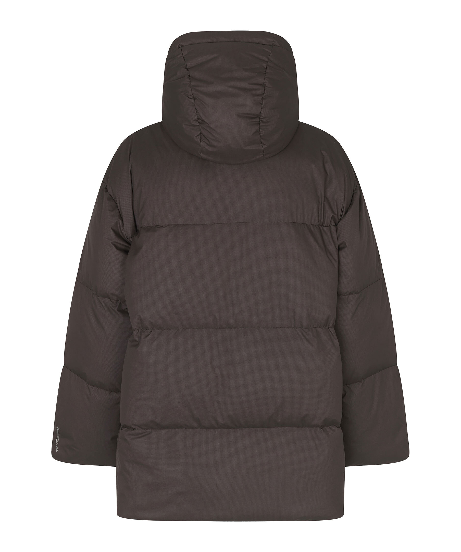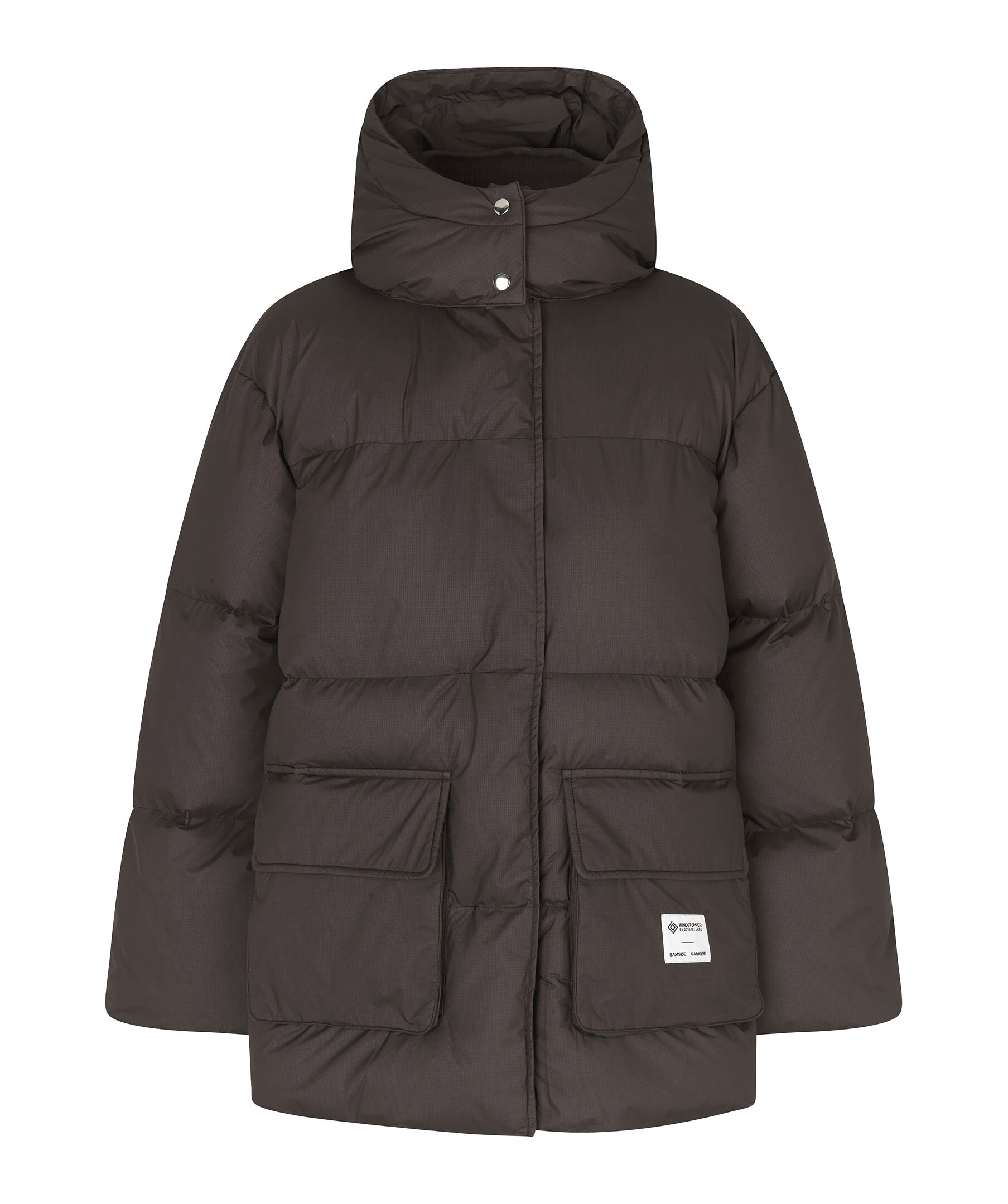 Mörkbrun quiltad pufferjacka från Samsoe Samsoe. Stängs framtill med tvåvägsdragkedja och tryckknappar. Två fickor framtill med lock som stängs med tryckknappar. Innerficka. Oversized passform med droppade axlar. Avtagbar luva med dragsko. Patch med GoreTex x Samsøe Samsøe logo.