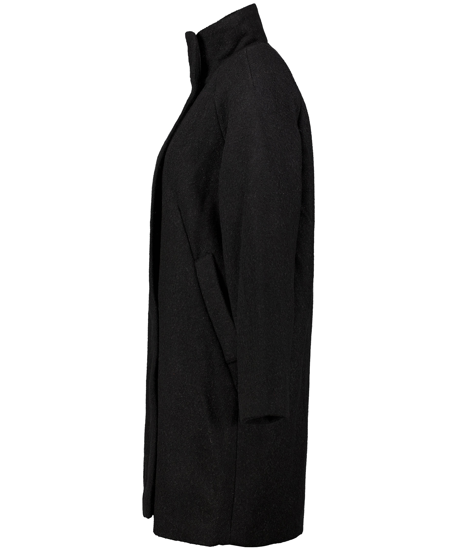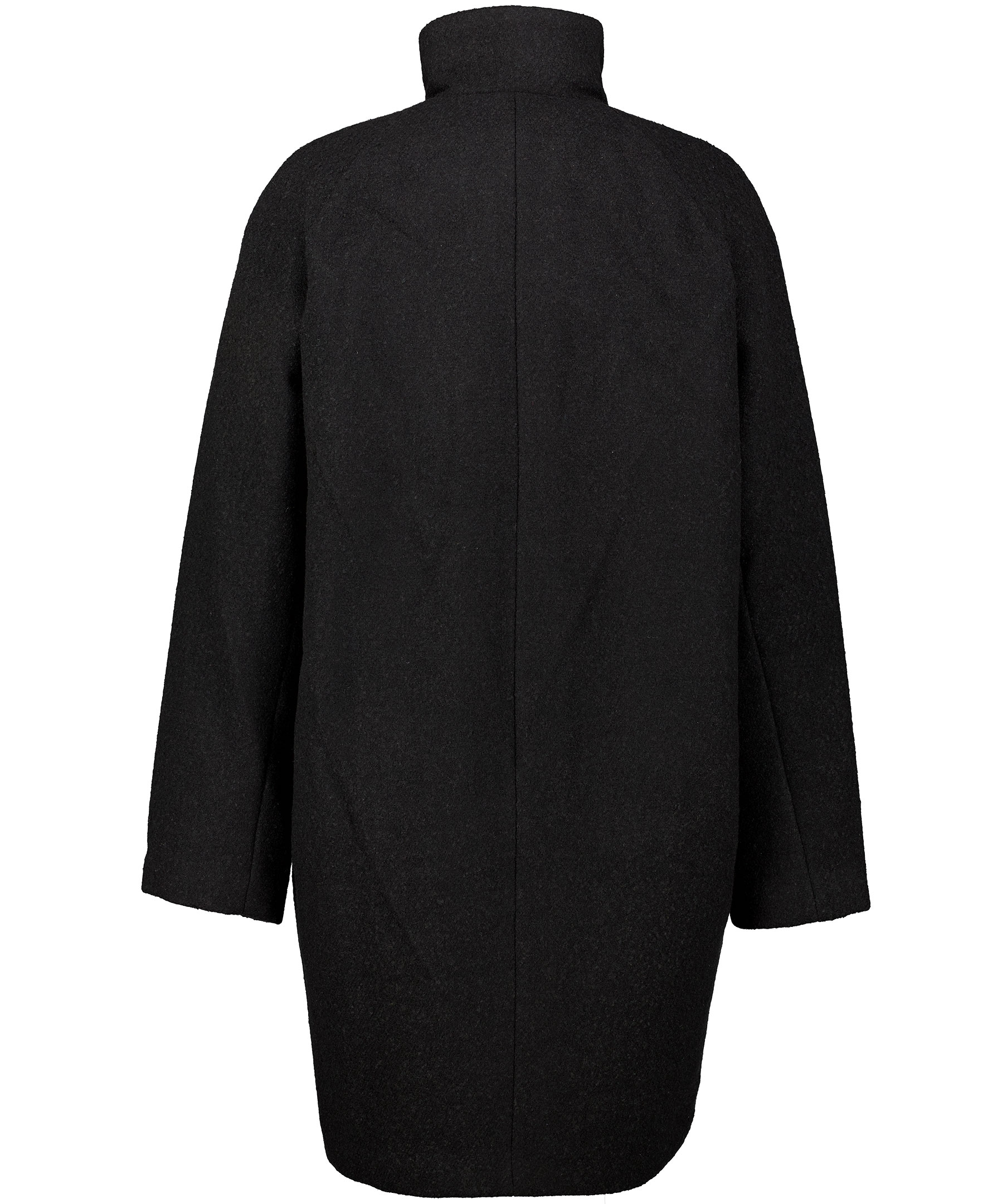 Svart oversize kappa från Samsoe Sasmoe. Hög, tratt hals, dold knäppning och vinklade, öppna framfickor och innerficka. Foder i 100% polyester och yttertyg i polyester och ullblandning.