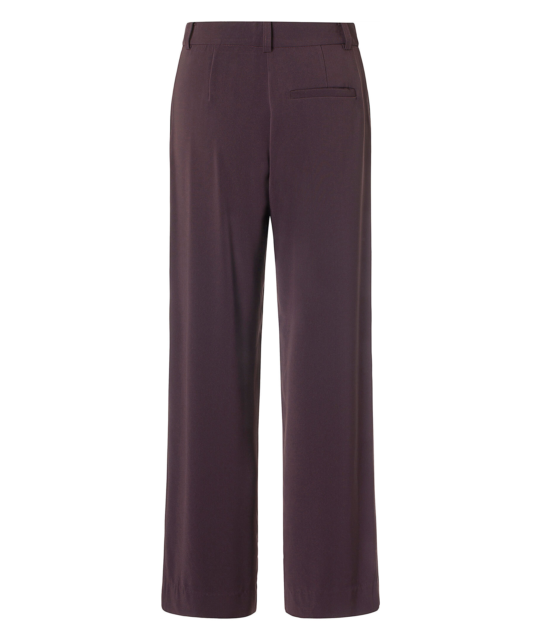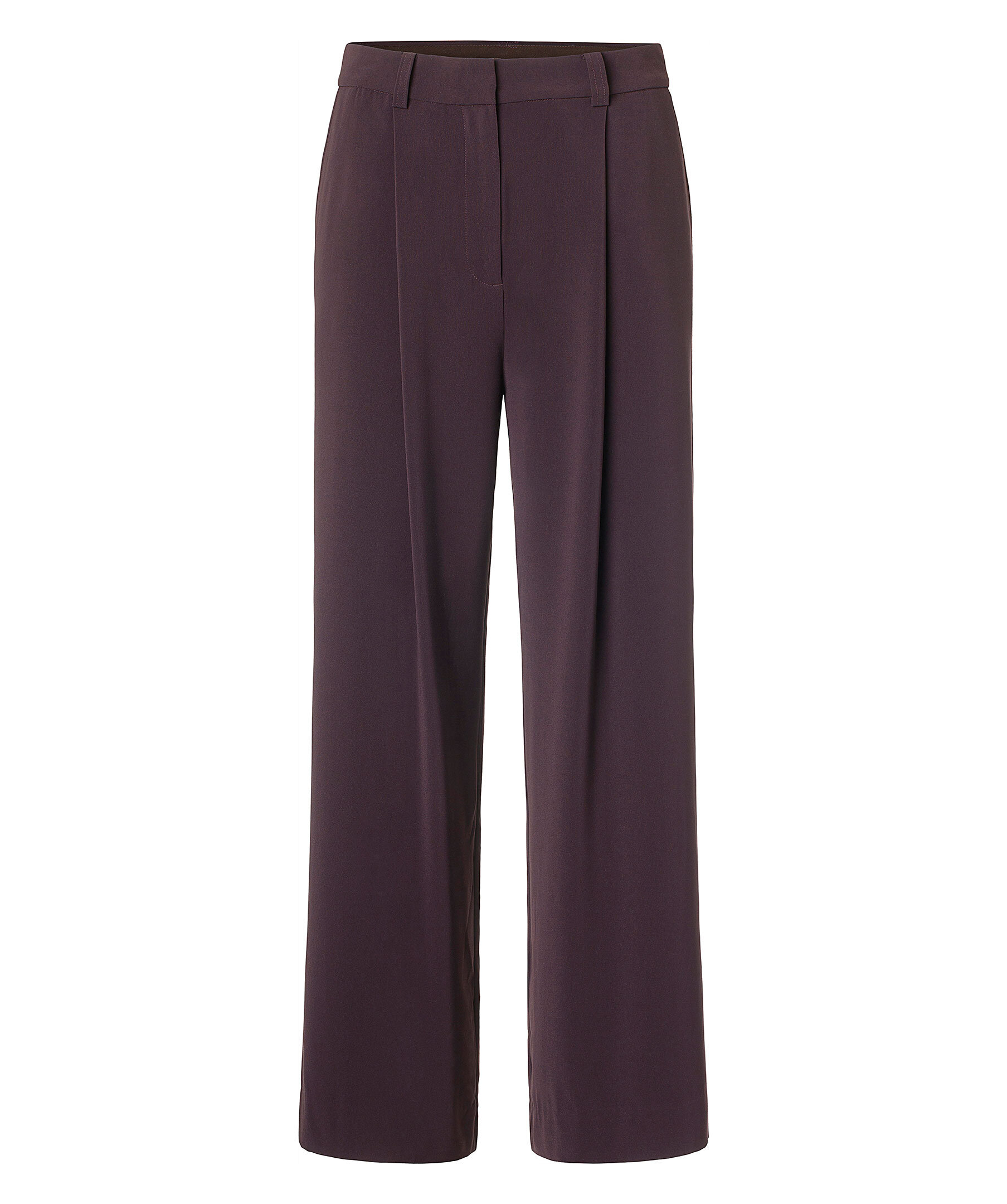 Plommonfärgade byxor från Samsoe Samsoe i rak modell med vida ben. Pressveck och hällor för skräp. Sidfickor, och bakficka på höger sida. Gylf med dold dragkedja och hälla.