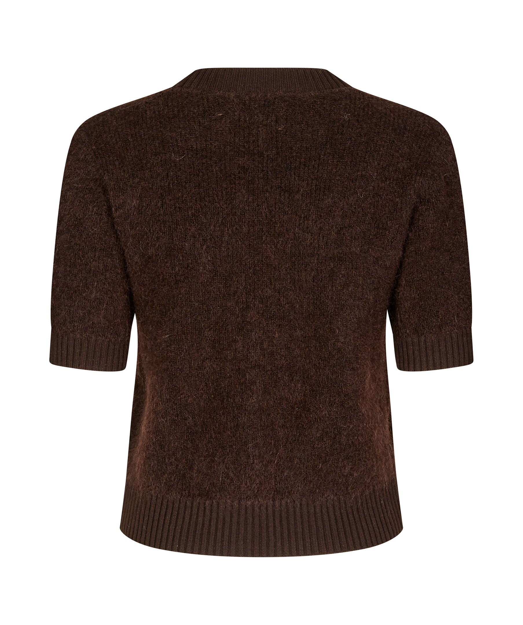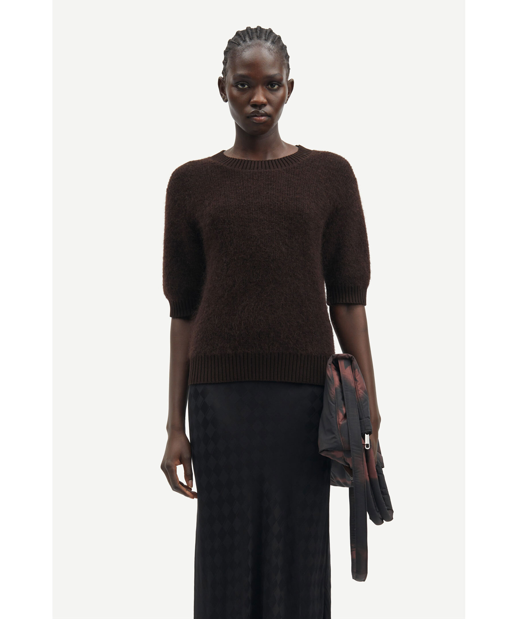 Mörkbrun, stickad och kortärmad tröja från Samsoe Samsoe. Tröjan har ribbstickad halsringning samt ribbstickade muddar och fåll. Tillverkad av en elastisk blandning med mohair och ull.