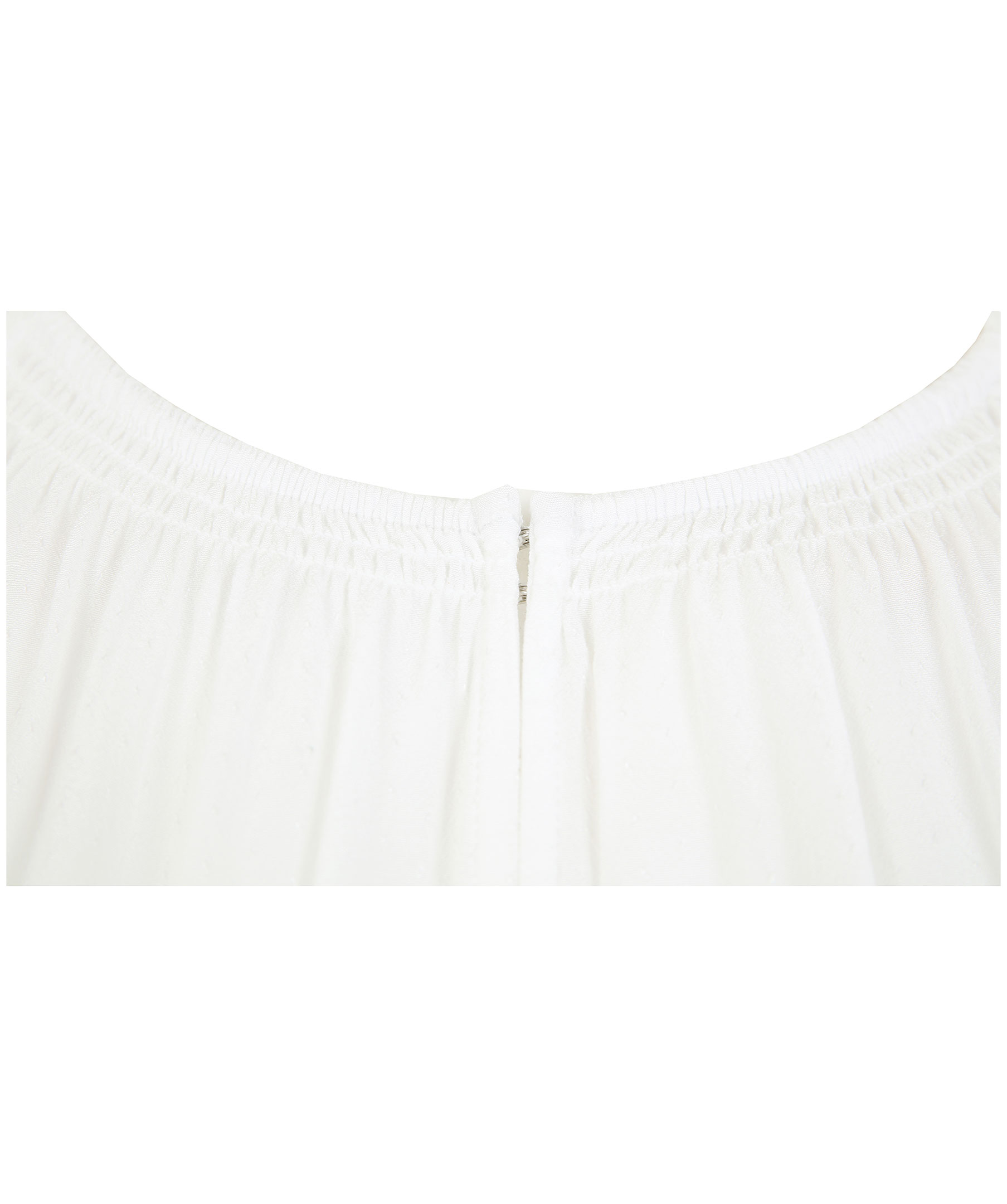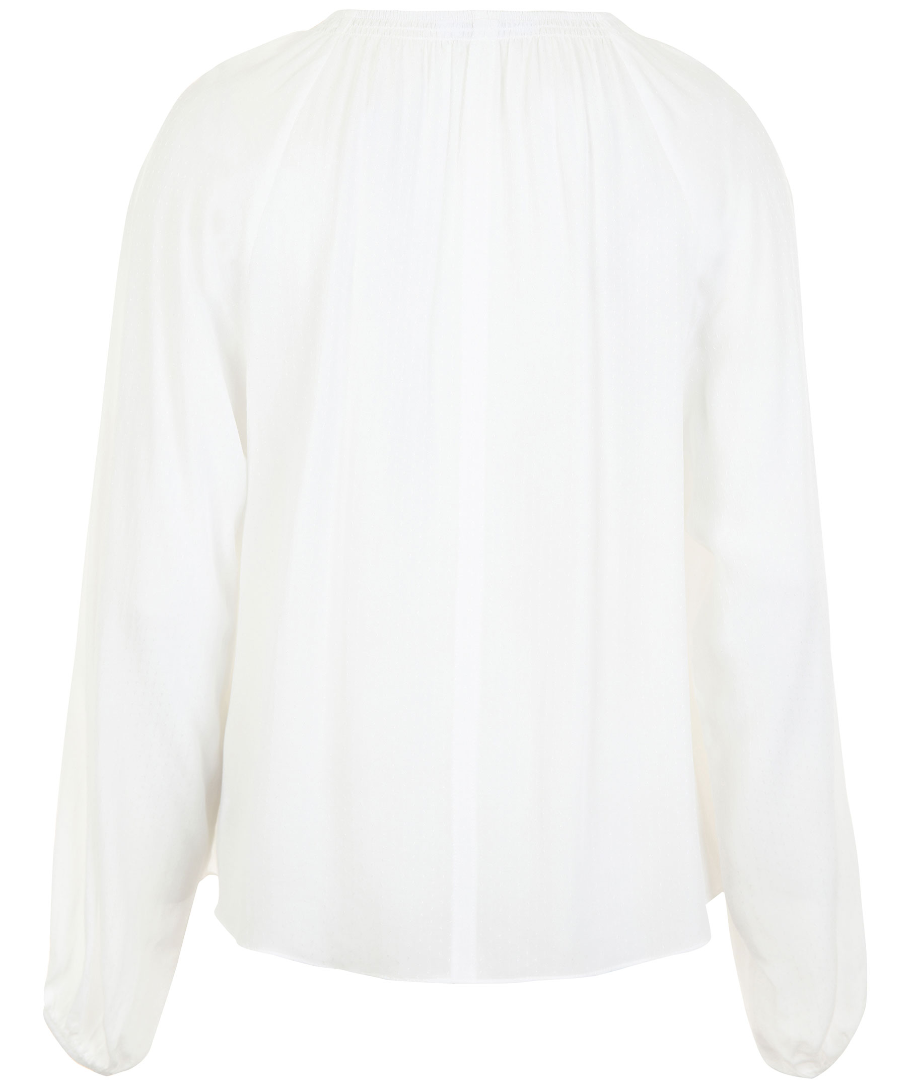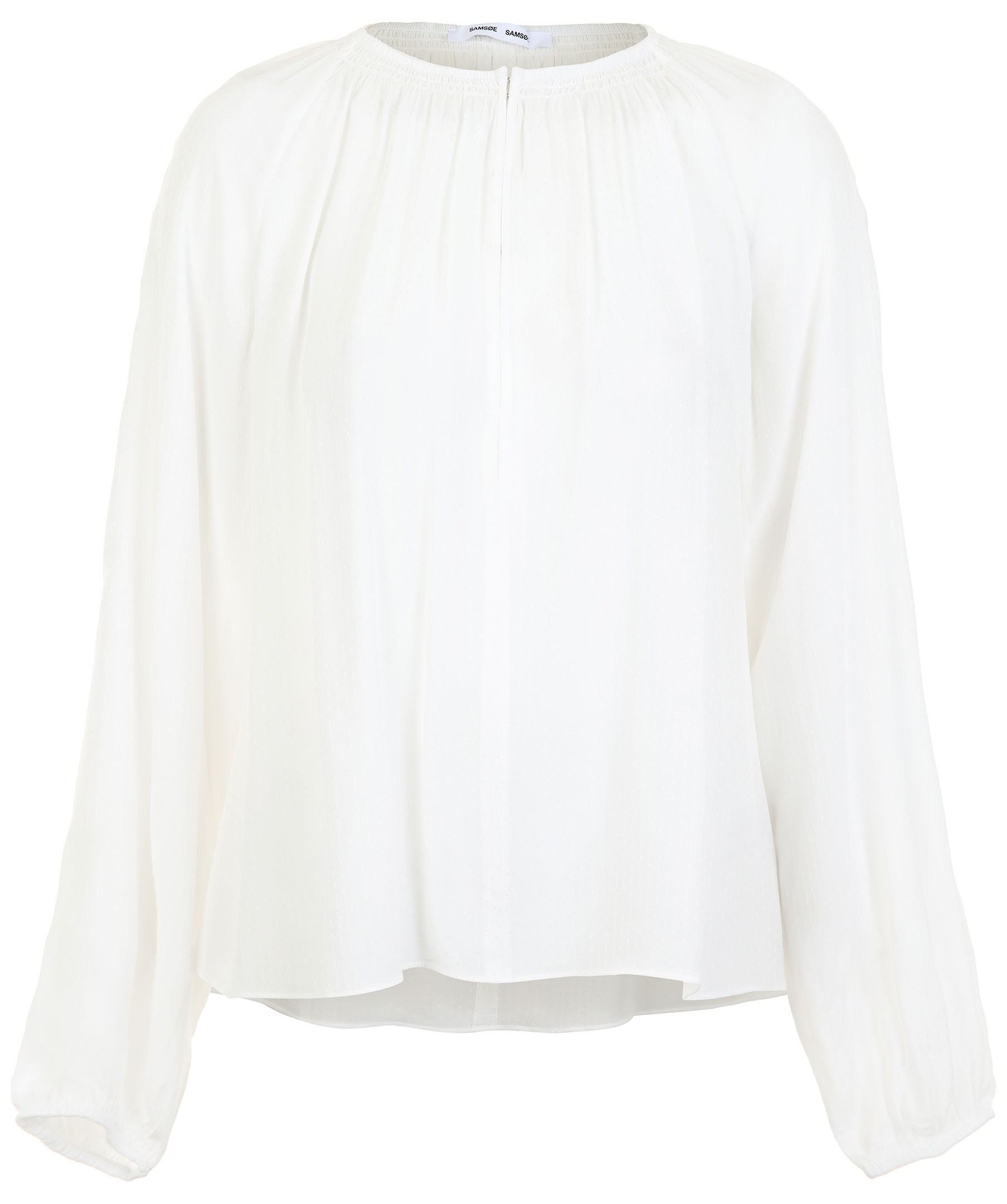 Vit, rak blus från Samsoe Samsoe. Hög ringning med tunn, sretchig mudd som stängs med hakar och hällor. Vida ärmar med liten mudd längst ner som ger en puffig ärm. Matt viskortyg med små glansiga prickar.