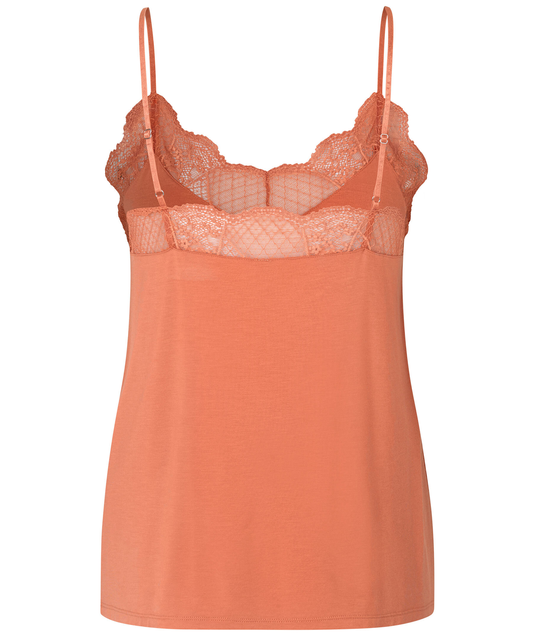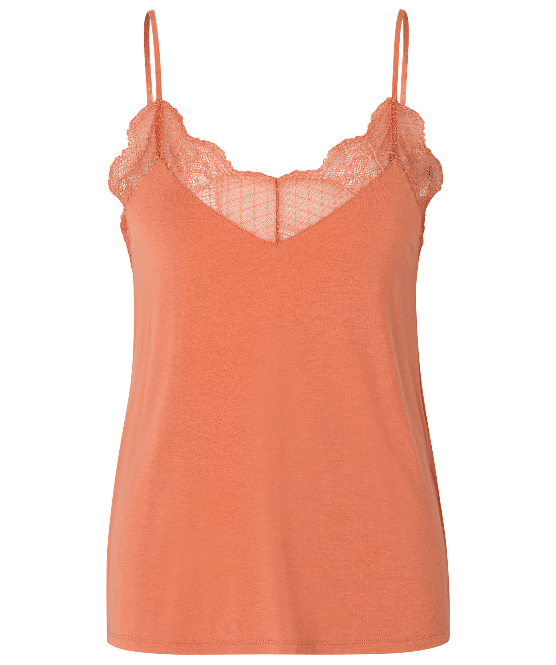 Aprikosfärgat linne från Samsoe Samsoe. Linnet är gjord i en mjuk modal och silkesblandning. Tunna justerbara axelband och spetsdetaljer. V-ringad hals.