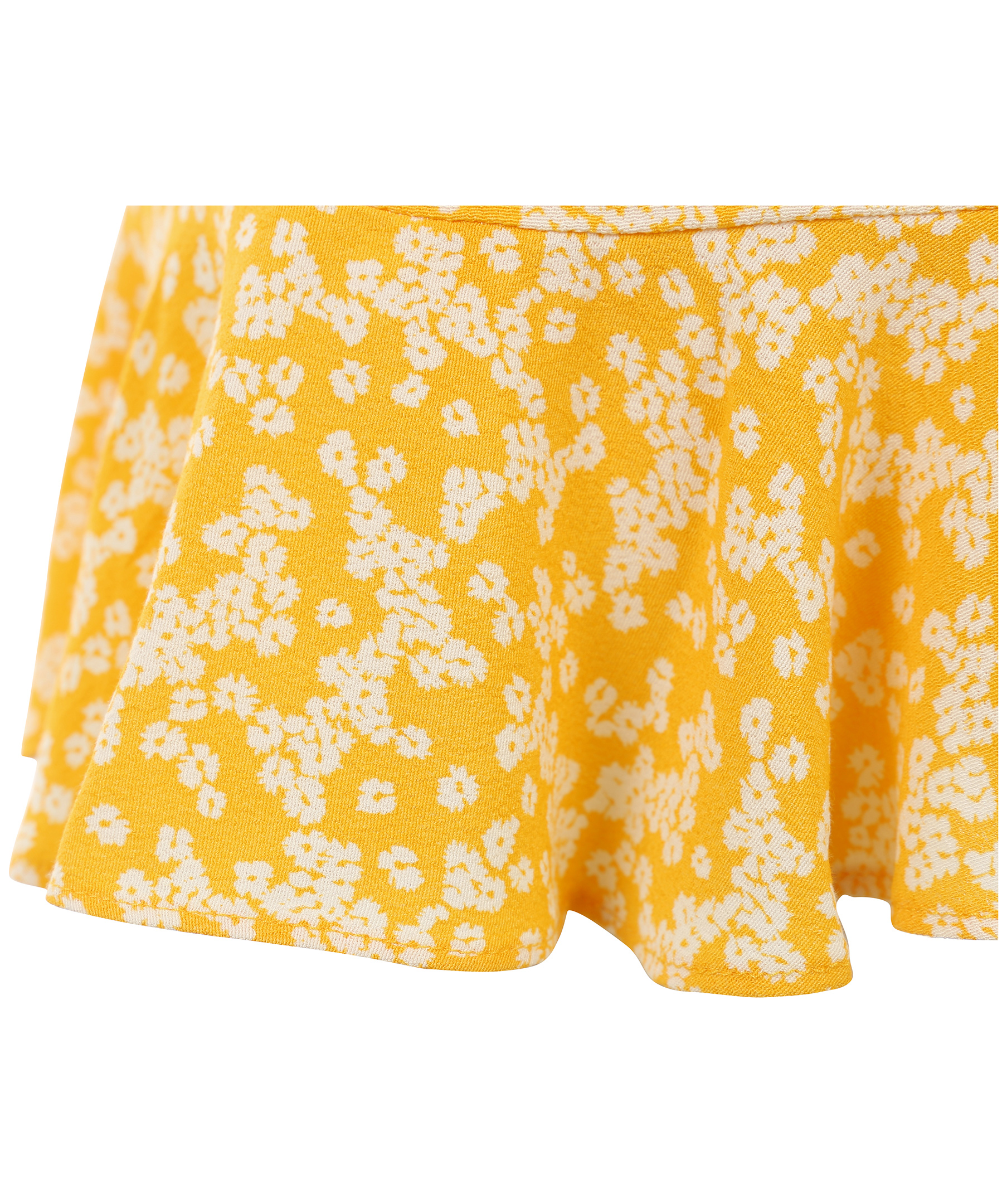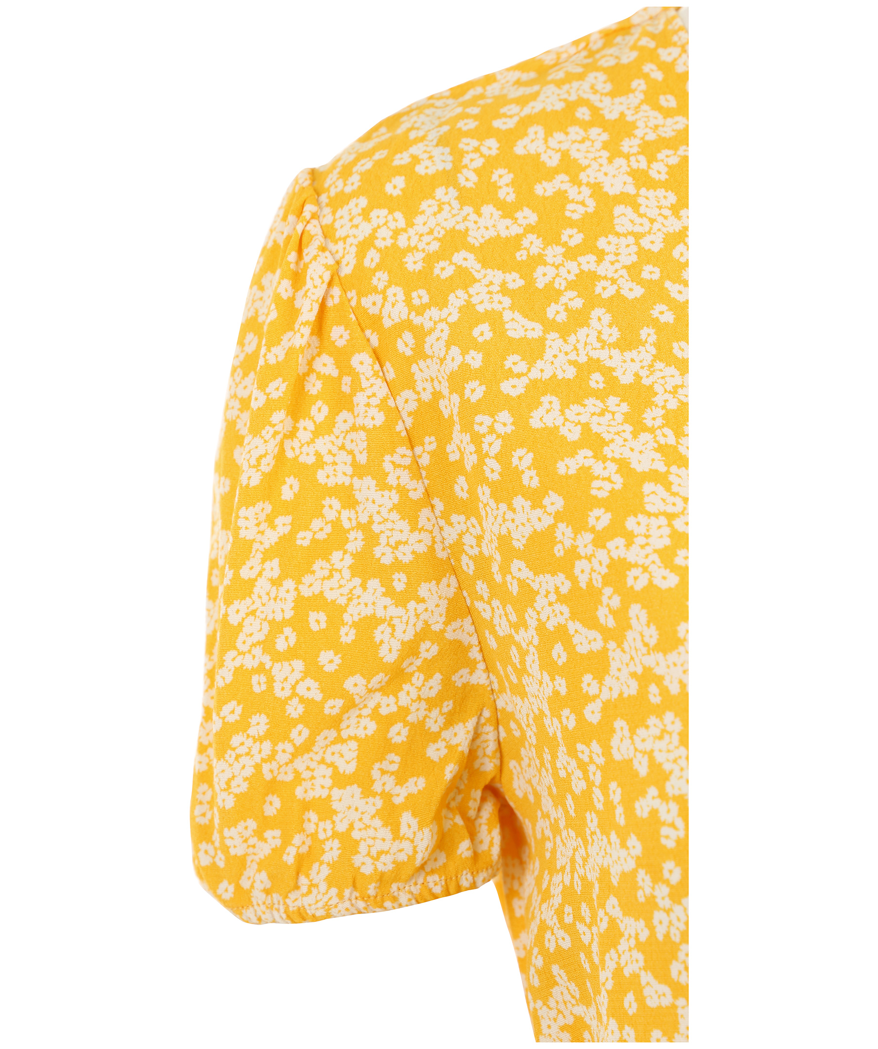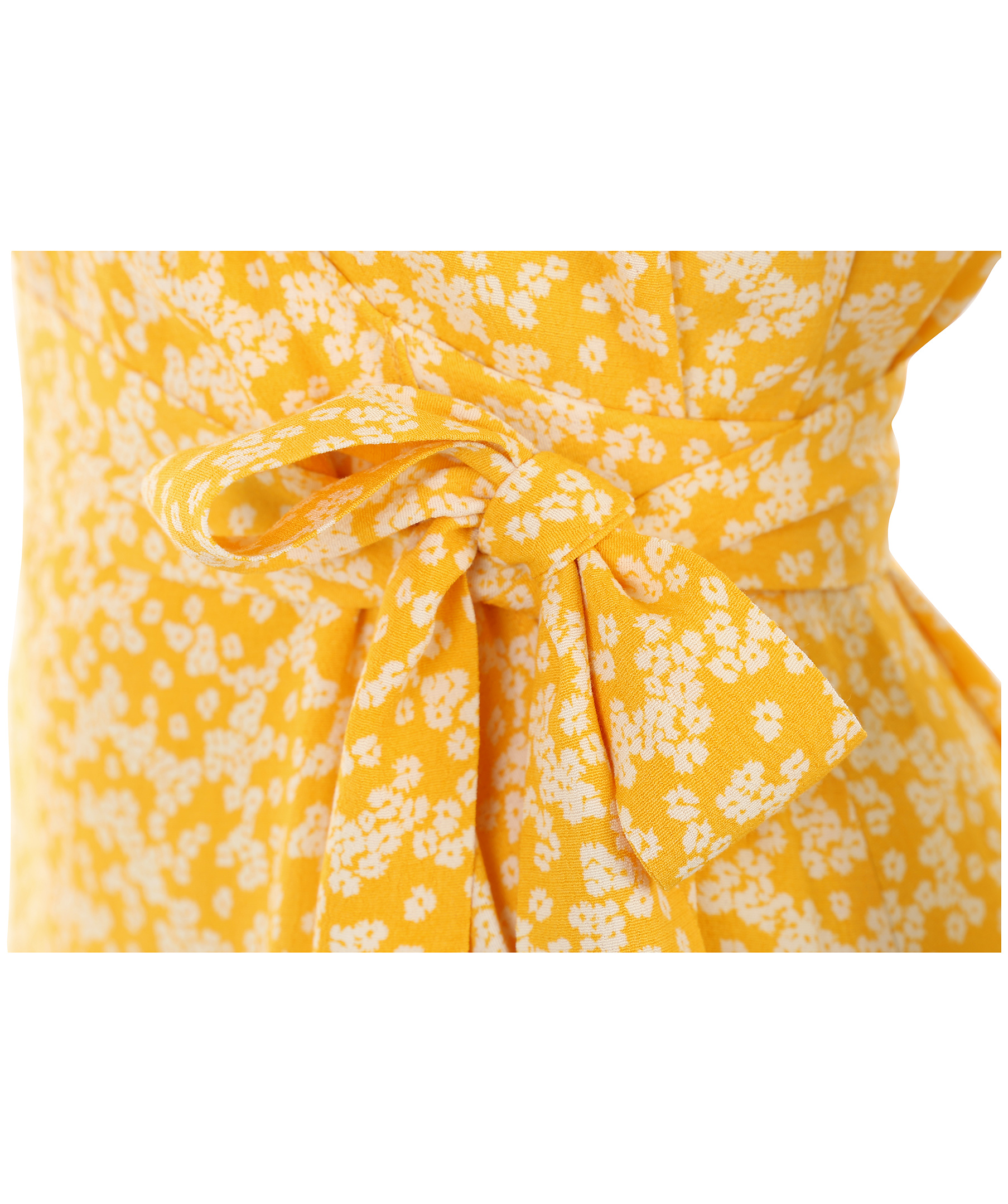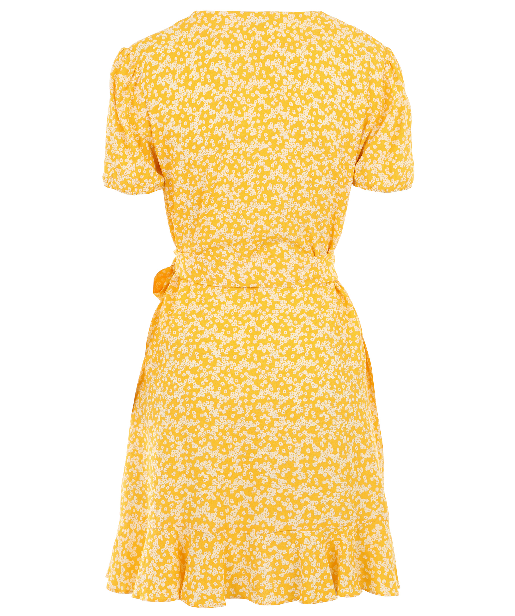 Gul/vit blommig omlottklänning från Samsoe & Samsoe. V-ringning, korta ärmar samt volangdetaljer.